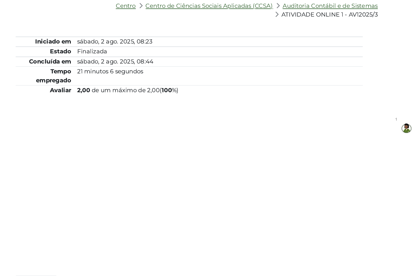Centro 〉 Centro de Ciências Sociais Aplicadas (CCSA) 〉 Auditoria Contábil e de Sistemas 〉 ATIVIDADE ONLINE 1 - AV12025/3 Iniciado em sábado, 2 ago. 2025, 08:23 Estado Finalizada Concluída em sábado, 2 ago. 2025, 08:44 Tempo empregado 21 minutos 6 segundos Avaliar 2,00 de um máximo de 2,00(100%) 1 https://ava.graduacaoead.unicv.edu.br/course/index.php?categoryid=267 https://ava.graduacaoead.unicv.edu.br/course/index.php?categoryid=266 https://ava.graduacaoead.unicv.edu.br/course/view.php?id=14436#section-4 Questão 1 Correto Atingiu 0,20 de 0,20 Questão 2 Correto Atingiu 0,20 de 0,20 Pedro, um auditor externo da empresa Griffing S. A. foi solicitado a prestar trabalho de auditoria com auxilio do diretor Felipe, que é seu tio de 2º grau e que também será o sócio responsável pela auditoria. De acordo com as normas relativas a pessoa do auditor, é correto afirmar como Pedro deve proceder: Escolha uma opção: a. Só deve recusar se algum órgão fidcalizador descobrir. b. O auditor não deve aceitar o trabalho pois segundo a normas de auditoria viola o requisito de independência. ✓ c. Pode aceitar o trabalho de auditoria desde que não deixe-se influenciar por seu primo na condução do trabalho. d. Deve aceitar o trabalho, pois está descrito nas normas que fica impedido de executar o trabalho de auditoria independente o auditor que tenha vínculo de parentesco de primeiro grau. e. O auditor só poderá aceitar o trabalho se assinar a declaração de independência expondo que possui parentesco com membro da administração da empresa auditada. A auditoria que faz o exame dos registros e documentos e na coleta de informações e confirmações, mediante procedimentos específicos, pertinentes ao controle do patrimônio de uma unidade, entidade ou projeto é: Escolha uma opção: a. Financeira b. Extraordinária c. Contábil ✓ d. Operacional e. De avaliação de gestão 1 Questão 3 Correto Atingiu 0,20 de 0,20 A origem da auditoria está relacionado ao desenvolvimento dos negócios e mercados, apresentada pelos autores de diferentes formas. Assinale a alternativa correta da origem e evolução da auditoria: Escolha uma opção: a. O desenvolvimento econômico não tem relação com a origem da auditoria. b. Na Europa, a auditoria surgiu no séc. XIV. c. A profissão da auditoria está associado o crescimento dos negócios e revolução industrial. ✓ d. O sistema capitalista influenciou fortemente na origem da auditoria durante o séc. XX. e. A auditoria surgiu com a legalização do Conselho Regional de Contabilidade 1 Questão 4 Correto Atingiu 0,20 de 0,20 Com relação aos conceitos gerais, a auditoria pode ser interna ou externa, de acordo com os conceitos e correto afirmar que: Escolha uma opção: a. Na auditoria interna o auditor não possui vínculo com a empresa auditada e a auditoria externa surgiu da necessidade de verificar normas e procedimentos dentro da empresa a serem executados. b. A auditoria interna é executada por profissional independente e a auditoria externa visa dar credibilidade as demonstrações financeiras examinadas. c. A auditoria interna são procedimentos utilizados para verificar os controles internos e eficiência e eficácia operacional enquanto que a auditoria externa é realizada por auditores externos a empresa com objetivo de dar credibilidade as demonstrações contábeis. ✓ d. O objetivo da auditoria interna é emitir opinião sobre as demonstrações contábeis, assim como na auditoria externa. e. A auditoria interna são procedimentos utilizados para verificar os controles internos e eficiência e eficácia operacional enquanto que a auditoria externa é realizada por auditores externos a empresa com objetivo também de verificar a eficiência e eficácia operacional. 1 Questão 5 Correto Atingiu 0,20 de 0,20 Questão 6 Correto Atingiu 0,20 de 0,20 As normas de auditoria são regras ditadas pelos órgãos que regulam a auditoria, estabelece orientações e diretrizes para o auditor. Qual característica a seguir se refere as normas: Escolha uma opção: a. Auxilia no controle de qualidade e descreve as tarefas realizadas pelo auditor. b. É descrita de forma genérica e não pode ser alterada conforme necessidade de trabalho específico. c. Refere-se à caráter, atitutes e toda ação a ser praticada. d. Trata à respeito das medidas de qualidade na aplicação do trabaho de auditoria. ✓ e. Trata à respeito das medidas de qualidade e como será a aplicação dos testes de campo. O auditor no desempenho da auditoria pode ser responsabilizado de forma legal pela atuação do seu trabalho. Assinale a situação correta referente a responsabilidade legal: Escolha uma opção: a. O auditor no desempenho de suas funções não pode ser responsabilizado por danos a terceiros. b. A auditoria, tanto interna quanto externa não é privativa dos contadores. c. O trabalho de auditoria ocorre de forma independente e não existe responsabilidade do trabalho com auditor para com a sociedade e os dirigentes da empresa. d. Se o auditor negligenciar a aplicação das normas de auditoria ou não aplicar de maneira conveniente e por conta disso não detectar fraude relevante deve ser responsabilizado. ✓ e. Mesmo se o auditor não executar cuidadosamente o seu trabalho ou guardar sigilo sobre as informações obtidas não responde legalmente perante o cliente, 1 Questão 7 Correto Atingiu 0,20 de 0,20 Questão 8 Correto Atingiu 0,20 de 0,20 As Normas Brasileiras de Contabilidade (NBC) se estruturam em profissionais e técnicas. Qual das alternativas a seguir apresentam somente normas profissionais: Escolha uma opção: a. NBC PG – Geral, NBC TA – de Auditoria Independente de Informação Contábil Histórica, NBC PI – do auditor interno e NBC PP – do perito. b. NBC PG – Geral, NBC PA – do auditor independente, NBC PI – do auditor interno e NBC TP – do perito. c. NBC PG – Geral, NBC PA – do auditor independente, NB