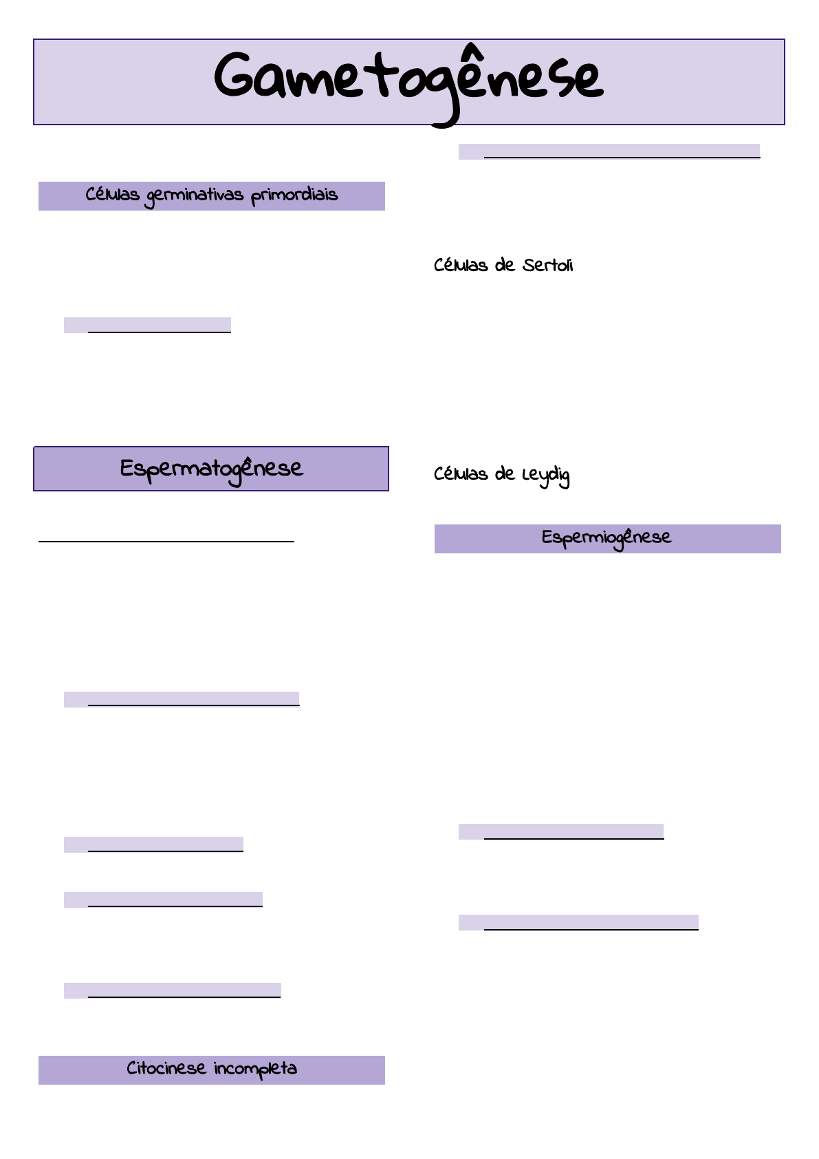 Gametogênese Conversão de células germinativas primordiais em gametas masculinos e femininos maduros e funcionais Células germinativas primordiais →São formadas no epiblasto (2º semana de gestação) →Movem-se para o saco vitelino →Migram do saco vitelino para as gônadas em desenvolvimento (4º e 5º semanas de gestação) →Futuramente darão início aos gametas ● Gametogênese inclui: →Meiose: reduz o número de cromossomos →Citodiferenciação: completa a maturação do gameta ● Masculina: espermatogênese ● Feminina: ovogênese / ovogênese Espermatogênese Espermatogônias são transformadas em espermatozóides Na fase pré-puberal (por volta de 8 anos): - Cordões sexuais adquirem luz - reorganização celular (formam túbulos seminíferos) - Células germinativas primordiais originam células tronco (espermatogônias tipo A escura) Início da espermatogênese (puberdade) Células tronco formam espermatogônias tipo A claras ● Espermatogônias tipo A (claras) →Sofrem número limitado de mitoses →Formam clones de células que se dividem →Sua última divisão mitótica produz espermatogônias (tipo B) Por isso o número de espermatozóides é grande e as reproduções contínuas ● Espermatogônia tipo B: →Forma espermatócitos primários (divisão mitótica) ● Espermatócitos primários: →Entram em prófase prolongada (por 22 dias) →Segue-se a conclusão rápida da meiose I →Formam-se espermatócitos secundários (haploides) ● Espermatócitos secundários: →Segunda divisão meiótica →Formam espermátides (ou espermatídeos) haplóides Citocinese incompleta →Das espermatogônias tipo A (claras) as espermátides →Gerações celulares unidas por pontes citoplasmáticas ● Progênie de espermatogônia tipo A (clara) →Forma clone de células que mantém contato durante toda a diferenciação →Encravadas nos recessos profundos das células de Sertoli Células de Sertoli →Protegem, sustentam, e nutrem as células germinativas →Formam uma barreira hematotesticular (junções oclusivas entre as células de Sertoli) →Auxiliam na liberação dos espermatozóides maduros →Formam o fluido testicular (auxilia no transporte dos espermatozóides) →Fagocitam corpos residuais das espermátides →Não produzem hormônios Células de Leydig →Células intersticiais que secretam testosterona Espermiogênese Processo de citodiferenciação que transforma espermátides em espermatozóides A citodiferenciação inclui: 1. Organela sacular em forma de capuz (cobre metade da superfície do núcleo) 2. Contém enzimas digestivas )facilitam a penetração do espermatozóide durante a fecundação) 3. Condensação do núcleo 4. Formação da cauda (peças: intermediária, principal e terminal) 5. Perda da maior parte do citoplasma (corpos residuais) ● Espermatozóides formados →Entram na luz dos túbulos seminíferos →São empurrados em direção ao epidídimo →Adquirem mobilidade total no epidídimo ● Transporte dos espermatozóides →São transportados do epidídimo até a uretra (contrações peristálticas do ducto deferente) →São adicionadas secreções das glândulas seminais e próstata¹ →Espermatozóides passam pelo canal cervical (lentamente pelo movimento de suas caudas) →Prostaglandinas2 do esperma estimulam motilidade uterina (facilitando o movimento dos espermatozóides) - facilitam a entrada dos espermatozóides no útero 1: secreção das glândulas bulbouretrais faz assepsia da uretra 2: ácidos graxos hidrolisados não saturados secretados pelas glândulas seminais; possuem ação local →Enzima vesiculase das glândulas seminais: 1. Coagula pequena quantidade de esperma 2. Forma tampão vaginal 3. Impede o retorno do esperma do canal cervical para a vagina →Modificações do muco cervical na ovulação: 1. Aumenta em quantidade 2. Fica menos viscoso 3. Torna mais fácil o transporte dos espermatozóides ● Movimento dos espermatozóides →Lento (no ambiente ácido da vagina) →Rápido (no ambiente alcalino do útero) →Velocidade de 2 a 3 mm/min →Volume ejaculado: 2 a 6 ml →Número de espermatozóides ejaculados: 200 a 600 milhões →Número de espermatozóides no sítio de fecundação: 200 (a maioria degenera-se na passagem pelo trato genital femino) ● Capacitação dos espermatozóides →Ocorre no útero e na tuba uterina →Período descondicionamento (duração de cerca de 3 horas) →Remoção da cobertura glicoproteica e proteínas seminais na superfície do acrossomo →Espermatozóides capacitados: não apresentam mudanças morfológicas (porém não mais ativos) Ovogênese ou oogênese →Sequência de eventos que transformam ovogônias em ovócitos →Processo de maturação: - Inicia-se durante o período fetal - Completa-se após a puberdade →Durante a vida fetal inicial: - Ovócitos primordiais (ovogônias): ➔ Proliferam por mitose ➔ Crescem formando ovócitos primários Observação: ➔ Ovário de menina recém nascida = cerca de 2 milhões de ovócitos primários (grande parte regride durante a infância) ➔ Ovário de adolescente = cerca de 40 mil ➔ Ovários maduros e expelidos na ovulação = cerca de 400 ovócitos primários ● Ovócitos primários →Iniciam a primeira divisão meiótica (antes do nascimento) →Permanecem em prófase até a adolescência →Completam a primeira divisão meiótica imediatamente antes de cada ovulação →Forma-se o ovócito secundário →Divisão desigual do citoplasma na meiose formando: 1. Ovócito secundário (recebe quase todo o citoplasma, é grande e visível a olho nu) 2. Primeiro corpo polar (pouco citoplasma; degenera logo após a ovulação) Óvulo = fecundação do ovócito II (fase curta) ● Ovulação →Ovócito secundário inicia a segunda divisão meiótica e estaciona em metáfase Observação: a segunda divisão meiótica completa-se quando um espermatozóide penetra o ovócito secundário, formando-se ta