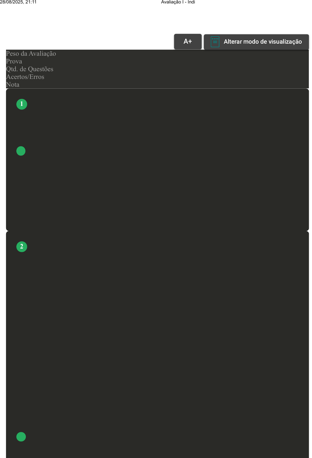 Prova Impressa GABARITO | Avaliação I - Individual (Cod.:1522180) Peso da Avaliação 2,00 Prova 104220089 Qtd. de Questões 10 Acertos/Erros 10/0 Nota 10,00 A diversidade humana deveria ser um instrumento de unificação dos indivíduos, diferentemente das desigualdades sociais. Sem diversidade não há estímulos para pensar diferente, não há estímulos para pensar no princípio da equidade. Portanto, pensar diferente é o caminho para viver e compreender o sentimento solidário que devemos ter. Considerando o princípio da equidade, assinale a alternativa CORRETA: A Somos únicos como indivíduos, e por isso somos diferentes, mas somos iguais como seres humanos. B Somos iguais, idênticos, pois pertencemos à mesma espécie. C Somo únicos como indivíduos, mas pertencemos à mesma espécie, a espécie humana. No entanto, há seres humanos "superiores" ou "inferiores". D Somos iguais como indivíduos, pois somos iguais como seres humanos. A isso se dá o nome de equidade. Conforme previsto nos Parâmetros Curriculares Nacionais (PCN), o estudo das diferentes culturas deve contribuir para a formação de uma nova mentalidade, em que toda forma de discriminação e exclusão seja superada, proporcionando ao povo brasileiro uma vivência plena de sua cidadania (BRASIL, 1997, p.13). Sob a perspectiva dos PCNs, com relação ao conhecimento cultural, classifique V para as sentenças verdadeiras e F para as falsas: ( ) Conhecer diferentes culturas é irrelevante para o aprendizado da história brasileira, pois a cultura em nosso país é homogênea. ( ) É preciso evitar o etnocentrismo, para favorecer o reconhecimento e a convivência harmônica com as diferentes culturas. ( ) Estudar a história e a cultura afro-brasileira e indígena é uma forma de reconhecer nossa história e respeitar a diversidade cultural do país. ( ) É necessário ampliar o conhecimento cultural, com o propósito de banir aspectos de enxergar apenas a sua cultura específica. Assinale a alternativa que apresenta a sequência CORRETA: FONTE: BRASIL. Secretaria de Educação Fundamental. Parâmetros Curriculares Nacionais: Apresentação dos Temas Transversais e Ética. Brasília: MEC/SEF, 1997. A V - V - V - F. B F - V - F - V. C F - V - V - V. D VOLTAR A+ Alterar modo de visualização 1 2 28/08/2025, 21:11 Avaliação I - Individual about:blank 1/5 V - F - V - F. No multiculturalismo ocorre o reconhecimento das diferenças, as quais coexistem em um mesmo país ou região. A convivência entre povos com diferentes culturas, valores e tradições contribuem para o diálogo e para uma vida pacífica entre as diversas culturas. Sobre o multiculturalismo, analise as sentenças a seguir: I- O movimento multiculturalista surgiu em grande escala nas sociedades em que o direito à diversidade cultural foi historicamente negado, por exemplo, no Estados Unidos. II- O termo multiculturalismo é antigo, sua utilização ocorreu pela primeira vez na Inglaterra, no século VII. III- O Direito à Diferença e a Diminuição das Desigualdades são temas centrais para o multiculturalismo. IV- O processo de colonização do Brasil e EUA favoreceu o multiculturalismo, pois houve opressão das tribos indígenas que ali estavam. Assinale a alternativa CORRETA: A As sentenças II, III e IV estão corretas. B Somente a sentença I está correta. C As sentenças I e III estão corretas. D As sentenças II e IV estão corretas. O surgimento dos estudos atuais sobre a condição feminina e o estudo de gênero só foi possível porque, ao longo do tempo, o movimento social de mulheres tem denunciado as situações de opressão, preconceito e dominação. Se hoje o gênero representa uma categoria de análise tão importante para as ciências humanas e sociais, é porque se fez legítimo pelas tantas batalhas dos movimentos feministas, tornando-se fundamental para a compreensão das relações humanas. O feminismo é um conceito múltiplo, possuindo uma dimensão política e uma dimensão acadêmica. Sobre o feminismo, classifique V para as sentenças verdadeiras e F para as falsas: ( ) A dimensão acadêmica do feminismo é multidisciplinar, incluindo Antropologia, História, Educação, Sociologia e Direito. ( ) O principal objetivo do movimento feminista não foi alcançar a igualdade entre homens e mulheres, mas sim a equidade entre eles. ( ) O feminismo possui uma dimensão política, que se refere aos movimentos de luta por direitos. ( ) O Movimento Feminista surgiu no século XX, nos Estados Unidos, e foi dividido em três grandes momentos, as chamadas ondas femininas. Assinale a alternativa que apresenta a sequência CORRETA: A V - V - V - F. B V - V - V - V. C V - V - F - V. 3 4 28/08/2025, 21:11 Avaliação I - Individual about:blank 2/5 D F - F - V - V. Atualmente, enfrentamos desafios éticos que decorrem da diversidade cultural das sociedades contemporâneas, do consumismo, do individualismo, do desprezo ao próximo e à natureza, gerando um quadro de crise que tem sérias implicações sobre a ética, valores e responsabilidade social. Sobre o exposto, classifique V para as sentenças verdadeiras e F para as falsas: ( ) Podemos notar diferentes aspectos nesta crise: agravamento da desigualdade social, crise no sistema de trabalho e crise ecológica. ( ) Vivemos atualmente uma crise ecológica sem precedentes. Com os níveis de consumo atuais, esgotaremos os recursos naturais, o que favorece a sustentabilidade. ( ) A desigualdade hoje se mostra tão grande que pode até levar à desumanização dos indivíduos. ( ) A crise atual e suas implicações são de inteira responsabilidade da iniciativa privada, pois ela é fundamental no desenvolvimento do país. Assinale a alternativa que apresenta a sequência CORRETA: A F - F - V - V. B V - F - V - F. C V - V - F - V. D V - V - V - F. É amplamente reconhecida a importância de promover e proteger a memória e as manifestações culturais representadas, em todo o mundo, por mon