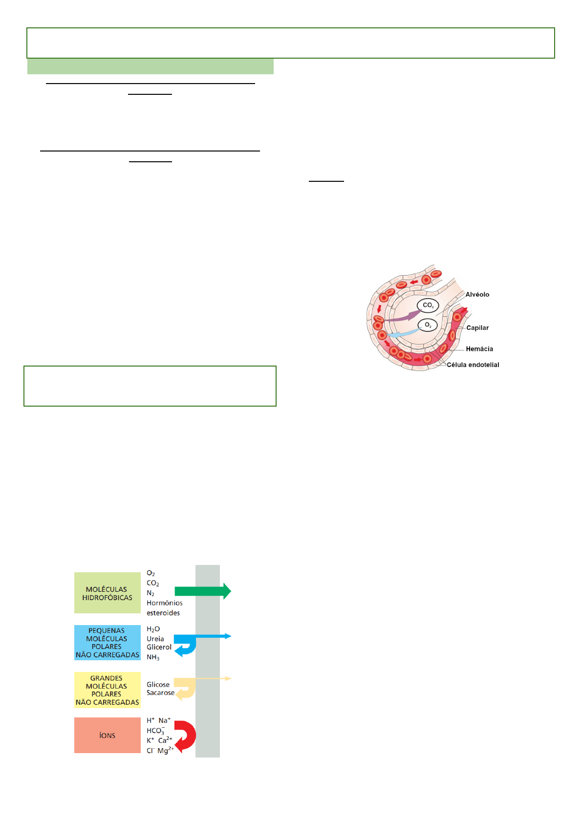 Mecanism� d� transport� pel� membran� plasmátic� Permeabilidad� d� bicamad� lipídic� Permeabilidade - controle físico (depende do tamanho) Moléculas grandes: não atravessam a membrana - macromoléculas (proteínas, polissacarídeos, ácido nucleico DNA/RNA) Permeabilidade - controle químico (depende da natureza) Gases: transporte completo através da membrana (ocorre por meio da difusão) - distribuição adequada dos gases Moléculas hidrofóbicas (ex: hormônio esteróide): transporte completo através da membrana Moléculas polares pequenas (ex: água e etanol): transporte incompleto pela bicamada →Obs: os fosfolipídios que aumentam a fluidez (aqueles de cauda curta e insaturados) da bicamada permitem maior passagem de água pela membrana →Obs: a água não tem total permeabilidade como os gases, necessitando de canais para que a célula absorva a quantidade necessária desse líquido A água não tem grande permeabilidade por conta da cauda hidrofóbica dos fosfolipídios, o que dificulta a passagem desse líquido Moléculas polares grandes (ex: glicose): ausência de transporte pela bicamada. Essas moléculas precisam de canais que realizam essa passagem Aminoácidos: ausência de transporte pela bicamada Moléculas carregadas (H+, Na+): ausência de transporte pela bicamada. Essas moléculas regulam a atividade homeostática da célula, o que deve ser controlada evitando desequilíbrios, por isso precisam de proteínas que regulam a entrada e a saída dessas moléculas →Obs: a bicamada lipídica é eletricamente isolante Três principais características das moléculas a serem transportadas e que determinam a sua permeabilidade da membrana 1. Polaridade (hidrofóbico x hidrofílico) 2. Carga (“carregado” x “descarregado”) 3. Tamanho (pequeno x grande) Permeabilidade relativa de uma bicamada lipídica está associada a diferentes classes de moléculas. Quanto menor a molécula e quanto menor a associação dela com a água, mais rápido a molécula difunde-se através da bicamada Difusão - Segue o gradiente de concentração - Processo não seletivo ou de interação fraca - Gases, moléculas hidrofóbicas e moléculas polares pequenas (mas não carregadas) Difusão passiva nos alvéolos Funçã� da� proteína� n� membran� Complexos proteicos que auxiliam no transporte de moléculas pela bicamada de fosfolipídios Proteína� d� cana� Complexos proteicos que seletivamente permitem a passagem de determinadas moléculas pela membrana por meio de poros →proteínas que não sofrem alterações conformacionais durante o transporte →formam poros seletivos (hidrofílicos) - permitem a passagem de solutos específicos →apresenta íons que regulam sua abertura e fechamento (Ca2+ e Mg2+ fecham canais da membrana, diminuindo sua permeabilidade) →apresenta uma interação fraca com os solutos Esses complexos formam poros contínuos que atravessam a bicamada lipídica. Quando abertos, permitem a passagem de solutos específicos (como íons inorgânicos de tamanho e carga adequados e, em alguns casos, de pequenas moléculas como água, glicerol e amônia) através da membrana. Esses canais podem ser abertos ou fechados de acordo com a necessidade da célula A energia responsável por fechar ou abrir os canais - Ligantes específicos - Controlado por voltagem - Controlado por ligante intracelular ou extracelular - Controlado mecanicamente pelo citoesqueleto Proteína� transportadora� Complexo proteico que apresenta uma mudança conformacional da proteína permitindo o transporte de moléculas específicas (ligam-se a solutos específicos) →são proteínas que sofrem alterações conformacionais durante o transporte de solutos →essas proteínas são chamadas de bombas ou permeases →interagem fortemente com o soluto a ser transportado Essas proteínas se ligam ao soluto específico que vai ser transportado e sofrem uma série de alterações de conformação que levam à exposição alternada dos sítios de ligação ao soluto em um dos lados da membrana e, a seguir, no outro lado, para transferir o soluto através desta Em alguns casos a alteração na conformação se dá pela fosforilação: um fosfato do ATP é liberado e se liga a proteína transportadora alterando seu formato, o que permite que exista o transporte de cálcio. A fosforilação pode ser inibitória ou ativadora das proteínas transportadoras Proteína� transportadora� � proteína� d� cana� Uma proteína transportadora alterna entre duas conformações, de tal forma que o sítio de ligação ao soluto sequencialmente é acessível em um lado da bicamada e então no outro. Em contraste, uma proteína de canal forma um poro através da bicamada para poder difundir solutos específicos de forma passiva Moviment� mediad� por transportadore� Transportador uniporte: transporte de apenas uma molécula Transporte acoplado: transporta moléculas diferentes com diferentes gradientes de concentração; um soluto é dependente do transporte de um outro 1. simporte: transporte de duas moléculas no mesmo sentido 2. antiporte: transporte de duas moléculas no sentido contrário �p� d� transport� 1. Transporte passivo →ocorre a favor do gradiente de concentração →vai do meio mais concentrado (hipertônico) para o meio menos concentrado (hipotônico) →processo espontâneo, não consome energia Difusão simples: o transporte de moléculas (soluto) ocorre através da bicamada lipídica Difusão facilitada: o transporte de moléculas (soluto) ocorre através de proteínas Osmose: transporte de solvente por meio da bicamada lipídica →ocorre do meio menos concentrado (hipotônico) para o mais concentrado (hipertônico) Obs: Apesar da água se difundir através da bicamada, a velocidade de difusão é inferior à velocidade de demanda. Assim, todas as células contém proteínas de canal específicas denominadas aquaporinas, que facilitam es