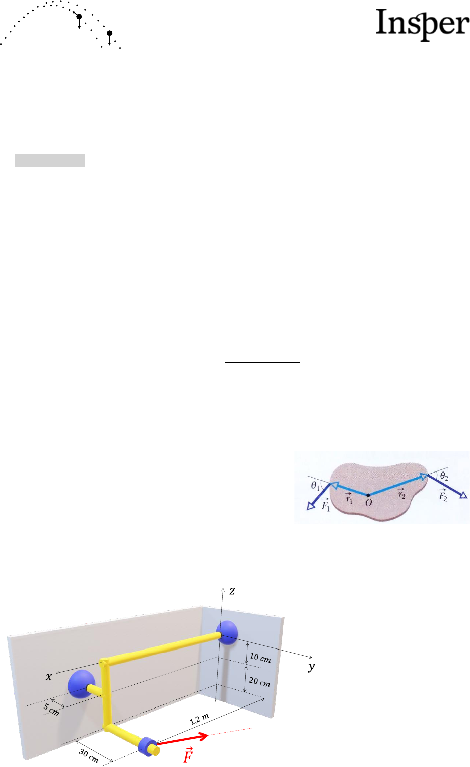 Física do Movimento Orientação de Estudos 3 - Aulas 13 a 17 da apostila Aula 13 - Leitura Teórica Sugerida Leitura básica: • (Torque) HALLIDAY & RESNICK - Volume 1 - Capítulo 10, seção 10-8 Aula 13 - Lista de Exercícios Exercício 1 Calcule: a) O produto vetorial �⃗� × �⃗⃗�, sendo �⃗� = 3𝑖̂ + 4𝑗 ̂e �⃗⃗� = 2𝑖̂ − 1𝑗;̂ b) O produto vetorial 𝑑 × 𝑒, sendo 𝑑 = 10𝑖̂ + 2𝑗̂ − 3�̂� e 𝑒 = −5𝑖̂ + 3𝑗̂ + 7�̂�; c) O módulo do vetor 𝑑 × 𝑒 do item b; d) O ângulo entre os vetores 𝑑 e 𝑒 do item b. Use o produto escalar para calcular esse ângulo e confirme se seu seno é igual a |𝑑 × 𝑒|/(|𝑑| ⋅ |𝑒|); e) Mostre que 𝑟 = 4,33𝑖̂ + 2,5𝑗 ̂e 𝑠 = −3,5𝑖̂ + 6,062𝑗 ̂são vetores perpendiculares entre si; Exercício 2 (adaptado de Halliday&Resnick, sessão 10-8, ex. 45, p. 279) O corpo da figura pode girar em torno de um eixo perpendicular ao papel passando por O e está submetido a duas forças, como mostra a figura. Se 𝑟1 = 1,30𝑚, 𝑟2 = 2,15𝑚, 𝐹1 = 4,20𝑁, 𝐹2 = 4,90𝑁, 𝜃1 = 75° e 𝜃2 = 60°, qual o vetor torque resultante em relação ao eixo O? Suponha que versor 𝑖 ̂seja horizontal para a direita e 𝑗 ̂vertical para cima. Exercício 3 (Diagnóstico 2 – 2022-2) Uma peça está sendo desenhada para estabilizar a vibração de uma desempenadeira elétrica, por meio de um cabo de aço esticado. A figura a seguir ilustra uma perspectiva da peça, sendo �⃗� a força de tração que será aplicada no ponto 𝐶, por meio do cabo. A peça é fixa por dois apoios que foram projetados da seguinte maneira: A B C Física do Movimento • Apoio 𝐴: não permite a translação em 𝑥, 𝑦 e 𝑧, e também não permite a rotação em 𝑥, mas permite a rotação em 𝑦 e em 𝑧; • Apoio 𝐵: não permite a translação em 𝑥 e 𝑧, mas permite a rotação em todas as direções. Esse apoio foi projetado para não ter nenhuma reação em 𝑦. A origem do sistema de coordenadas coincide com o ponto A e o vetor força de tração é dado por: �⃗� = −2.000𝑖̂ − 1.000�̂� [𝑁] Sabendo que o peso da peça é desprezível, calcule o vetor torque da força �⃗� em relação ao ponto 𝐴. Física do Movimento Aula 13 - Respostas 1. a) −11 �̂� b) 23𝑖̂ − 55𝑗̂ + 40�̂� c) |𝑑 × 𝑒| = 71,79 d) 132,16°. Sim, o seno desse ângulo é igual à razão |𝑑 × 𝑒|/(|𝑑| ⋅ |𝑒|). e) |𝑟×𝑠| |𝑟|⋅|𝑠| = 1, portanto, o ângulo entre eles é 90° 2. −3,85�̂� [𝑁 ⋅ 𝑚] 3. 𝜏𝐴 𝐹 = −300𝑖̂ + 1800𝑗̂ + 600�̂� [𝑁 ⋅ 𝑚] Física do Movimento Aulas 14 a 17 - Leitura Teórica Sugerida Leitura básica: • (Equilíbrio estático e tipos de apoios em 2D) BEER, JOHNSTON & EISENBERG - Estática - Capítulo 4, seções 4.3 e 4.4 • (Dinâmica da rotação) HALLIDAY & RESNICK - Volume 1 - Capítulo 10, seção 10-9 Leitura complementar: • (Equilíbrio estático e tipos de apoios em 3D) BEER, JOHNSTON & EISENBERG - Estática - Capítulo 4, seções 4.8 e 4.9 • (Dinâmica da rotação) NUSSENZVEIG – Volume 1 - Capítulo 12, seção 12.3 Aulas 14 a 17 - Lista de Exercícios Exercício 1 (adaptado de Beer-Johnston 2013) Uma viga está presa à parede por um pino em A e sustentada, em repouso, por uma barra em B, presa à parede no ponto C, conforme a figura. Na viga, é aplicado um torque de 900 𝑁 ⋅ 𝑚 na direção e sentido de −�̂�, conforme a figura. Determine as reações do pino na viga, em A, e do apoio na viga, em B. Adote 𝑖 ̂horizontal para a direita e 𝑗 ̂vertical para cima. Exercício 2 (APS7 – 2018-2) Um carro de 1.000 𝑘𝑔 está parado em uma rampa de inclinação 20°. A distância entre os eixos das rodas é de 1,4 𝑚, e o centro de massa está localizado a 0,6 𝑚 do eixo traseiro e a 0,2 𝑚 do piso, conforme a figura. Supondo que ele esteja com os freios acionados apenas nas rodas traseiras, estando as rodas dianteiras livres, responda as questões que seguem, adotando 𝑔 = 10 𝑚/𝑠2. a) Considerando que o raio das rodas é 30 𝑐𝑚, qual é o torque que a força de atrito causa em cada uma das rodas traseiras? b) Escreva as três equações do equilíbrio do carro no sistema de coordenadas normal-tangente em função das intensidades das forças que atuam sobre o veículo. Use os símbolos �⃗⃗⃗�𝑑 e �⃗⃗⃗�𝑡 para as forças normais em cada uma das rodas dianteira e traseira, respectivamente. Para a equação do torque, adote como eixo de rotação o ponto de contato da roda traseira com o chão. c) Calcule a intensidade das forças normais �⃗⃗⃗�𝑑 e �⃗⃗⃗�𝑡 em cada uma das rodas. Lembre-se que o carro possui 2 rodas traseiras e 2 dianteiras. d) Se o ângulo de inclinação da rampa aumentasse, o que aconteceria com as forças normais nas rodas dianteiras e traseiras? Elas se manteriam constantes, aumentariam ou diminuiriam? 20° Física do Movimento Exercício 3 Uma viga de metal de 2 metros de comprimento e 1.000N de peso está apoiada em suas extremidades por um pino e por um rolete, como ilustra a figura ao lado. Exatamente no seu centro de massa (𝑪𝑴), por meio de um eixo acoplado a um motor elétrico, é aplicado um torque 𝝉 no sentido indicado na figura. Responda aos itens que seguem. a) Quais as equações de equilíbrio da viga? b) Esboce os gráficos das reações verticais, 𝐴𝑦 e 𝐵𝑦 , em função da intensidade do torque 𝝉 aplicado no centro de massa da viga. c) Qual a intensidade do torque 𝝉 para que 𝐵𝑦 seja nula? d) Supondo que o motor elétrico, em vez de ser acoplado ao centro de massa da viga, seja acoplado no ponto A, quais os gráficos das reações verticais 𝐴𝑦 e 𝐵𝑦 em função da intensidade desse torque (𝝉)? e) O torque 𝝉 aplicado no centro de massa se “propaga” ao longo d