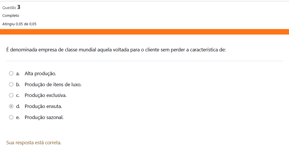 Questão 3 Completo Atingiu 0,05 de 0,05 É denominada empresa de classe mundial aquela voltada para O cliente sem perder a característica de: a. Alta produção. b. Produção de itens de luxo. C. Produção exclusiva. d. Produção enxuta. e. Produção sazonal. Sua resposta está correta.