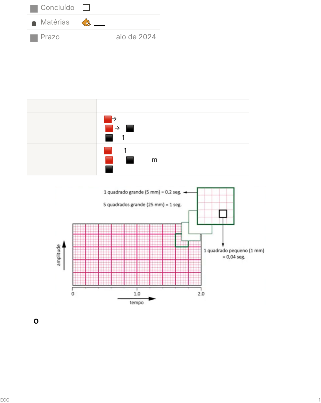 ECG Concluído Matérias RPI Prazo ECG normal Noções Básicas de ECG VELOCIDADE 25mm/s EIXO X 1 🟥 0,04s 5 🟥 1 ⬛ 0,2s 5 ⬛ 1s EIXO Y 1 🟥 0,1 mV 5 🟥 1 ⬛ 0,5mV 2 ⬛ 1mV Noções Práticas de Vetores Há 3 eletrodos exploradores 22 de maio de 2024 ECG 1 https://www.notion.so/RPI-18cf155021e78122bf52ca073d3975e1?pvs=21 https://www.notion.so/RPI-18cf155021e78122bf52ca073d3975e1?pvs=21 Quando a onda de despolarização se aproxima do eletrodo Quando a onda de despolarização se afasta do eletrodo Paredes DERIVAÇÕES Derivações Contíguas Frontais= Olham a mesma parede DI/aVL parede ESQUERDA DII/DIII/aVF parede INFERIOR aVF parede DIREITA Condução Elétrica Inicia no NÓ SINUSAL com a DESPOLARIZAÇÃO ATRIAL Frequência: 50100 bpm Despolarização: AD (átrio direito) AE (átrio esquerdo) → se aproximando do eletrodo explorador ECG Onda P Despolarização Atrial no NÓ ATRIOVENTRICULAR AV Propriedade decremental do nó AV segura o impulso elétrico por alguns ms para permitir a finalização da contração atrial para só ECG 2 ⇒ DESPOLARIZAÇÃO VENTRICULAR Nó AV SEPTO INTERVENTRICULAR Vetor resultante: para direita e para baixo → se afasta do eletrodo explorador ECG onda Q Despolarização ventricular: Repolarização atrial) Paredes livres dos ventrículos → Parede basais dos ventrículos Vetor resultante: para cima e para direita se afasta do eletrodo exploratório ECG onda S depois o ventrículo contrair ECG intervalo PR Despolarização ventricular: Septo interventricular → PAREDES livres dos VENTRÍCULOS Vetor resultante: para direita e para baixo → se aproxima do eletrodo explorador ECG onda R ⇒ REPOLARIZAÇÃO VENTRICULAR ECG onda T Segue a mesma polaridade do complexo QRS ECG 3 REPOLARIZAÇÃO ATRIAL Acontece ao mesmo tempo em que os ventrículos se contraem Fenômeno não visível no ECG pois os fenômenos dos ventrículos acabam por “esconderˮ os fenômenos dos átrios devido a sua maior intensidade elétrica TIPOS DE COMPLEXO QRS Análise do Eletrocardiograma NORMAL ANÁLISE DA DERIVAÇÃO LONGA DII Ritmo SINUSAL Onda P em: DI, DII e aVF Onda P em: aVR Não necessariamente é um ritmo regular (distância de uma RR é a mesma) Não necessariamente precede um QRS ECG 4 Onda P DI, DII e aVF + Onda P aVR Morfologia da Onda P DII Altura 2,5mm Largura 2,5mm V1 Parte positiva 1mm Parte negativa 1mm2 Intervalo PR Normal: até 200ms (5mm) Aumentado: distúrbio/atraso da condução do impulso elétrico do átrio para o ventrículo (ex. BAV 1o GRAU Diminuído: taquicardia juncional (impulso elétrico nasce mais próximo ao ventrículo) FC Ritmos regulares: ECG 5 Regra dos 1500 FC 1500/N° de quadradinhos entre RR Ex: FC 1500/21,5 ≅ 70 bpm Regra dos 300 FC 300/No quadrados (5mm) entre RR Ex: FC 300/4 ≅ 75 bpm Ritmo Irregular FC No QRS – 1 x 6 Ex: FC 28 1 x 6 162 bpm QRS NO PLANO FRONTAL Largura do QRS Morfologia do QRS normal: ⇒ Largura 3mm 120ms) (menor que 3 🟥) Amplitude: variável Baixa voltagem se 0,5mV em todas as derivações periféricas (ex. pericardite) R onda positiva Q primeira onda negativa S onda negativa após o S R :̓ segunda deflexão para cima Critérios de sobrecarga Pesquisa de ondas “Qˮ patológicas por paredes ECG 6 Q despolarização septal ⇒ 1/3 da amplitude da onda R ⇒ Duração 0,04s 1 🟥) em duas derivações contíguas Pode significar: Pneumotórax esquerdo ou dextrocardia; Infarto do miocárdio e miocardite; Cardiomiopatia hipertrófica; BRE. Eixo elétrico Indica o vetor resultante da despolarização Eixo normal: de 30o e 90o PASSO 1 QRS em DI QRS I ou IV quadrantes PASSO 2 QRS em aVF QRS I ou II quadrantes PASSO 3 definir o quadrante DI eixo em I ou IV aVF eixo em I ou II Eixo no I quadrante PASSO 4 QRS em aVL QRS eixo entre 90o e 60o ECG 7 QRS NO PLANO HORIZONTAL V1;V2;V3;V4;V5;V6 Largura do QRS (mesmo do frontal) Critérios de sobrecarga ventricular Pesquisa de ondas “Qˮ patológicas por paredes (mesmo do frontal) Progressão das ondas R, S e razão R/S A medida que V1 vai para V6 Onda R vai AUMENTANDO e Onda S vai DIMINUINDO Acontece por causa da localização dos eletrodos V1 está mais longe do eletrodo explorador (mais -) V6 está mais perto do eletrodo explorador (mais +) ANÁLISE DE ST, T, QT E QTc Segmento ST Tempo do fim da despolarização ventricular até a repolarização ventricular NORMAL SUPRA INFRA ECG 8 Onda T Normal: Mais arredondada do que o QRS Geralmente possui o mesmo sentido do QRS (pode não seguir em DIII e V1 Altura e amplitude medindo 1/2 ou 1/3 da onda R anterior Intervalo QT Mede o início da despolarização dos ventrículos até o fim da repolarização Quanto maior o QT, maior a chance de arritmias graves ou morte súbita Intervalo QTc QTc normal: Crianças 460 ms Homens 450 ms Mulheres 470 ms QTc QT(s) / √RR(s) ECG 9 💡 LAUDANDO ECG NORMAL Ritmo sinusal, regular. Frequência cardíaca de 60100 BPM. Intervalo PR normal (até 200ms). QRS estreito 120ms) Sem critérios de sobrecarga. Sem ondas Q patológicas. Eixo elétrico entre 90o e 30o. Ausência de supradesnivelamento ou infradesnivelamento de segmento ST. Ausência de ondas T patológicas ou alteração de repolarização Intervalo QT normal. Sobrecargas ÁTRIOS D2 e V1 e VENTRÍCULOS V1 e V6 OLHAR ONDA P!! ÁTRIO ESQUERDO → ↑ALTURA 2,5mm) V1 → ↑COMPRIMENTO 2,5mm) V6 → não é para caber num quadrado ÁTRIO DIREITO → ↑COMPRIMENTO 2,5mm) V1 → ↑ALTURA 2,5mm) V6 VENTRÍCULOS V1 e V6 VENTRÍCULO DIREITO DESVIO P/DIREITA D1 e aVF V1 V6 TEM QUE TA MAIS POSITIVO DO QUE NEGATIVO VENTRÍCULO ESQUERDA ECG 10 AMPLITUDE > 30mm 6 QUADRÃOS v1 v5/v6 v2 v5/v6 PADRÃO DE STRAIN V5 e V6 Onda T apiculada com infra DESVIO DO EIXO PARA ESQUERDA QRS 100ms 2,5 quadradinhos TEP SOBRECARGA DE VENTRICULO DIREITO DPOC SOB Amiloidose Cardíaca Baixa atividade elétrica (baixa voltagem) ECG 11 🚨 PARA DEFINIR SE HÁ SOBRECARGA ATRIAL, É NECESSÁRIO OLHAR PARA AS DUAS DERIVAÇÕES DII E V1 E PREENCHER OS CRITÉRIOS