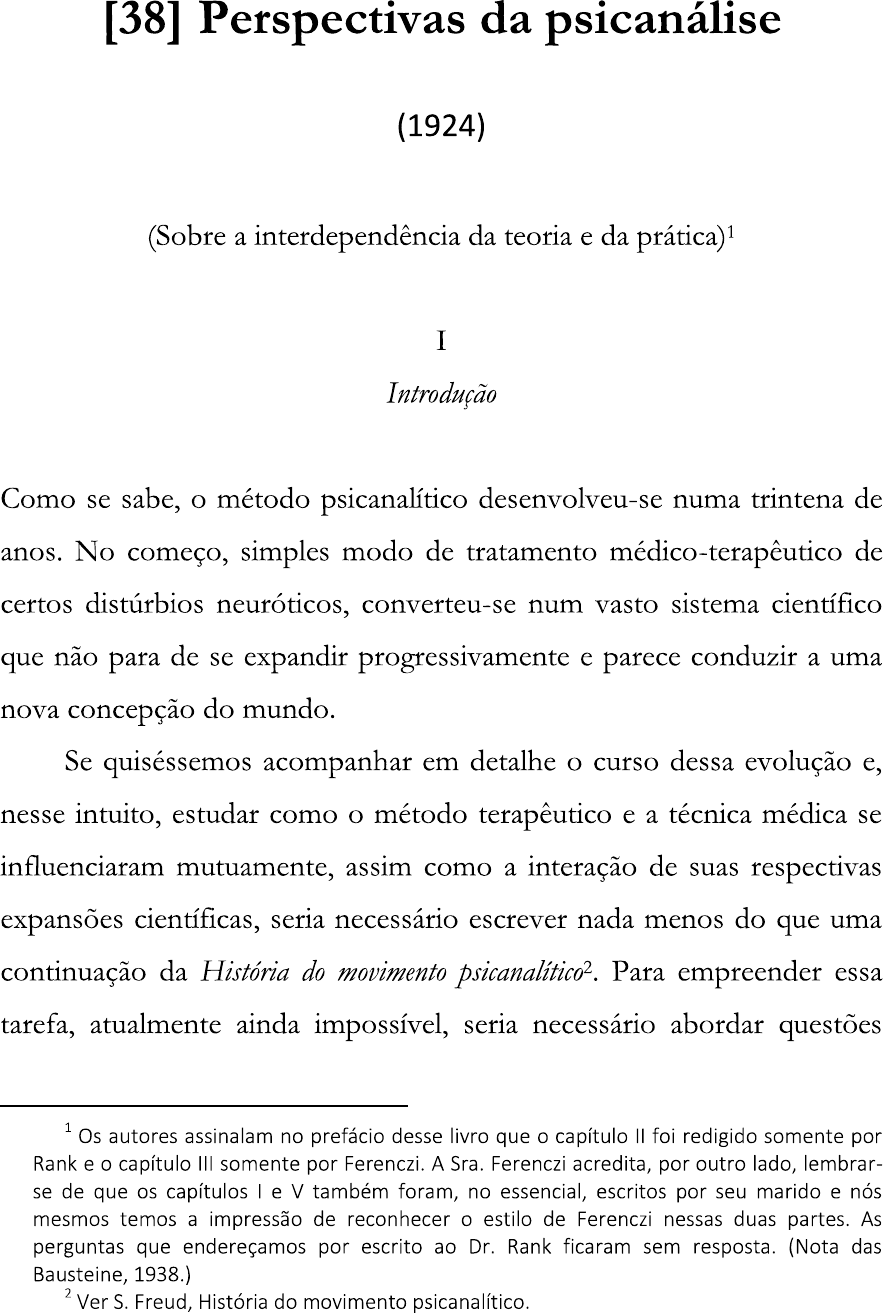 [38] Perspectivas da psicanálise (1924) (Sobre a interdependência da teoria e da prática)¹ I Introdução Como se sabe, O método psicanalítico desenvolveu-se numa trintena de anos. No começo, simples modo de tratamento médico-terapêutico de certos distúrbios neuróticos, converteu-se num vasto sistema científico que não para de se expandir progressivamente e parece conduzir a uma nova concepção do mundo. Se quiséssemos acompanhar em detalhe curso dessa evolução e, nesse intuito, estudar como método terapêutico e a técnica médica se influenciaram mutuamente, assim como a interação de suas respectivas expansões científicas, seria necessário escrever nada menos do que uma continuação da História do movimento Para empreender essa tarefa, atualmente ainda impossível, seria necessário abordar questões 1 Os autores assinalam no prefácio desse livro que capítulo foi redigido somente por Rank e capítulo III somente por Ferenczi. A Sra. Ferenczi acredita, por outro lado, lembrar- se de que os capítulos I e V também foram, no essencial, escritos por seu marido e nós mesmos temos a impressão de reconhecer 0 estilo de Ferenczi nessas duas partes. As perguntas que endereçamos por escrito ao Dr. Rank ficaram sem resposta. (Nota das Bausteine, 1938.) 2 Ver S. Freud, História do movimento psicanalítico.que ultrapassam em muito a matéria propriamente dita da psicanálise e envolvem a relação entre os fatos elaborados por uma ciência e essa mesma ciência. Se essa tarefa já é, em si, extremamente delicada, pois nos leva diretamente às questões fundamentais da nossa metodologia científica, torna-se praticamente impossível para a psicanálise, que se encontra ainda em pleno desenvolvimento. E por nossa parte temos grande dificuldade em chegar a uma visão objetiva do estado em que se encontram essas relações quando participamos pessoal e diretamente nesse processo, quando nos encontramos no seu próprio âmago como representantes dos dois grupos: O grupo e O grupo teórico-científico. De fato, não se pode negar O surgimento nestes últimos anos de uma desorientação crescente entre analistas, sobretudo no que diz respeito aos problemas técnicos apresentados pela prática. Em contraste com rápido desenvolvimento da teoria psicanalítica, também a literatura negligenciou de forma singular¹ O fator técnico-terapêutico, que, entretanto, constituiu núcleo primitivo do processo e O verdadeiro estímulo de todos avanços importantes da teoria. Poder-se-ia ficar com a impressão de que a técnica permaneceu imutável nesse meio- tempo, tanto mais que O próprio Freud, como se sabe, deu sempre provas de extrema reserva nesse domínio e não publica há uma dezena de anos nenhuma obra de ordem técnica. Para os analistas que não 1 Única exceção, as tentativas do autor com propósito de estabelecer a necessidade de uma intervenção ativa na técnica. Mas a maioria dos analistas ignorou ou interpretou mal essas tentativas, talvez porque nessa época autor, ao expor essa nova concepção, não tenha assinalado ao leitor como ela podia inscrever-se na teoria e na técnica atuais (ver, sobretudo, "Prolongamentos da técnica ativa", neste volume).tinham passado pessoalmente por uma análise, seus raros artigos técnicos (reunidos em Samml kl. Schr. Z Neurosenlebre, IV ss.) constituíram OS únicos princípios diretores de sua ação terapêutica; embora tais artigos, na opinião do próprio Freud, certamente incompletos e ultrapassados em certos pontos de vista pela evolução atual, pareçam modificados. Por isso se explica que a maior parte desses analistas, reduzidos ao estudo da literatura, esteja aferrada com excessiva rigidez a essas regras técnicas, incapaz de articulá-las com progressos registrados nesse meio-tempo pela ciência psicanalítica. Descontentes com esse estado de coisas, sentimo-nos por várias vezes obrigados a suspender O nosso trabalho a fim de avaliar essas dificuldades e esses problemas. Descobrimos então que O nosso poder técnico realizara, enquanto isso, progressos não desprezíveis cuja compreensão e apreciação plenas e conscientes permitiam ampliar de maneira bastante considerável O nosso saber. Finalmente, achamos necessário, tendo em vista a necessidade manifesta e geral de aclarar a situação, comunicar a nossa experiência, e O melhor meio parece-nos ser expor, em primeiro lugar, como praticamos hoje a psicanálise e que isso quer dizer atualmente para nós. Após O que poderemos então compreender O porquê das dificuldades que surgem hoje um pouco por toda a parte e que esperamos poder remediar. Tomamos desde já por ponto de partida último artigo técnico de Freud, "Rememoração, repetição e (1914), no qual ele atribui uma importância incomparável aos três fatores enumerados no título, a 1 Ver La Technique Psychanalyrique, trad. de Anne Berman, PUF.rememoração (Erinner) é aí considerada verdadeiro objetivo do trabalho analítico, ao passo que O desejo de repetição (Wiederbolen), em vez da rememoração, é considerado um sintoma de resistência que, como tal, cumpre evitar. Sob O ângulo da compulsão à repetição (Wiederbolungszwang) é absolutamente inevitável, porém, que O paciente repita no tratamento fragmentos inteiros de sua evolução e como a experiência mostrou precisamente fragmentos inacessíveis sob a forma de rememoração; de sorte que paciente não pode fazer outra coisa senão reproduzi-los e analista considerá-los como verdadeiro material inconsciente. Trata-se apenas de compreender essa forma de comunicação, a linguagem dos gestos, por assim dizer (Ferenczi), e de explicá-la ao paciente. Entretanto, como nos ensinou Freud, os próprios sintomas neuróticos nada mais são do que discursos deformados em que inconsciente se exprime num estilo à primeira vista incompreensível. Essas considerações fizeram ressaltar a necessidade prática, não só de não estorvar as t