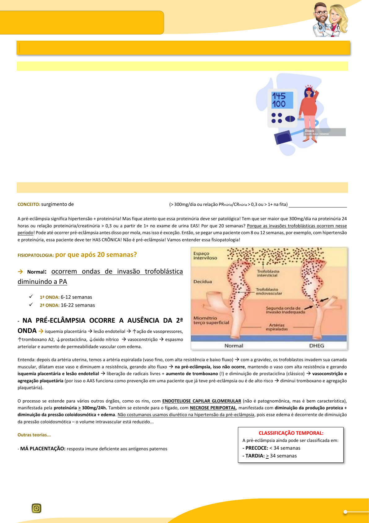 - Resumos – Abordagem Por Especialidades (2025) @casalmedresumos OBSTETRÍCIA DOENÇAS INTERCORRENTES NA GESTAÇÃO 1. DOENÇA HIPERTENSIVA ESPECÍFICA DA GRAVIDEZ Quais as possibilidades diagnósticas? (1) PRÉ-ECLÂMPSIA → HAS + proteinúria > 20 semanas (2) ECLÂMPSIA → pré-eclâmpsia + convulsões (3) HAS CRÔNICA → HAS 20 semanas Essas são as 5 possibilidades diagnósticas quando estamos diante de uma gestante hipertensa. A pré-eclâmpsia é a mais! Vamos iniciar a discussão! PRÉ-ECLÂMPSIA CONCEITO: surgimento de HIPERTENSÃO + PROTEINÚRIA (> 300mg/dia ou relação PRnúria/CRnúria > 0,3 ou > 1+ na fita) APÓS 20 SEMANAS A pré-eclâmpsia significa hipertensão + proteinúria! Mas fique atento que essa proteinúria deve ser patológica! Tem que ser maior que 300mg/dia na proteinúria 24 horas ou relação proteinúria/creatinúria > 0,3 ou a partir de 1+ no exame de urina EAS! Por que 20 semanas? Porque as invasões trofoblásticas ocorrem nesse período! Pode até ocorrer pré-eclâmpsia antes disso por mola, mas isso é exceção. Então, se pegar uma paciente com 8 ou 12 semanas, por exemplo, com hipertensão e proteinúria, essa paciente deve ter HAS CRÔNICA! Não é pré-eclâmpsia! Vamos entender essa fisiopatologia! FISIOPATOLOGIA: por que após 20 semanas? → Normal: ocorrem ondas de invasão trofoblástica diminuindo a PA ✓ 1ª ONDA: 6-12 semanas ✓ 2ª ONDA: 16-22 semanas - NA PRÉ-ECLÂMPSIA OCORRE A AUSÊNCIA DA 2ª ONDA → isquemia placentária → lesão endotelial → ↑ação de vasopressores, ↑tromboxano A2, ↓prostaciclina, ↓óxido nítrico → vasoconstrição → espasmo arteriolar e aumento de permeabilidade vascular com edema. Entenda: depois da artéria uterina, temos a artéria espiralada (vaso fino, com alta resistência e baixo fluxo) → com a gravidez, os trofoblastos invadem sua camada muscular, dilatam esse vaso e diminuem a resistência, gerando alto fluxo → na pré-eclâmpsia, isso não ocorre, mantendo o vaso com alta resistência e gerando isquemia placentária e lesão endotelial → liberação de radicais livres + aumento de tromboxano (!) e diminuição de prostaciclina (clássico) → vasoconstrição e agregação plaquetária (por isso o AAS funciona como prevenção em uma paciente que já teve pré-eclâmpsia ou é de alto risco → diminui tromboxano e agregação plaquetária). O processo se estende para vários outros órgãos, como os rins, com ENDOTELIOSE CAPILAR GLOMERULAR (não é patognomônica, mas é bem característica), manifestada pela proteinúria > 300mg/24h. Também se estende para o fígado, com NECROSE PERIPORTAL, manifestada com diminuição da produção proteica + diminuição da pressão coloidosmótica + edema. Não costumanos usamos diurético na hipertensão da pré-eclâmpsia, pois esse edema é decorrente de diminuição da pressão coloidosmótica – o volume intravascular está reduzido... Outras teorias... - MÁ PLACENTAÇÃO: resposta imune deficiente aos antígenos paternos - ESTRESSE OXIDATIVO: produção de radicais livres por hipóxia - SUSCETILIDADE GENÉTICA: polimorfismos genéticos CLASSIFICAÇÃO TEMPORAL: A pré-eclâmpsia ainda pode ser classificada em: - PRECOCE: 34 semanas 77 - Resumos – Abordagem Por Especialidades (2025) @casalmedresumos OBSTETRÍCIA FATORES DE RISCO: “EXPOSIÇÃO PELA 1ª VEZ (nulípara) ou EXCESSIVA ÀS VILOSIDADES” (gemelar, mola) Exposição à placenta pela 1ª vez (primípara) ou excessiva (gemelar, mola > a placenta fica grande). Como assim? Quando a paciente tem um primeiro contato com aquele trofoblasto que tenta invadir a placenta, uma resposta imune é gerada! Uma das teorias da pré-eclâmpsia diz que há uma certa rejeição à invasão desse trofoblasto. Por isso, fatores relacionados à primeira exposição ou à uma exposição excessiva se constituem como fatores de risco. - Risco ALTO: história pregressa de pré-eclâmpsia, obesidade, HAS crônica, DM1 e 2, doença renal, doenças autoimunes (LES, SAAF), tratamento de reprodução assistida, gestação múltipla - Risco MODERADO: gravidez prévia com eventos adversos (DPP, prematuridade e baixo peso ao nascer > 37 semanas), história familiar de pré-eclâmpsia (mãe e irmã), nuliparidade, idade materna > 35 anos, intervalo interpartal 300MG/24H ▪ ELEVAÇÃO DE ÁCIDO ÚRICO (!) FÍGADO ▪ Necrose periportal hemorrágica + lesões isquêmicas ▪ ELEVAÇÃO DE TRANSMINASES + TROMBOCITOPENIA + HEMÓLISE ▪ SÍNDROME HELLP (↑transaminases + hemólise + ↓plaquetas) SISTEMA CARDIOVASCULAR/HEMATOLÓGICAS ▪ ↑Permeabilidade vascular e EDEMA ▪ ↓Volume plasmático e hemoconcentração ▪ Vasoconstrição ▪ Trombocitopenia e hemólise microangiopática (HELLP) ▪ CIVD (casos graves) ENDÓCRINAS ▪ ↓Secreção de renina ▪ ↑Resposta vascular aos agentes vasopressores (pequenas doses são suficientes) SISTEMA NERVOSO CENTRAL ▪ Formação de trombos plaquetários + vasoespasmo ▪ Hemorragia ou edemacerebral ▪ CEFALEIA/TURVAÇÃO VISUAL/ESCOTOMAS ▪ CONVULSÃO → “fim da linha” = eclâmpsia UTEROPLACENTÁRIAS ▪ Resistência vascular no leito placentário ▪ Infartos placentários ▪ CIUR/↑mortalidade perinatal TRÍADE CLÁSSICA HAS + PROTEINÚRIA + EDEMA O edema, na verdade, apesar de comum, também é típico de gestantes sem pré- eclâmpsia (80%)! Na maioria das vezes é um processo fisiológico... Por isso, o quadro clássico é considerado como hipertensão + proteinúria a partir da 20ª semana de gestação. Hoje em dia nem se considera mais que exista essa tríade. 78 - Resumos – Abordagem Por Especialidades (2025) @casalmedresumos OBSTETRÍCIA PA > 140 x 90 + (repetir a medição idealmente após 4h) Proteinúria > 300mg/dia OU Relação proteinúria/creatinúria > 0,3 OU > 1 ou 2+ na fita (polêmico na literatura) * AAS 60-150mg/dia (entre 12-16 semanas → máximo antes de 20 semanas) até 36 semanas CÁLCIO 1,5-2g/dia (se baixa in