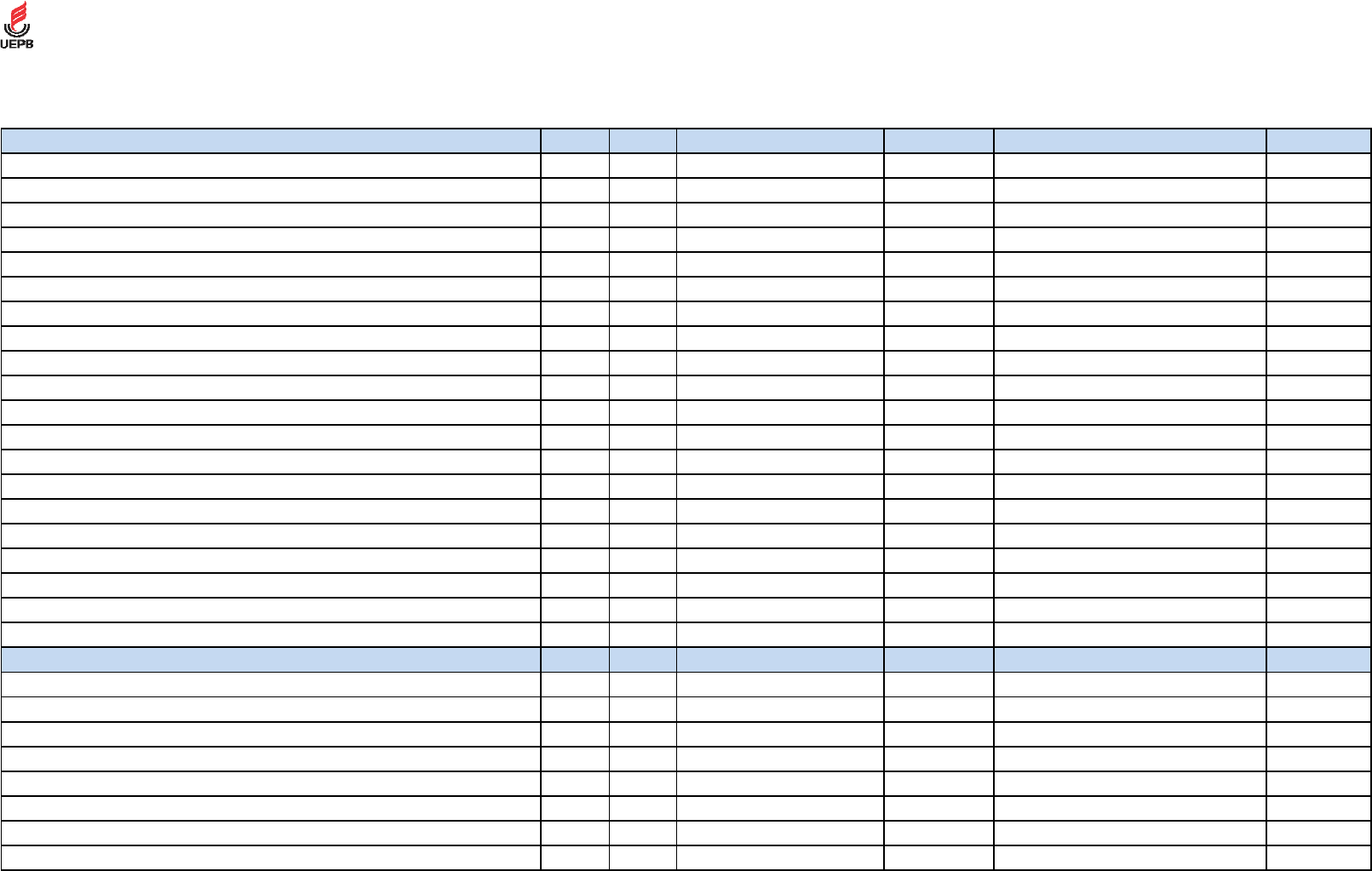 UNIVERSIDADE ESTADUAL DA PARAÍBA PRÓ‐REITORIA DE GRADUAÇÃO NOME CLAS MÉDIA MOD. CONCORRENCIA CAMPUS CURSO TURNO GABRIEL ALVES DE ALMEIDA 1 655,33 Ampla concorrência Campus I ADMINISTRAÇÃO Matutino PAMELLA MARIA RODRIGUES PAUDARCO 2 634,64 Ampla concorrência Campus I ADMINISTRAÇÃO Matutino VINICIUS JOSE MONTEIRO DE CARVALHO 3 634,6 Ampla concorrência Campus I ADMINISTRAÇÃO Matutino LUCAS MANOEL PEREIRA LIMA 4 634,59 Ampla concorrência Campus I ADMINISTRAÇÃO Matutino PAULA CRISTINA FONSECA 5 630,63 Ampla concorrência Campus I ADMINISTRAÇÃO Matutino ARTHUR DIMITRI FERREIRA DE ARAUJO 6 629,24 Ampla concorrência Campus I ADMINISTRAÇÃO Matutino MAURICIO DA SILVA SOUZA 7 629,23 Ampla concorrência Campus I ADMINISTRAÇÃO Matutino MARIA VITORIA SOARES GALINDO 8 628,51 Ampla concorrência Campus I ADMINISTRAÇÃO Matutino VIVIANE CASTRO DO ROSARIO 9 627,03 Ampla concorrência Campus I ADMINISTRAÇÃO Matutino LEILIANE SOARES GOMES 10 624,85 Ampla concorrência Campus I ADMINISTRAÇÃO Matutino AGDA MARIA RAMALHO JORDAO 11 622,86 Ampla concorrência Campus I ADMINISTRAÇÃO Matutino PAULO RICARDO MARTINS CAVALCANTI DE OLIVEIRA 12 620,38 Ampla concorrência Campus I ADMINISTRAÇÃO Matutino CARLOS HIORRAN COELHO DE AQUINO 13 619,41 Ampla concorrência Campus I ADMINISTRAÇÃO Matutino GEISIANE ANTONITA DO NASCIMENTO 14 618,13 Ampla concorrência Campus I ADMINISTRAÇÃO Matutino MARIA TALITA DE PONTES BARROS 15 617,38 Ampla concorrência Campus I ADMINISTRAÇÃO Matutino RAFAELA CARLA SOUZA DOS SANTOS 16 616,58 Ampla concorrência Campus I ADMINISTRAÇÃO Matutino FABIO LUIZ DA CUNHA BRITO 17 616,49 Ampla concorrência Campus I ADMINISTRAÇÃO Matutino CRISTIANA BISERRA DE ALMEIDA 18 614,51 Ampla concorrência Campus I ADMINISTRAÇÃO Matutino LARA FARIAS BASTOS 19 614,5 Ampla concorrência Campus I ADMINISTRAÇÃO Matutino JUCYMARA DE ALMEIDA LACET PORTO 20 613,47 Ampla concorrência Campus I ADMINISTRAÇÃO Matutino NOME CLAS MÉDIA MOD. CONCORRENCIA CAMPUS CURSO TURNO ARYELLE KARYNNE SOARES DA SILVA 1 647,18 Ação Afirmativa Campus I ADMINISTRAÇÃO Matutino RENATA DOS SANTOS SOUZA 2 631,6 Ação Afirmativa Campus I ADMINISTRAÇÃO Matutino LUAN CARLOS BEZERRA DA SILVA 3 624,77 Ação Afirmativa Campus I ADMINISTRAÇÃO Matutino ELITON FERNANDES BALBINO 4 623,17 Ação Afirmativa Campus I ADMINISTRAÇÃO Matutino JOSUE BEZERRA FERREIRA 5 622,56 Ação Afirmativa Campus I ADMINISTRAÇÃO Matutino AMANDA GOMES DE ARAUJO SILVA 6 619 Ação Afirmativa Campus I ADMINISTRAÇÃO Matutino MARIA JULIA SILVA SANTOS 7 615,93 Ação Afirmativa Campus I ADMINISTRAÇÃO Matutino JOAO VICTOR MENEZES CORDEIRO 8 613,83 Ação Afirmativa Campus I ADMINISTRAÇÃO Matutino Chamada Regular MEC/ SiSU/ UEPB ‐ SISU 2018.2 Rua: Baraúnas, 351 – Bairro: Universitário 58109‐753 – Campina Grande – Paraíba – Brasil Fone: (0xx83) 3315‐3350 – Fax: (0xx83) 3315‐3434 E‐mail: prograd@uepb.edu.br – www.uepb.edu.br UNIVERSIDADE ESTADUAL DA PARAÍBA PRÓ‐REITORIA DE GRADUAÇÃO ANA BEATRIZ BASTOS LOURENCO 9 612,78 Ação Afirmativa Campus I ADMINISTRAÇÃO Matutino ARTUR DANIEL FELINTO SILVA 10 607,04 Ação Afirmativa Campus I ADMINISTRAÇÃO Matutino MARCELO DIAS TOMAZ 11 606,63 Ação Afirmativa Campus I ADMINISTRAÇÃO Matutino CLAYTON DE PINHO SANTOS 12 606,44 Ação Afirmativa Campus I ADMINISTRAÇÃO Matutino SAMELA RUAMA DE ALMEIDA FELINTO 13 606,42 Ação Afirmativa Campus I ADMINISTRAÇÃO Matutino DANYELLE DA SILVA SANTOS 14 605,78 Ação Afirmativa Campus I ADMINISTRAÇÃO Matutino SARA DAYANE RODRIGUES DA SILVA 15 605,14 Ação Afirmativa Campus I ADMINISTRAÇÃO Matutino JOSIVALDO BEZERRA SOARES 16 603,08 Ação Afirmativa Campus I ADMINISTRAÇÃO Matutino MAGIDIEL PEREIRA DA SILVA JUNIOR 17 602,98 Ação Afirmativa Campus I ADMINISTRAÇÃO Matutino JOSE JARDEL SILVA DOS SANTOS 18 602,81 Ação Afirmativa Campus I ADMINISTRAÇÃO Matutino GEOVANE XAVIER DE LIMA 19 601,07 Ação Afirmativa Campus I ADMINISTRAÇÃO Matutino MARCOS LAMBERTO SALES PESSOA 20 600,93 Ação Afirmativa Campus I ADMINISTRAÇÃO Matutino NOME CLAS MÉDIA MOD. CONCORRENCIA CAMPUS CURSO TURNO JOSE ROBERTO EGITO DE ANDRADE 1 646,33 Ampla concorrência Campus I ADMINISTRAÇÃO Noturno YANAIALA BEZERRA DE LIMA MENDONCA 2 645,09 Ampla concorrência Campus I ADMINISTRAÇÃO Noturno ERIC GABRIEL FERNANDEZ ALBUQUERQUE DA SILVA 3 644,96 Ampla concorrência Campus I ADMINISTRAÇÃO Noturno ALDO NASCIMENTO LACERDA 4 644,14 Ampla concorrência Campus I ADMINISTRAÇÃO Noturno HUGO CESAR DE OLIVEIRA ARAUJO 5 642,38 Ampla concorrência Campus I ADMINISTRAÇÃO Noturno WENDNA MAYSE AMORIM CHAVES 6 634,46 Ampla concorrência Campus I ADMINISTRAÇÃO Noturno EWERTON CABRAL MONTENEGRO 7 628,84 Ampla concorrência Campus I ADMINISTRAÇÃO Noturno ALICIA MANOELA DE MELO 8 626,36 Ampla concorrência Campus I ADMINISTRAÇÃO Noturno JOAO MATHEUS DA SILVA 9 625,36 Ampla concorrência Campus I ADMINISTRAÇÃO Noturno VINICIUS AMARAL DA COSTA LINS 10 624,48 Ampla concorrência Campus I ADMINISTRAÇÃO Noturno IVSON SAMUEL DE MOURA SILVA 11 623,79 Ampla concorrência Campus I ADMINISTRAÇÃO Noturno ITALO NOBREGA SOUTO 12 623,71 Ampla concorrência Campus I ADMINISTRAÇÃO Noturno ANA ALICE DA SILVA FARIAS 13 623,49 Ampla concorrência Campus I ADMINISTRAÇÃO Noturno LUIS HENRIQUE SIQUEIRA LIMA DE OLIVEIRA 14 621,76 Ampla concorrência Campus I ADMINISTRAÇÃO Noturno MARX HARRISON ZEVOHAI ALVES FREITAS 15 620,22 Ampla concorrência Campus I ADMINISTRAÇÃO Noturno ANTHONY AVELINO LUCENA MACHADO 16 615,81 Ampla concorrência Campus I ADMINISTRAÇÃO Noturno NICOLAS FERNANDES SILVA 17 614,97 Ampla concorrência Campus I ADMINISTRAÇÃO Noturno TASSIO OLIVEIRA NASCIMENTO 18 614,61 Ampla concorrência Campus I ADMINISTRAÇÃO Noturno ANA ARAUJO BARROS 19 614,52 Ampla concorrência Campus I ADMINISTRAÇÃO Noturno ISRAEL DE ARAUJO LIMA 20 610,98 Ampla concorrência Campus I ADMINISTRAÇÃO Noturno Rua: Baraúnas, 351 – 