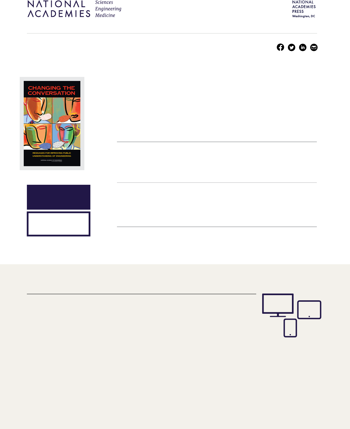CONTRIBUTORS DETAILS All downloadable National Academies titles are free to be used for personal and/or non-commercial academic use. Users may also freely post links to our titles on this website; non-commercial academic users are encouraged to link to the version on this website rather than distribute a downloaded PDF to ensure that all users are accessing the latest authoritative version of the work. All other uses require written permission. (Request Permission) This PDF is protected by copyright and owned by the National Academy of Sciences; unless otherwise indicated, the National Academy of Sciences retains copyright to all materials in this PDF with all rights reserved. Visit the National Academies Press at nap.edu and login or register to get: – Access to free PDF downloads of thousands of publications – 10% off the price of print publications – Email or social media notifications of new titles related to your interests – Special offers and discounts SUGGESTED CITATION BUY THIS BOOK FIND RELATED TITLES This PDF is available at http://nap.nationalacademies.org/12187 Changing the Conversation: Messages for Improving Public Understanding of Engineering (2008) 164 pages | 6 x 9 | HARDBACK ISBN 978-0-309-38693-7 | DOI 10.17226/12187 Committee on Public Understanding of Engineering Messages; National Academy of Engineering National Academy of Engineering. 2008. Changing the Conversation: Messages for Improving Public Understanding of Engineering. Washington, DC: The National Academies Press. https://doi.org/10.17226/12187. http://nap.nationalacademies.org/12187 http://nap.nationalacademies.org/12187 https://nap.nationalacademies.org/related.php?record_id=12187 https://nap.nationalacademies.org/reprint_permission.html http://nap.edu http://api.addthis.com/oexchange/0.8/forward/facebook/offer?pco=tbxnj-1.0&url=http://www.nap.edu/12187&pubid=napdigops http://www.nap.edu/share.php?type=twitter&record_id=12187&title=Changing+the+Conversation%3A+Messages+for+Improving+Public+Understanding+of+Engineering http://api.addthis.com/oexchange/0.8/forward/linkedin/offer?pco=tbxnj-1.0&url=http://www.nap.edu/12187&pubid=napdigops mailto:?subject=null&body=http://nap.nationalacademies.org/12187 Changing the Conversation: Messages for Improving Public Understanding of Engineering Copyright National Academy of Sciences. All rights reserved. �0� A BIOGRAPHIES OF COMMITTEE MEMBERS DON P. GIDDENS (NAE), chair, is dean of the College of Engineer- ing (since 1992), Lawrence L. Gellerstedt Jr. Chair in Bioengineering, and Georgia Research Alliance Eminent Scholar, Georgia Institute of Technology. After receiving all three of his degrees (B.S.E. 1963, M.S. 1965, and Ph.D. 1966) from Georgia Tech, he joined the faculty there in 1968. Dean Giddens is a member of the National Academy of Engi- neering, the Biomedical Engineering Society, and the Big 10+ Deans Council, a founding fellow and past president of the American Institute for Medical and Biological Engineering, and fellow of the American Heart Association and American Society of Mechanical Engineers (ASME). He received the H.R. Lissner Award from ASME in 1993 and was the ASME Thurston Lecturer in 1996. In June 2007, he was elected chair of the Executive Board of the Engineering Deans Council of the American Society for Engineering Education. Dr. Giddens is a mem- ber of several advisory boards and councils for academic institutions, corporations, and professional societies. He is also the author of more than 300 refereed publications, book chapters, and presentations and maintains an active research program in cardiovascular hemodynamics at Georgia Tech. https://nap.nationalacademies.org/catalog/12187?s=z1120 Changing the Conversation: Messages for Improving Public Understanding of Engineering Copyright National Academy of Sciences. All rights reserved. �0� CHANGING THE CONVERSATION RICK E. BORChELT is director of communications at the Genetics and Public Policy Center, Berman Bioethics Center, Johns Hopkins University, where he also teaches science policy and politics in the sci- ence writing program. Previously, he was director of communications and public affairs at Whitehead Institute for Biomedical Research at Massachusetts Institute of Technology, an independent research enter- prise. Mr. Borchelt’s varied career includes stints as director of media relations for the National Academy of Sciences; press secretary for the U.S. House of Representatives Committee on Science, Space, and Technology; special assistant for public affairs in the Executive Office of the President during the Clinton Administration; and director of communications for the U.S. Department of Energy (DOE) Office of Science. He chaired a three-year study by a blue-ribbon panel of Pulitzer Prize–winning journalists, scientists, public affairs officers, and science writers, funded by DOE and the National Aeronautics and Space Administration, on best practices in communicating to the public about science, technology, and health, which culminated in an international conference in March 2002, “Communicating the Future.” Mr. Borchelt is currently an advisor to a project funded by the National Science Foundation (NSF) on nanoscale informal science education. He was elected a fellow of the American Association for the Advancement of Science in 2004 and is a commentary editor for Science Communication. vIRGIL R. CARTER is executive director of the American Society of Mechanical Engineers (ASME), where his responsibilities include over- seeing budgets, staff, and technical and educational activities, as well as management of the ASME Foundation and affiliated business entities. His professional career spans 42 years and includes military service, executive and ownership positions in business, academic teaching and administration, and association management. After earning a Bachelor of Architecture degree from Oklahoma State University (OSU) in 1964, he served as a capta