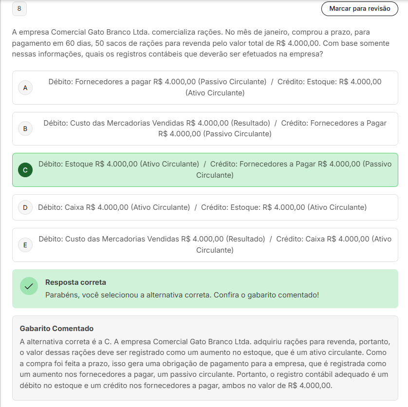 8 Marcar para revisão A empresa Comercial Gato Branco Ltda. comercializa rações. No mês de janeiro, comprou a prazo, para pagamento em 60 dias, 50 sacos de rações para revenda pelo valor total de R$ 4.000,00. Com base somente nessas informações, quais registros contábeis que deverão ser efetuados na empresa? Débito: Fornecedores a pagar R$ 4.000,00 (Passivo Circulante) / Crédito: Estoque: R$ 4.000,00 A (Ativo Circulante) Débito: Custo das Mercadorias Vendidas R$ 4.000,00 (Resultado) / Crédito: Fornecedores a Pagar B R$ 4.000,00 (Passivo Circulante) Débito: Estoque R$ 4.000,00 (Ativo Circulante) / Crédito: Fornecedores a Pagar R$ 4.000,00 (Passivo C Circulante) D Débito: Caixa 4.000,00 (Ativo Circulante) / Crédito: Estoque: R$ 4.000,00 (Ativo Circulante) Débito: Custo das Mercadorias Vendidas R$ 4.000,00 (Resultado) / Crédito: Caixa R$ 4.000,00 (Ativo E Circulante) Resposta correta Parabéns, você selecionou a alternativa correta. Confira O gabarito comentado! Gabarito Comentado A alternativa correta é a C. A empresa Comercial Gato Branco Ltda. adquiriu rações para revenda, portanto, O valor dessas rações deve ser registrado como um aumento no estoque, que é um ativo circulante. Como a compra foi feita a prazo, isso gera uma obrigação de pagamento para a empresa, que é registrada como um aumento nos fornecedores a pagar, um passivo circulante. Portanto, 0 registro adequado é um débito no estoque e um crédito nos fornecedores a pagar, ambos no valor de R$ 4.000,00.