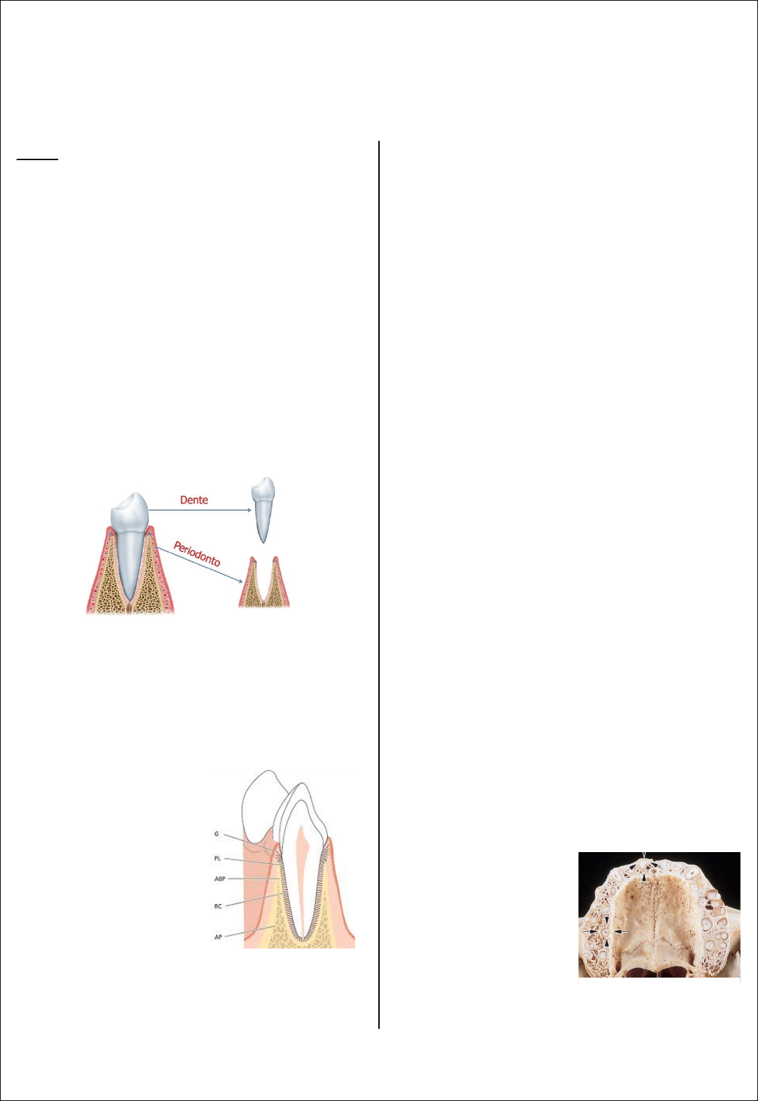 Hurian Machado – Odontologia UNIG 1 Periodontia I Aula 1 Introdução A periodontia é a especialidade da odontologia que estuda os tecidos próximos aos dentes e o tratamento das possíveis alterações que possam atingi-lo. PERI à à volta de, ao redor de; ODONTO à termo para indicar relação com dente. Existem dois termos comumente utilizados em periodontia para referir-se aos dentes e gengiva, que são “estética branca” referindo-se aos dentes e “estética rosa” referindo-se a gengiva. Anatomia do Periodonto O periodonto é o conjunto dos tecidos de proteção e sustentação do órgão dentário que tem, entre si, uma completa interdependência anatômica e fisiológica. Sua principal função é inserir o dente no tecido ósseo da maxila e da mandíbula e manter a integridade da superfície da mucosa mastigatória da cavidade oral. O periodonto é divido em periodonto de sustentação e periodonto de proteção. 1.Periodonto de Sustentação/ Inserção O periodonto de sustentação/ inserção é composto pelo osso alveolar, ligamento periodontal e cemento radicular. Estas estruturas estão ao redor de toda a superfície radicular, e são as estruturas de suporte que fixam o dente ao alvéolo. A) Osso Alveolar O processo alveolar é definido como as partes da maxila e da mandíbula que dão suporte aos alvéolos dos dentes. Juntamente com o cemento radicular e o ligamento periodontal, constitui o aparelho de sustentação dos dentes, e tem como função principal distribuir e absorver as forças geradas pela mastigação e por outros contatos. O osso alveolar é constituído por dois componentes: o osso alveolar propriamente dito e o processo alveolar. O osso alveolar propriamente dito é contínuo com o processo alveolar e forma a delgada lâmina óssea que está localizada imediatamente lateral ao ligamento periodontal. • OSSO CORTICAL - É um osso compacto. - É constituído por uma série de lamelas concêntricas que apresentam canais ao seu redor. - As paredes dos alvéolos são revestidas por osso cortical (lâmina dura) e a área entre os alvéolos, é preenchida por osso esponjoso. - A mandíbula possui a maior quantidade de osso cortical. Figura 1. G: gengiva; PL: ligamento periodontal; RC: cemento radicular; ABP: osso alveolar propriamente dito; AP: processo alveolar. Figura 2. Setas apontando para o osso cortical. Hurian Machado – Odontologia UNIG 2 - Seu aspecto radiográfico é radiopaco. • OSSO ESPONJOSO - É uma substância esponjosa, e que possui trabéculas ósseas (traves ósseas dispostas em forma de rede/tubos). - É responsável pela flexibilidade do osso e pela absorção dos impactos. - Estrutura por onde passa a inervação e vascularização. - A maxila tem maior quantidade de osso esponjoso. • DEFEITOS ÓSSEOS - Deiscência: perda óssea total vestibular. - Fenestração: perda óssea parcial. B) Ligamento Periodontal O ligamento periodontal é formado por tecido conjuntivo frouxo, ricamente vascularizado e celular, que circunda a raiz dos dentes e une o cemento ao osso alveolar propriamente dito (lâmina dura). O ligamento periodontal se comunica através de canais vasculares no osso alveolar propriamente dito com os espaços medulares do osso alveolar. Se localiza entre o cemento radicular e o processo alveolar. Todo o cemento radicular é impregnado pelo ligamento periodontal. Obs: anquilose é a cicatrização onde o osso e o cemento se unem diretamente, em casos de avulsão, por exemplo. • FUNÇÕES DO LIGAMENTO PERIODONTAL - Presença de mecanoceptores: fazem reflexo de estiramento. Ex: quando mastigamos algo duro e paramos de mastigar imediatamente; isso ocorre devido a presença dos mecanoceptores. - Articulação gonfose: tipo de articulação no qual o dente apresenta pouco movimento. Quando ocluímos, o dente se movimenta. - Amortece os impactos através da absorção e transmissão de forças ao osso alveolar, durante a mastigação por exemplo. - Hidrodinâmica: tecido conjuntivo preenchido de água. • CÉLULAS QUE CONSTITUEM O LIGAMENTO PERIODONTAL - Fibroblastos: fazem a reconstituição das fibras. - Osteoblastos: fazem a reposição de osso através do cálcio. - Osteoclastos: responsáveis pela reabsorção óssea (osteólise). -Cementoblastos: responsáveis pela reconstituição do cemento. - Células espiteliais: células que formam tecidos. - Células nervosas: promovem estímulo. Hurian Machado – Odontologia UNIG 3 • FIBRAS QUE CONSTITUEM O LIGAMENTO PERIODONTAL a) Fibras de crista alveolar: próximas à coroa/crista alveolar. b) Fibras horizontais: se localizam logo abaixo da crista alveolar. c) Fibras obliquas: se localizam no terço médio radicular. d) Fibras apicais: se localizam no terço apical da raiz. • FORMAÇÃO DAS FIBRAS DO LG O ligamento periodontal e o cemento radicular desenvolvem-se a partir do tecido conjuntivo frouxo (folículo), que circunda o germe dentário. O ligamento periodontal se desenvolve concomitantemente com o desenvolvimento da raiz e a erupção do dente. O germe dentário é formado em uma cripta do osso. Durante o processo de sua maturação, as fibras colágenas produzidas pelos fibroblastos no tecido conjuntivo frouxo do germe dentário ficam envolvidas pelo cemento recém-formado, imediatamente apical à junção cemento-esmalte (JCE). As fibras dispõem- se em feixes, orientados em direção à parte coronal da cripta óssea. Esses feixes mais tarde formarão os grupos de fibras dentogengivais, dentoperiósteas e transeptais, que pertencem ao grupo de fibras orientadas pela gengiva. As fibras verdadeiras do ligamento periodontal (as fibras principais), surgem em associação com a erupção do dente. Primeiro, fibras podem ser identificadas penetrando na porção mais marginal do osso alveolar. Mais tarde, são vistos feixes em posição mais apical de fibras colágenas orientadas. A orientação dos feixes de fibras colágenas modifica-se continuamente durante a 