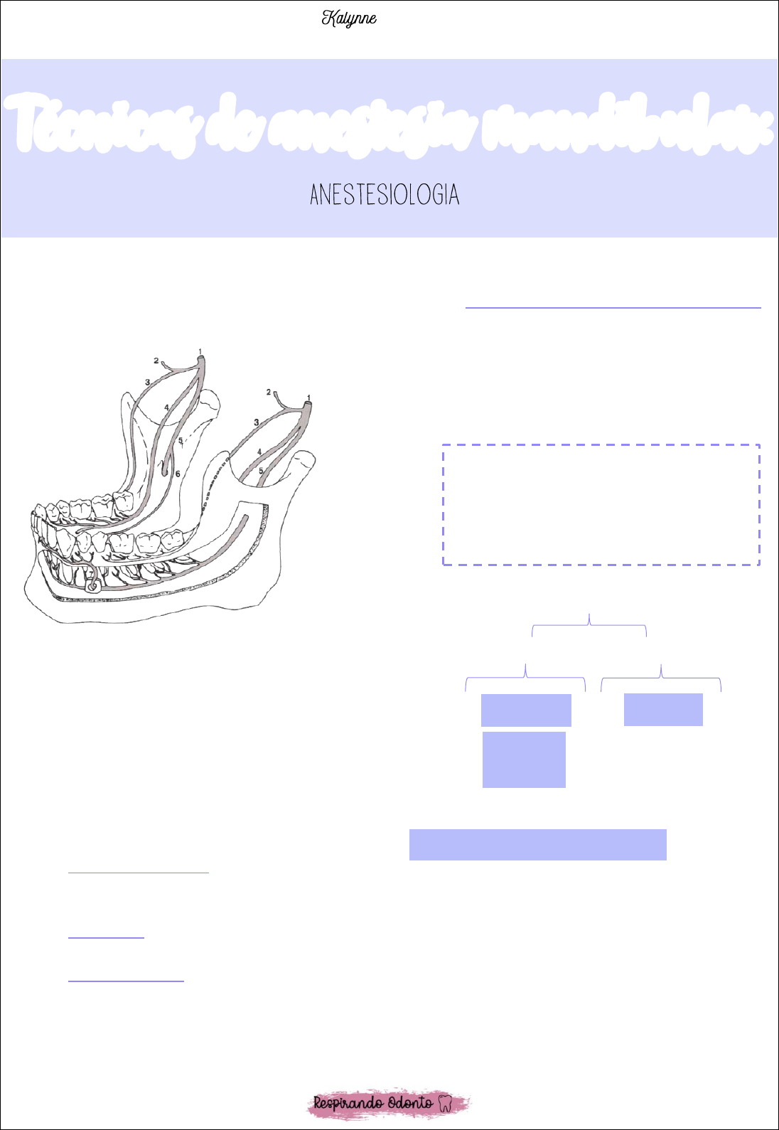 P4 – ODONTOLOGIA UNINASSAU RN - @respirando_odonto Revusão da anatomia: • Ramos do nervo mandibular: 1- N. Mandibular 2- N. Temporal profundo anterior 3- N. Bucal 4- N. Lingual 5- N. Alveolar inferior com ramos dentais e peridentais 6- N. Milo-hióideo 7- N. Mentoniano • O nervo alveolar inferior – inerva a polpa dos dentes inferiores até a linha média e os tecidos moles até a área do 1º molar. • O nervo bucal – inerva tecidos moles e periósteo dos molares inferiores. • O nervo mentoniano – inerva a mucosa vestibular anterior a região do forame mentoniano até a linha média. • O nervo incisivo (ramo terminal do nervo alveolar inferior) – inerva a mucosa vestibular anterior a região do forame mentoniano até a linha média + polpa e tecido ósseo de pré-molares, caninos e incisivos. Técnicas anestésicas - mandíbula: Bloqueio Bloqueio do Nervo Alveolar Inferior: • Taxa de sucesso em torno de 80 a 85%. • Áreas anestesiadas: - Dentes inferiores até a linha média. - Corpo da mandíbula, porção inferior do ramo. - Tecidos moles até a área do 1º molar. - Dois terços anteriores da língua e assoalho da cavidade oral. - Tecidos moles e periósteo linguais. Técnicas de anestesia mandibular: A infiltrativa na mandíbula deve ser utilizada apenas para complementar outra técnica de anestesia. Tendo em vista que o osso da mandíbula é muito mais cortical. Nesse caso, deve-se utilizar as mesmas técnicas vistas na maxila. Regional Troncular N.A.I. + L + B Mentoniano + Incisivo Mandibular P4 – ODONTOLOGIA UNINASSAU RN - @respirando_odonto • Nervos anestesiados: - Alveolar inferior. - Incisivo. - Mental. - Lingual Área anestesiada por um bloqueio do nervo alveolar inferior. • Indicações: - Procedimentos múltiplos em um único quadrante mandibular. - Anestesia em tecidos moles vestibulares da boca. - Anestesia em tecidos moles linguais. • Contra-indicações: - Infecção ou inflamação na área da injeção. - Pacientes que podem morder lábio e língua (risco de o paciente de machucar) • Vantagens: - Única perfuração. - Pouca quantidade de anestésico em relação a área anestesiada. . • Desvantagens: - Alta taxa de insucesso (15 a 20%) - Aspiração positiva – sangue dentro do tubete (10 a 15%) - Os pontos de referência intra-bucais podem não ser confiáveis. - Anestesia do lábio inferior e língua pode ser desconfortável. • Reparos anatômicos: - Rafe Pterigomandibular: formada pela junção dos músculos bucinador e constritor superior da faringe. - Fossa coronóide: região de maior concavidade da borda anterior do ramo da mandíbula. A região vestibular dos dentes posteriores da mandíbula é inervada pelo n. bucal. Portanto, ás vezes será necessário fazer um complemento no n. bucal, a depender do procedimento que vai ser realizado. Na maioria das vezes essa técnica acaba anestesiando também o nervo lingual. Diferente da maxila, na mandíbula, independente de ser um procedimento em um único dente ou em vários (um procedimento ou múltiplos procedimentos), realiza-se um bloqueio. A infiltrativa não é suficiente para anestesiar, devido à densidade óssea da mandíbula. Para verificar se o nervo alveolar inferior foi anestesiado, deve-se observar se o lábio está anestesiado. Se o lábio estiver dormente, significa que o alveolar inferior foi realmente anestesiado. (Ex: tocar com a pinça de uma lado e de outro e pedir para o paciente dizer se está sentindo). Deve-se colocar o dedo no ramo da mandíbula para sentir a região de maior concavidade (curva acentuada) – fossa coronóide. P4 – ODONTOLOGIA UNINASSAU RN - @respirando_odonto • Técnica: - Colocar o dedo indicador ou polegar na incisura coronóide. - Puxar lateralmente os tecidos, esticando-os, possibilitando que a injeção da agulha seja menos traumática e também porporcionando melhor visibilidade. - O local de punção é lateral à rafe pterigomandibular. - Altura: centro da incisura coronóide. - Profundidade: até haver contato com o osso (depois de tocar no osso, deve-se recuar a agulha levemente e injetar o anestésico). - Na maioria dos pacientes se consegue fazer essa técnica com a agulha curta. Note a colocação do corpo da seringa no canto da boca, geralmente correspondendo aos pré-molares. A ponta da agulha gentilmente toca a extremidade mais distal da rafe pterigomandibular. • Injeção baixa – atenção para pacientes desdentados! Nesses pacientes o osso do corpo da mandíbula estará mais baixo, pois o osso alveolar que sustentava o dente foi perdido, ocorre a reabsorção, ficando apenas o osso basal. Tomar cuidado para não aplicar a anestesia muito em baixo. Bloqueio do Nervo Bucal: • Áreas anestesiadas: - Tecidos moles e periósteo vestibular dos molares inferiores. Área anestesiada por um bloqueio do nervo bucal. • Indicações: - Quando necessária a anestesia de tecidos moles vestibulares na região de molares. • Contra-indicações: - Infecção ou inflamação aguda na área da injeção. • Vantagens: - Alta taxa de sucesso, técnica fácil. • Desvantagens: - Dor se a agulha tocar o periósteo durante a injeção. • Técnica: - Agulha longa (mas também é possível fazer com a agulha curta). Usar a agulha longa quando há dificuldade para alcançar o local de inserção (percebe-se que isso está acontecendo quando há dificuldades para anestesiar o paciente depois de algumas inserções). - Tracionar lateralmente os tecidos moles vestibulares a área da injeção. - Área da introdução: membrana mucosa distal e vestibular ao último molar do arco. - Bisel: orientado para baixo. Dica: o corpo da seringa carpule deve ficar na região de pré-molar. Se ela estiver na região de incisivo, irá passar direto do osso. E se estiver para a região de molar, vai muito para a bochecha, saindo da área do ramo da mandíbula. Há uma outra técnica que se pode anestesiar em duas posições. Depois de localiza