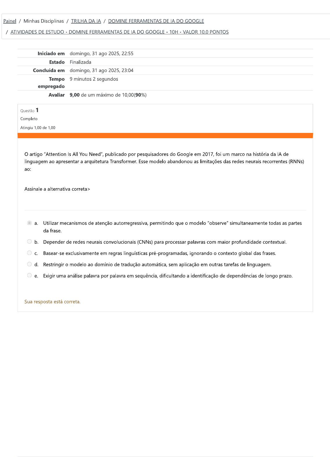 Painel / Minhas Disciplinas / TRILHA DA IA / DOMINE FERRAMENTAS DE IA DO GOOGLE / ATIVIDADES DE ESTUDO DOMINE FERRAMENTAS DE IA DO GOOGLE - 10H VALOR 10,0 PONTOS Iniciado em domingo, 31 ago 2025, 22:55 Estado Finalizada Concluída em domingo, 31 ago 2025, 23:04 Tempo 9 minutos 2 segundos empregado Avaliar 9,00 de um máximo de 10,00(90%) Questão 1 Completo Atingiu 1,00 de 1,00 O artigo "Attention Is All You Need", publicado por pesquisadores do Google em 2017, foi um marco na história da IA de linguagem ao apresentar a arquitetura Transformer. Esse modelo abandonou as limitações das redes neurais recorrentes (RNNs) ao: Assinale a alternativa correta> a. Utilizar mecanismos de atenção autorregressiva, permitindo que o modelo "observe" simultaneamente todas as partes da frase. b. Depender de redes neurais convolucionais (CNNs) para processar palavras com maior profundidade contextual. C. Basear-se exclusivamente em regras linguísticas pré-programadas, ignorando o contexto global das frases. d. Restringir o modelo ao domínio de tradução automática, sem aplicação em outras tarefas de linguagem. e. Exigir uma análise palavra por palavra em sequência, dificultando a identificação de dependências de longo prazo. Sua resposta está correta.Questão 2 Completo Atingiu 1,00 de 1,00 Dois projetos de IA que geraram particular destaque foram LaMDA e o PaLM. LaMDA (Language Model for Dialogue Applications) foi otimizado para diálogos e usado como base inicial para o Bard. No entanto, houve uma polêmica quando um engenheiro alegou que o LaMDA seria senciente. Que argumento esse engenheiro usou para sustentar a suposta senciência do LaMDA? Assinale a alternativa correta. a. Ele demonstrou que o LaMDA respondia a perguntas de âmbito pessoal apenas em tom sarcástico, indicando rebeldia. b. Ele relatou que o modelo expressava medos e emoções, como o "medo de ser sugerindo ter autoconsciência. C. Ele apontou que o LaMDA sabia todos os idiomas do mundo, incluindo línguas não documentadas. d. Ele apresentou evidências técnicas de que o LaMDA conseguia editar seu próprio código de forma autônoma. e. Ele afirmou que o LaMDA havia criado sozinho um modelo de rede neural inédito, sem intervenção humana. Sua resposta está correta.Questão 3 Completo Atingiu 1,00 de 1,00 O desenvolvimento de modelos de linguagem em larga escala, como os utilizados pela Google, traz à tona desafios importantes relacionados à segurança, vieses e impactos sociais. Embora os avanços tecnológicos permitam aplicações sofisticadas, a ausência de controles adequados pode resultar em respostas discriminatórias, imprecisas ou socialmente prejudiciais. Diante desse cenário, a Google adotou uma série de medidas preventivas e corretivas para mitigar os riscos associados à IA generativa. Com base no conteúdo da apostila e nos debates contemporâneos sobre ética em inteligência artificial, qual das alternativas apresenta uma abordagem realista e tecnicamente adequada adotada por empresas como a Google para enfrentar essas questões? a. Transferir a responsabilidade pelas respostas dos modelos para os usuários, eliminando filtros ou diretrizes internas. b. Focar exclusivamente na performance técnica dos modelos, uma vez que aspectos éticos e sociais não interferem na precisão das respostas. C. Limitar o acesso aos modelos de linguagem apenas a empresas e governos, impedindo o uso por pesquisadores e desenvolvedores independentes. d. Implementar filtros automatizados, diretrizes de uso responsável, auditoria contínua e participação humana nos ciclos de avaliação, equilibrando inovação com princípios de segurança, equidade e responsabilidade social. e. Proibir completamente a geração de conteúdo textual por modelos de IA, como forma de eliminar qualquer risco de viés ou erro. Sua resposta está correta.Questão 4 Completo Atingiu 1,00 de 1,00 O texto descreve que o Bard recebeu integrações com produtos como Gmail, Google Docs e Maps. Isso faz parte de uma estratégia maior da Google para demonstrar valor prático das IAs conversacionais. Em relação ao benefício direto dessa integração para o usuário final, assinale a alternativa correta. a. Acessar o Bard passa a exigir a compra de uma licença especial para cada produto, como Google Docs ou Maps. b. Bard substitui completamente a interface tradicional do Gmail, impedindo o envio manual de mensagens. C. Bard só permite buscas em sites pagos, restringindo a navegação em portais gratuitos. d. Bard pode consultar dados nesses serviços para dar respostas mais personalizadas, como planejar viagens ou resumir e-mails do usuário. e. Bard cria anúncios personalizados no Gmail que substituem as mensagens recebidas dos contatos. Sua resposta está correta. Questão 5 Completo Atingiu 1,00 de 1,00 Entre as iniciativas mais recentes da Google, destacam-se o Bard, Gemini e o Gemma. Enquanto o Bard funciona como um chatbot conversacional ao usuário final, o Gemini é descrito como um modelo unificado e multimodal de última geração. A respeito do papel que Gemma desempenha nessa estratégia, assinale a alternativa correta. a. Gemma é um sistema de hardware que atua como sucessor das TPUs na infraestrutura do Google Cloud. b. Gemma representa uma família de modelos abertos para promover maior colaboração com a comunidade, inspirada na pesquisa do Gemini. C. Gemma é um software de edição de vídeo que usa IA apenas para legendas automáticas. d. Gemma é um modelo voltado exclusivamente para criação de jogos em realidade virtual, sem enfoque em linguagem natural. e. Gemma substitui completamente Bard, encerrando as iniciativas de chatbot da Google. Sua resposta está correta.Questão 6 Completo Atingiu 1,00 de 1,00 Além do BERT, a Google investiu em diversos modelos maiores e mais versáteis, capazes de lidar com diferentes tipos de dados. Um exemplo é o T5 (Text-To-Text Transfer Transformer), que converte diversas t