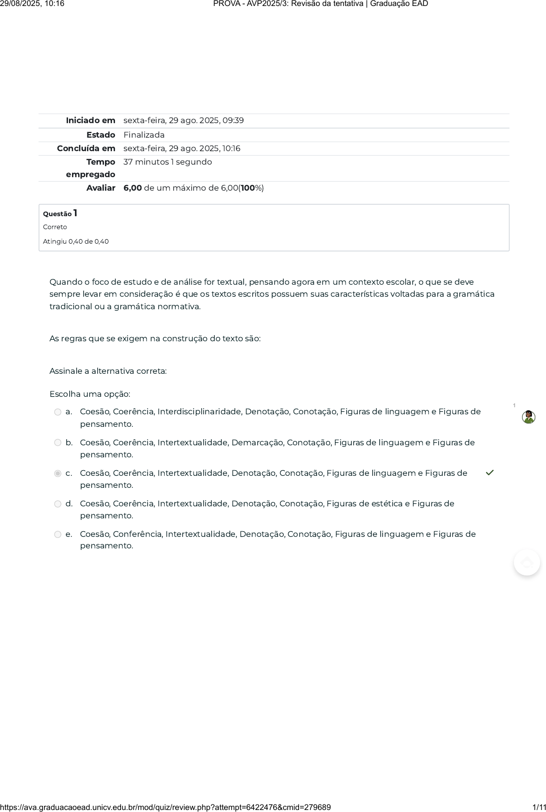 Iniciado em sexta-feira, 29 ago. 2025, 09:39 Estado Finalizada Concluída em sexta-feira, 29 ago. 2025, 10:16 Tempo empregado 37 minutos 1 segundo Avaliar 6,00 de um máximo de 6,00(100%) Questão 1 Correto Atingiu 0,40 de 0,40 Quando o foco de estudo e de análise for textual, pensando agora em um contexto escolar, o que se deve sempre levar em consideração é que os textos escritos possuem suas características voltadas para a gramática tradicional ou a gramática normativa. As regras que se exigem na construção do texto são: Assinale a alternativa correta: Escolha uma opção: a. Coesão, Coerência, Interdisciplinaridade, Denotação, Conotação, Figuras de linguagem e Figuras de pensamento. b. Coesão, Coerência, Intertextualidade, Demarcação, Conotação, Figuras de linguagem e Figuras de pensamento. c. Coesão, Coerência, Intertextualidade, Denotação, Conotação, Figuras de linguagem e Figuras de pensamento. ✓ d. Coesão, Coerência, Intertextualidade, Denotação, Conotação, Figuras de estética e Figuras de pensamento. e. Coesão, Conferência, Intertextualidade, Denotação, Conotação, Figuras de linguagem e Figuras de pensamento. 1 29/08/2025, 10:16 PROVA - AVP2025/3: Revisão da tentativa | Graduação EAD https://ava.graduacaoead.unicv.edu.br/mod/quiz/review.php?attempt=6422476&cmid=279689 1/11 Questão 2 Correto Atingiu 0,40 de 0,40 Os aspectos dos textos orais se diferem dos textos escritos. Enquanto na oralidade temos alguns tipos de textos mais voltados para o público, já na escrita essas características aumentam. Um desses gêneros orais acontece de forma individual e há a exposição sobre um assunto que foi estudado previamente, pode ser utilizado em ambiente corporativo ou acadêmico. Estamos falando: I) Debate II) Seminário III) Discussão em grupo IV) Exposição oral V) Dissertação É correto o que se afirma em: Escolha uma opção: a. Item IV ✓ b. Item III c. Item V d. Item I e. Item II 1 29/08/2025, 10:16 PROVA - AVP2025/3: Revisão da tentativa | Graduação EAD https://ava.graduacaoead.unicv.edu.br/mod/quiz/review.php?attempt=6422476&cmid=279689 2/11 Questão 3 Correto Atingiu 0,40 de 0,40 As relações interpessoais podem ser entendidas como aquelas em que se estabelecem trocas, sejam de experiências, de mensagens, de atos, de diálogos e de todo e qualquer canal e forma de emitir e receber informação. Qual é o caminho para o sucesso das relações interpessoais? 1) quando o processo comunicativo consegue desenvolver-se do início ao fim sem que haja quebra ou ruídos que o impeçam de acontecer 2) quando o processo comunicativo consegue desenvolver-se em partes específicas da informação 3) quando o processo comunicativo consegue desenvolver-se do início ao fim mesmo havendo quebra ou ruídos na comunicação 4) quando o processo comunicativo consegue desenvolver-se do início ao fim mesmo que emissor e receptor não estejam ligados pelo referente 5) quando o processo comunicativo consegue começar sem a função fática Está correto o que se afirma em qual item? Escolha uma opção: a. Apenas 5 b. Apenas 1 ✓ c. Apenas 1 e 3 d. Apenas 2 e. Apenas 4 1 29/08/2025, 10:16 PROVA - AVP2025/3: Revisão da tentativa | Graduação EAD https://ava.graduacaoead.unicv.edu.br/mod/quiz/review.php?attempt=6422476&cmid=279689 3/11 Questão 4 Correto Atingiu 0,40 de 0,40 “A comunicação é o espelho da cultura empresarial e reflete, necessariamente, os valores das organizações” (BUENO, 2009, p. 6). Sobre o contexto da comunicação nas empresas, assinale a alternativa que corresponde ao conceito correto de Comunicação Empresarial: a) Refere-se ao fluxo de informações relacionado ao dia a dia de uma empresa. Tem como objetivo principal coordenar, orientar e atualizar esse fluxo, para que as informações distribuídas por todos os setores e departamentos da organização. b) Aquela voltada a todos os colaboradores da empresa, da presidência ou diretoria aos auxiliares. O principal objetivo é realizar a integração entre todos os trabalhadores da empresa com foco em suas políticas, valores e objetivos. c) Utilizada para atingir os objetivos de marketing de uma organização, como divulgar produtos e estimular suas vendas ao seu público-alvo por meio dos veículos de comunicação. d) Conjunto integrado de ações, estratégias, planos, políticas e produtos planejados e desenvolvidos por uma organização para estabelecer a relação permanente e sistemática com todos os seus públicos de interesse. e) Capacidade e formas (formatos) que produzimos, possuímos e compreendemos para expressar nossos pensamentos, ideias, opiniões e sentimentos. Está correto o que se afirma em: Escolha uma opção: a. Opção A b. Opção C c. Opção E d. Opção D ✓ e. Opção B 1 29/08/2025, 10:16 PROVA - AVP2025/3: Revisão da tentativa | Graduação EAD https://ava.graduacaoead.unicv.edu.br/mod/quiz/review.php?attempt=6422476&cmid=279689 4/11 Questão 5 Correto Atingiu 0,40 de 0,40 A origem da escrita é datada em 3500 anos a. C. e seus primeiros registros podem ser encontrados na Mesopotâmia com a escrita cuneiforme, como ficou conhecida. Um emaranhado de símbolos e figuras que deram início à escrita e que foi fundamental para os registros da época, sua principal função era registrar tudo que estava relacionado à administração e contabilidade e seus mais de dois mil símbolos era fundamental para tais registros. Para ROJO apud SCHNEUWLY (2006, p. 467), gêneros textuais e gênero orais têm uma relação: a) Controversa, pois não dependem um do outro. b) Não têm relação em nenhum sentido. c) Mútua e de continuidade. d) De interdependência, em algumas situações isoladas. e) Idêntica, ambos os gêneros têm o mesmo significado. Qual opção acima está correta? Escolha uma opção: a. Apenas B e D b. Apenas B c. Apenas A d. Apenas E e. Apenas C ✓ 1 29/08/2025, 10:16 PROVA - AVP2025/3: Revisão da tentativa | Gradu