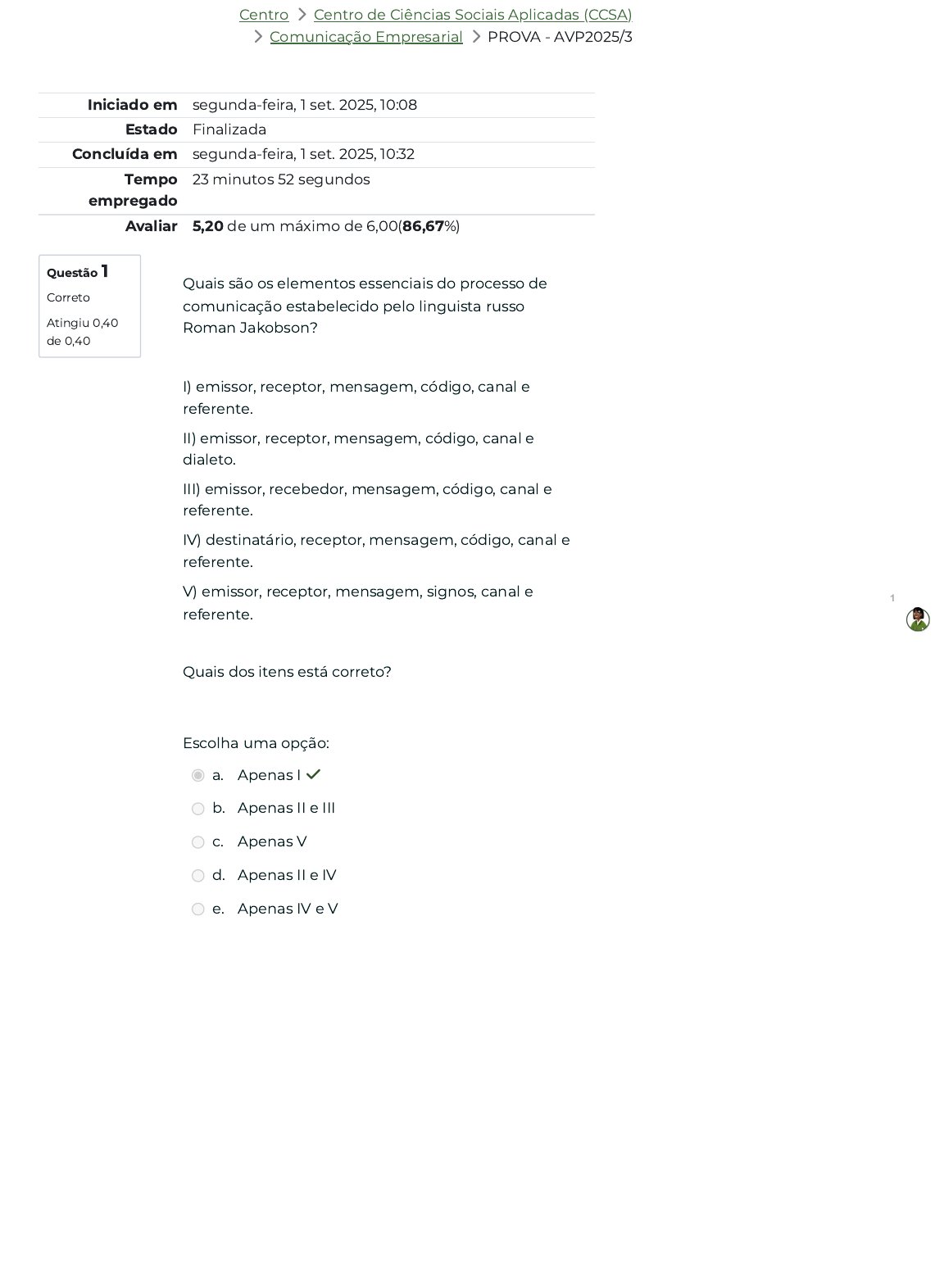 Centro 〉 Centro de Ciências Sociais Aplicadas (CCSA) 〉 Comunicação Empresarial 〉 PROVA - AVP2025/3 Questão 1 Correto Atingiu 0,40 de 0,40 Iniciado em segunda-feira, 1 set. 2025, 10:08 Estado Finalizada Concluída em segunda-feira, 1 set. 2025, 10:32 Tempo empregado 23 minutos 52 segundos Avaliar 5,20 de um máximo de 6,00(86,67%) Quais são os elementos essenciais do processo de comunicação estabelecido pelo linguista russo Roman Jakobson? I) emissor, receptor, mensagem, código, canal e referente. II) emissor, receptor, mensagem, código, canal e dialeto. III) emissor, recebedor, mensagem, código, canal e referente. IV) destinatário, receptor, mensagem, código, canal e referente. V) emissor, receptor, mensagem, signos, canal e referente. Quais dos itens está correto? Escolha uma opção: a. Apenas I ✓ b. Apenas II e III c. Apenas V d. Apenas II e IV e. Apenas IV e V 1 https://ava.graduacaoead.unicv.edu.br/course/index.php?categoryid=267 https://ava.graduacaoead.unicv.edu.br/course/index.php?categoryid=266 https://ava.graduacaoead.unicv.edu.br/course/view.php?id=13197#section-5 Questão 2 Correto Atingiu 0,40 de 0,40 As relações interpessoais podem ser entendidas como aquelas em que se estabelecem trocas, sejam de experiências, de mensagens, de atos, de diálogos e de todo e qualquer canal e forma de emitir e receber informação. Qual é o caminho para o sucesso das relações interpessoais? 1) quando o processo comunicativo consegue desenvolver-se do início ao fim sem que haja quebra ou ruídos que o impeçam de acontecer 2) quando o processo comunicativo consegue desenvolver-se em partes específicas da informação 3) quando o processo comunicativo consegue desenvolver-se do início ao fim mesmo havendo quebra ou ruídos na comunicação 4) quando o processo comunicativo consegue desenvolver-se do início ao fim mesmo que emissor e receptor não estejam ligados pelo referente 5) quando o processo comunicativo consegue começar sem a função fática Está correto o que se afirma em qual item? Escolha uma opção: a. Apenas 5 b. Apenas 4 c. Apenas 1 e 3 d. Apenas 2 e. Apenas 1 ✓ 1 Questão 3 Correto Atingiu 0,40 de 0,40 Sobre o item “Recomendações”, veja as afirmativas a seguir: I-Sempre que necessário, deve-se utilizar recurso de confirmação de leitura. Caso não esteja disponível, deve constar da mensagem pedido de confirmação de recebimento; II- Apesar da imensa lista de fontes disponíveis nos computadores, mantêm-se a recomendação de tipo de fonte, tamanho e cor dos documentos oficiais: Calibri ou Carlito, tamanho 12, cor preta; III - Fundo ou papéis de parede eletrônicos são recomendados para mensagens profissionais. Analise as afirmativas e marque a alternativa correta: Escolha uma opção: a. Apenas I e II estão corretas. ✓ b. Todas as alternativas estão corretas. c. Apenas II e III estão corretas. d. Apenas I está correta e. Todas estão incorretas. 1 Questão 4 Correto Atingiu 0,40 de 0,40 Massimo Di Felice um dos mais respeitados estudiosos de comunicação da atualidade afirma que a quarta revolução da comunicação ocorre nos dias atuais, e como as anteriores, “estaria ocasionando importantes transformações no interior dos distintos aspectos do convívio humano. Leia as assertivas a seguir e assinale a alternativa que corresponde ao pensamento do autor sobre a quarta revolução da comunicação. I. Pela primeira vez na história da humanidade, a comunicação se torna um processo de fluxo em que as velhas distinções entre emissor, meio e receptor se confundem e se trocam até estabelecer outras formas e outras dinâmicas de interação. II. Diante de nossos computadores ligados em redes é a única forma que podemos nos comunicar e a interagir com as pessoas em um diálogo constante. III. Surgem meios com a potencialidade de alcançar um público cada vez maior a custos cada vez menores, mas todos com base em um modelo de comunicação unidirecional, onde o público tem um papel apenas de receptor das mensagens. IV. As tecnologias digitais vêm alterando o processo e a forma de comunicar e expande o poder de cada sujeito integrante da sociedade em rede de participar, interagir e influenciar. Está correto o que se afirma em: Escolha uma opção: a. II, IV b. II, III e IV c. I, II, III e IV d. I e IV ✓ e. I, II e III 1 Questão 5 Correto Atingiu 0,40 de 0,40 Questão 6 Correto Atingiu 0,40 de 0,40 É preciso considerar na perspectiva construtivista que o ambiente material, assim como o ambiente social, está relacionado com a possibilidade do desenvolvimento da aprendizagem. O termo possibilidade se justifica, quando consideramos que são as ________ que as crianças constroem que as levam ao conhecimento, sendo assim o ambiente material e social está subordinado e, em última instância, esses ambientes não são significativos. O espaço vazio pode ser completado com o termo: Escolha uma opção: a. Hipóteses. ✓ b. Referências. c. Afirmativas. d. Experiências e. Certezas. Sobre o Acordo Ortográfico da Língua Portuguesa, analise as afirmativas a seguir: I- Foi assinado em Lisboa em 16 de Dezembro de 1990 II- Foi assinado por Angola, Brasil, Cabo Verde, Guiné -Bissau, Moçambique, Portugal e São Tomé e Príncipe. III- Ao longo dos anos vários decretos foram estabelecidos até que se chegasse ao acordo final. Assinale a alternativa correta: Escolha uma opção: a. I está incorreta. b. Todas as alternativas estão corretas. ✓ c. II e III estão incorretas d. Apenas II e III estão corretas e. Nenhuma alternativa está correta. 1 Questão 7 Correto Atingiu 0,40 de 0,40 Questão 8 Correto Atingiu 0,40 de 0,40 Estudar os gêneros textuais e os tipos de textos na escola é sempre um grande desafio, afinal são inúmeras opções e formatos que podemos trabalhar em sala de aula e abordar os mais variados aspectos dos mesmos. Argumentativo ou expositivo, é o tipo de texto mais solicitado em vestibulares e n