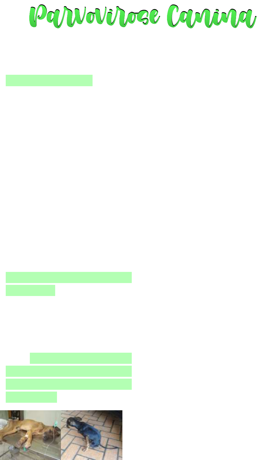 Parvovirose Canina @lilyfazvet O que é? A parvovirose é uma doença viral altamente contagiosa, sendo bastante comum entre os cães e que afeta principalmente as células do intestino; Ela pode ser controlada por meio de vacinas, mas alguns cães ainda correm o risco de contraí-la mesmo depois de vacinados. Transmissão: Normalmente a transmissão ocorre quando os animais acabam cheirando fezes, objetos e animais contaminados, facilitando a entrada do vírus em seus organismos; Vale ressaltar que o parvovírus pode permanecer por meses a fio no ambiente, sobrevivendo em objetos como comedouros, roupas, cobertores e até no piso. Quadro clínico: Os principais sintomas da doença são: vômito, letargia, anorexia, apatia, perda de peso repentina, diarreia sanguinolenta, mucosas pálidas e febre; Além disso, a parvovirose pode se manifestar de duas maneiras, a primeira e mais comum é a enterite, que causa problemas graves ao trato gastrointestinal do animal, já a outra forma remete o coração e pode provocar uma miocardite aguda, causando morte súbita em filhotes. Diagnóstico: É realizado a partir de exames de sangue e fezes, onde o vírus pode ser detectado caso esteja presente. Tratamento: Para a realização do tratamento, o animal deve ser internado em uma clinica veterinária, onde ele irá receber fluido e eletrólitos para repor os líquidos perdidos na desidratação; Além disso, o animal também precisará tomar antibióticos, medicamentos e rações específicas. Prevenção: A maneira mais eficaz de prevenir a parvovirose é por meio da vacinação e da visita regular a um medico veterinário. --