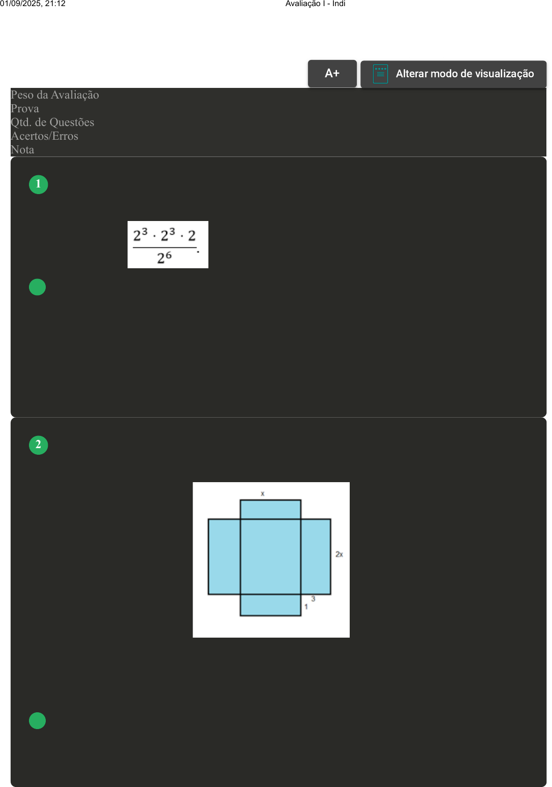 Prova Impressa GABARITO | Avaliação I - Individual (Cod.:740014) Peso da Avaliação 1,50 Prova 46405347 Qtd. de Questões 10 Acertos/Erros 8/2 Nota 8,00 As propriedades de potenciação são utilizadas em vários campos da matemática, como nos produtos notáveis, na fatoração de polinômios e demais operações polinomiais. Utilizando as propriedades de potenciação, assinale a alternativa CORRETA que apresenta o valor equivalente à expressão algébrica: A O valor da expressão algébrica é 2. B O valor da expressão algébrica é 8. C O valor da expressão algébrica é 1. D O valor da expressão algébrica é 3. Para calcular a área de um quadrado, basta que se multipliquem dois dos seus lados entre si. Para o cálculo de área de um retângulo, temos a multiplicação da base pela altura. Sendo assim, calcule a área da figura a seguir, representando uma multiplicação de monômios. Sobre o exposto, assinale a alternativa CORRETA: A A área está representada por 4x² + 6. B A área está representada por (2x + 1)(3 + 2x). C A área está representada por 2x² + 14x. D A área está representada por 2x² + 2x + 6. VOLTAR A+ Alterar modo de visualização 1 2 01/09/2025, 21:12 Avaliação I - Individual about:blank 1/4 A união dos conjuntos A, B e C resulta em 24 elementos. O conjunto A tem 4 elementos, o B tem 14 e o C tem 19. A e B tem 1 elemento, assim como A e C. Sabendo que B e C tem 9 elementos e que os conjuntos A, B e C sozinhos possuem 1, 3 e 8 elementos respectivamente, quantos elementos possui A ∩ B ∩ C? A 1. B 3. C 8. D 24. Na teoria de Cálculo, estudamos limites e para calcularmos, muitas vezes, precisamos utilizar recursos como divisão de polinômios ou produtos notáveis. Utilizando estes recursos, simplifique a fração algébrica A x² - x. B x² + 2x + 1. C x² + x - 1. D x(x² + x). Monômios são a forma mais simples de expressão algébrica, com eles podemos realizar várias operações matemáticas. Uma dessas operações é a multiplicação. Sabendo disso, determine o resultado de 2x . 3x: A 9x². B 6x². C 9x. D 6x. 3 Revisar Conteúdo do Livro 4 5 01/09/2025, 21:12 Avaliação I - Individual about:blank 2/4 Um intervalo no conjunto dos números reais é um conjunto que contém todos os números reais que estão entre os dois extremos, por exemplo, (2,5] é o intervalo que contém todos os números reais que são maiores que 2 e menores e iguais a 5. Dados os intervalos A = ( -1, 3), B = [1, 4], C = [2,3), D = (1,2] e E = (0, 2], determine e assinale a alternativa CORRETA: A [1, 2) B (1, 2] C [1, 2] D (1, 2) Analise a situação: João comeu 1/3 de uma torta. Camilo comeu 5/12 da mesma torta. Qual a fração total da torta que foi comida? A O total comido é de 3 partes de 4. B O total comido é de 1 partes de 4. C O total comido é de 1 partes de 2. D O total comido é de 2 partes de 5. A transformação de um número fracionário para um número decimal é muito utilizada no dia a dia. Sobre o exposto, analise a imagem a seguir: A A letra A corresponde a 1,5. B A letra E corresponde a 9,5. C A letra D corresponde a 1,5. D A letra B corresponde a 0,8. De acordo com as definições de frações, o percentual é a indicação de uma divisão por cem, sendo assim, podemos afirmar que 60% de 200 tem o mesmo valor que o triplo da quinta parte de 200? Quanto é esse valor? A 6 7 8 9 01/09/2025, 21:12 Avaliação I - Individual about:blank 3/4 Sim, o valor é de 40. B Não, pois uma representa 120 e o outro 40. C Sim, o valor é de 120. D Não, pois um representa 60 e o outro 40. O sinal do expoente negativo indica que a base das potências deve ser invertida e, simultaneamente, devemos trocar o expoente negativo pelo seu valor positivo para podermos resolver. Utilizando a propriedade de potenciação descrita determine o valor da expressão: A O valor da expressão é 1/8. B O valor da expressão é 15/8. C O valor da expressão é -15/8. D O valor da expressão é -1/8. 10 Revisar Conteúdo do Livro Imprimir 01/09/2025, 21:12 Avaliação I - Individual about:blank 4/4