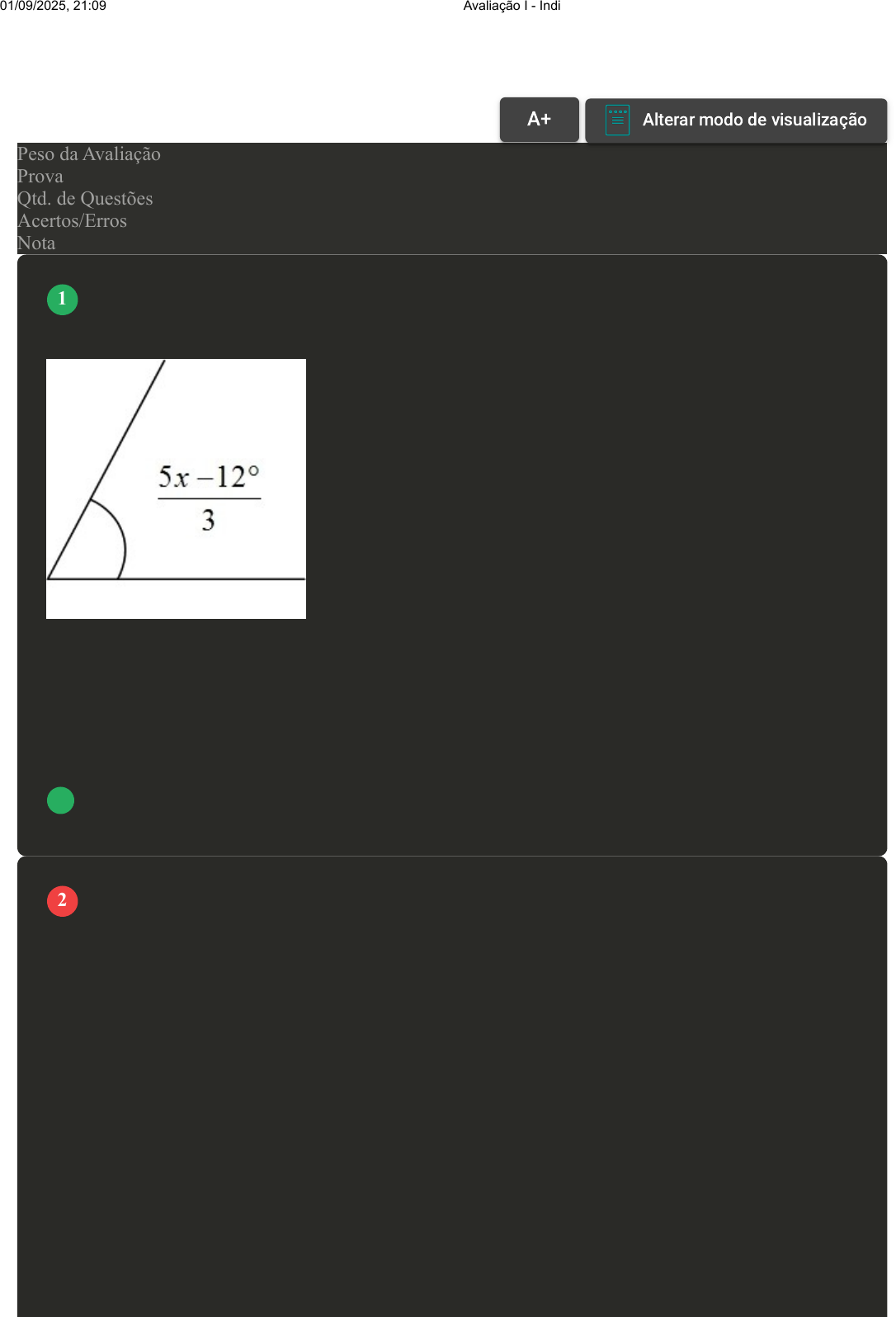 Prova Impressa GABARITO | Avaliação I - Individual (Cod.:741858) Peso da Avaliação 1,50 Prova 51685905 Qtd. de Questões 10 Acertos/Erros 5/5 Nota 5,00 O ângulo é suplementar ao outro quando a soma dos dois ângulos forma exatamente a metade de uma circunferência perfeita. Baseado nestas informações, analise a imagem anexa e determine o valor de x, sabendo que este ângulo representado pela equação é suplementar do ângulo 135°: A O valor de x é 110,4. B O valor de x é 83,4. C O valor de x é 45. D O valor de x é 29,4. No desenvolvimento de desenhos na geometria descritiva, faz-se a utilização de ferramentas de auxílio de desenho, assim como de etapas no desenho que facilitam o seu desenvolvimento. Dentre essas etapas, podemos citar a obtenção de marcações de ângulos, como 30º, 60º entre outros métodos. Com relação à figura anexa, determine o que o ponto vermelho representa nos desenhos: I- a) Representa o ponto de bissetriz; b) representa os pontos de mediatriz; c) representa o ponto de bissetriz. II- a) Representa o ponto inicial; b) representa o ponto para transposição do ângulo; c) representa o ângulo de 45º. III- a) Representa o ponto de intersecção; b) representa o ponto de bissetriz; c) representa os pontos de mediatriz. IV - a) Representa o ponto de bissetriz; b) representa o ponto para transposição do ângulo; c) representa o ponto inicial. VOLTAR A+ Alterar modo de visualização 1 2 01/09/2025, 21:09 Avaliação I - Individual about:blank 1/5 Assinale a alternativa CORRETA: A Somente a sentença IV está correta. B Somente a sentença III está correta. C Somente a sentença I está correta. D Somente a sentença II está correta. Existem alguns ângulos que tem maior facilidade de serem construídos, como o é o caso do ângulo de 180º ou ângulo raso, que representa metade de uma circunferência, e o de 360º, que representa uma circunferência completa. Temos também os ângulos de 60º e 120º. Sobre o processo de construção de um ângulo de 60º, classifique V para as sentenças verdadeiras e F para as falsas: ( ) Traçar um segmento de reta qualquer. ( ) Marcar um ponto sobre o segmento de reta, preferencialmente ao meio, evidenciando o ponto inicial. Revisar Conteúdo do Livro 3 01/09/2025, 21:09 Avaliação I - Individual about:blank 2/5 ( ) Colocar a ponta seca do compasso no ponto inicial e construir uma meia lua. ( ) Colocar a ponta seca do compasso na extremidade do segmento de reta e construir uma meia lua. ( ) Colocar a ponta seca do compasso no ponto de intersecção, mantendo a mesma abertura usada para construir a meia lua e traçar uma marca sobre essa meia lua. Assinale a alternativa que apresenta a sequência CORRETA: A F - V - F - F - V. B V - V - V - F - V. C V - F - V - V - V. D V - V - F - V - F. Com relação aos elementos de geometria descritiva, podemos definir a bissetriz de um ângulo como: qualquer semi-reta que divide esse ângulo em dois ângulos congruentes. Com base na definição dos ângulos congruentes, assinale a alternativa CORRETA: A São ângulos que possuem a mesma medida; B São ângulos que possuem a mesma intensidade. C São ângulos que possuem a mesma largura; D São ângulos que possuem o mesmo comprimento; Para demonstrar retas perpendiculares, podemos utilizar o conhecimento utilizado na construção de um ângulo reto. Geralmente, os desenhos que representam retas perpendiculares são construídos utilizando esquadros. Assinale a alternativa CORRETA que melhor define quando duas retas r e s serão perpendiculares: A Formarem um ângulo de 90º e sejam coplanares. B Tiverem um ponto em comum e ângulo obtuso. C Forem reversas e formarem um ângulo de 90º. D Não tiverem um plano que as contenha simultaneamente. Analise a figura em anexo, determine o valor de x dos ângulos e, de acordo com as sentenças a seguir, verifique qual ou quais sentenças a seguir reproduzem, respectivamente, as incógnitas que constam na figura. Alfa = 4x + 8 e Beta = 3x + 3. Revisar Conteúdo do Livro 4 5 Revisar Conteúdo do Livro 6 01/09/2025, 21:09 Avaliação I - Individual about:blank 3/5 I- O ângulo alfa é obtuso e corresponde a 104,57° e o ângulo beta é agudo e corresponde a 75,43°. II- O valor de x corresponde a 24,14 e os ângulos alfa e beta são suplementares. III- O valor de x corresponde a 30 e os ângulos alfa e beta são complementares. IV- O ângulo alfa é agudo e corresponde a 45° e o ângulo beta é obtuso e corresponde a 135°. Assinale a alternativa CORRETA: A Somente a sentença IV está correta. B Somente as sentenças II e IV estão corretas. C Somente as sentenças I e II estão corretas. D Somente as sentenças II e III estão corretas. As formas geométricas são formas específicas utilizadas para estudo de todas as figuras geométricas. As retas são figuras geométricas primitivas formadas por um conjunto de pontos e quando se cruzam em um determinado instante com um ângulo de 90º (graus) entre elas, são chamadas de retas perpendiculares. Sobre a mediatriz, assinale a alternativa CORRETA: A Uma reta que divide um segmento AB qualquer em duas partes iguais. B É o nome dado a qualquer ângulo maior que 180º. C Uma semirreta que divide o ângulo ao meio. D A metade da medida de um ângulo agudo. Segundo Machado (1973, p. 11), "a Geometria Descritiva tem por finalidade representar no plano as figuras do espaço, de modo que podemos, com o auxílio da Geometria Plana, estudar suas propriedades e resolver os problemas relativos a elas". Com base no exposto, classifique V para as sentenças verdadeiras e F para as falsas: ( ) Geometria estuda as figuras e os objetos, visando, através das propriedades dos seus elementos, caracterizar e padronizar as suas formas e dimensões. ( ) Formas geométricas são formas específicas que são usadas no estudo das figuras em geometria. ( ) Postulados são proposições que precisam ser provadas matematicamente. ( ) Conceitos e propried