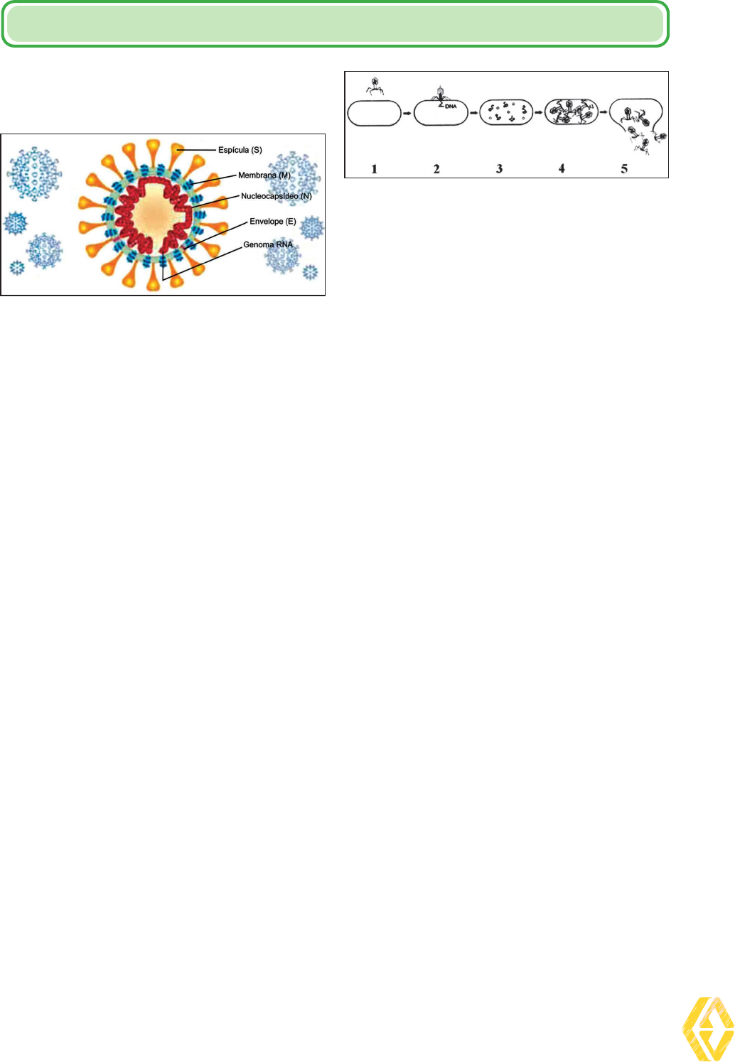 23 BI O LO G IA IV ATIVIDADES 1. (FMABC SP) A gura ilustra a organização es- trutural do SARS-CoV-2, vírus envelopado, agente etiológico da covid-19. (https://jornal.usp.br) Com base no mecanismo de replicação viral do SARS-CoV-2, a função desempenhada a) pelo envelope é promover as trocas de subs- tâncias entre o vírus e as células-alvo. b) pelo nucleocapsídeo é regular o metabolismo viral. c) pelas espículas é adsorver o vírus nas células- -alvo. d) pelo genoma de RNA é sintetizar diretamente todas as moléculas virais. e) pela membrana é proteger as organelas virais. 2. (UnirG TO) Os Coronavírus são vírus que cau- sam infecções respiratórias e, muito embora a pandemia pelo Coronavírus seja recente, já se conhece esse grupo de vírus desde a década de 1960. Os vírus não apresentam metabolis- mo próprio e se reproduzem dentro das célu- las hospedeiras. Sobre a reprodução dos vírus marque, entre as alternativas, a única resposta correta: a) Os vírus se reproduzem através do processo de bipartição, em que a célula hospedeira se divide em duas e multiplica o DNA do vírus. b) Os vírus se reproduzem por conjugação, em que ocorre o pareamento dos vírus em duas células hospedeiras com troca de material ge- nético, aumentando a variabilidade gênica dos vírus. c) Os vírus se reproduzem por replicação, sendo necessária a penetração na célula hospedei- ra e a posterior alteração no metabolismo para geração de novos vírus. d) Os vírus se reproduzem por fragmentação, em que o material genético do vírus se frag- menta após a entrada no hospedeiro e tais fragmentos invadem novas células gerando novos vírus. 3. (FPS PE) Os vírus são parasitas obrigató- rios de seres vivos, morfologicamente mui- to simples, que têm como material genético DNA ou RNA. Analise o desenho esquemáti- co a seguir. Disponível em: Acesso em 16 out. 2017. (Adaptado). Numere, em conformidade com o esquema acima, as diversas fases cumpridas pelos ví- rus ao invadir uma célula. ( ) Replicação do DNA viral. ( ) Montagem de novos vírus. ( ) Ataque do vírus a célula bacteriana. ( ) Penetração do DNA. ( ) Lise celular. A sequência correta, de cima para baixo, é: a) 1, 5, 2, 3 e 4. b) 2, 3, 4, 1 e 5. c) 5, 1, 4, 2 e 3. d) 3, 4, 1, 2 e 5. e) 4, 1, 3, 5 e 2. 4. (UNIT AL) Na análise dos vírus, observa-se que eles são dotados de diversas característi- cas. Dentre as características dos seres vivos, aquela que pode ser encontrada nos vírus é a) evidenciar presença de organelas que aten- dem suas necessidades metabólicas. b) sofrer mutação quando se encontra no interior da célula hospedeira. c) possuir uma maquinaria biossintética, depen- dente de seus ribossomos. d) apresentar uma membrana plasmática envol- vendo seu material genético. e) apresentar DNA, RNA e proteínas que partici- pam de sua organização procariótica. 5. (FGV) O uxo de água do meio hipotônico pa- ra o meio hipertônico através da membrana li- poproteica semipermeável é denominado os- mose, essencial para a manutenção das con- dições siológicas citoplasmáticas em todos os organismos celulares. Com relação a esse processo, é correto ar- mar que os vírus a) não o realizam, pois não apresentam as carac- terísticas siológicas e celulares para ocorrên- cia do processo. b) só o realizam quando metabolicamente ativos no momento de infecção em suas células-alvo hospedeiras. c) o realizam diretamente através do cápside, seu envoltório proteico de proteção. BI O LO G IA IV 24 d) só o realizam se forem classicados como en- velopados, por apresentarem membrana e ci- toplasma celulares. e) não o realizam, pois apresentam a primitiva or- ganização celular procarionte. 6. (UNITAU SP) Vírus é uma palavra latina que signica “veneno”. O uso dessa palavra para designar um certo grupo de organismos tem, provavelmente, relação com as enfermidades que eles podem causar, como o ebola, a varío- la e a AIDS, entre outras. Sobre os vírus, assinale a alternativa INCOR- RETA. a) Vírus envelopados apresentam um revestimen- to lipoproteico ao redor do nucleocapsídeo. b) O material genético dos vírus pode ser de RNA ou DNA, dependendo do tipo de vírus. c) Vírus apresentam ação especíca, e os que in- fectam bactérias são os bacteriófagos. d) O vírus da AIDS é um retrovírus, e seu RNA é transcrito em DNA pela transcriptase reversa. e) Os bacteriófagos têm dois ciclos reprodutivos, o ciclo lítico e o lipoalergênico. 7. (Unicamp SP) O papilomavírus humano (HPV) é um grupo de vírus muito comum no mundo. Existem muitos tipos de HPV e a maioria deles não causa problemas ao organismo humano. Porém, os tipos de HPV 16 e 18 estão associa- dos com 70% dos casos de cânceres de colo do útero e lesões genitais pré-cancerosas. (Adaptado de https://www.paho.org/pt/topicos/hpv-e-cancer- -do-colo-do-utero. Acesso em 01/06/2022.) É correto armar que o HPV é transmitido: a) principalmente por contato sexual; o uso de preservativo elimina a possibilidade de infec- ção pelos HPV 16 e 18, sendo indicado quan- do existe exposição ao vírus. b) por contato direto com a pele ou mucosa in- fectada, sobretudo durante a relação sexual; a vacinação pode tratar a infecção e as doenças associadas aos diversos tipos de HPV. c) principalmente por contato sexual; o controle da infecção inclui a prevenção pela vacinação contra os HPV 16 e 18, sendo indicada antes da exposição ao vírus. d) por contato direto com a pele ou mucosa in- fectada, sobretudo durante a relação sexual; o uso de preservativo impede o desenvolvimen- to das doenças associadas ao HPV. 8. (Fuvest SP) No que diz respeito a infecções sexualmente transmissíveis (ISTs), identi- que a relação correta entre grupo causador, um dos seus sintomas e se possui ou não va- cina preventiva. IST Causador Um dos possíveis sintomas Possui vacina? a) Gonorreia Neisseria gonor- rhoe