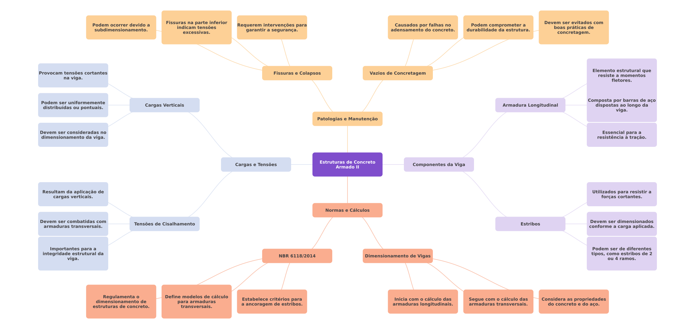 Fissuras na parte inferior Devem ser evitados com Podem ocorrer devido a indicam tensões Requerem intervenções para Causados por falhas no Podem comprometer a subdimensionamento. garantir a segurança. adensamento do concreto. durabilidade da estrutura. boas práticas de excessivas. concretagem. Provocam tensões cortantes Elemento estrutural que Fissuras e Colapsos Vazios de Concretagem resiste a momentos na viga. fletores. Podem ser uniformemente Composta por barras de aço distribuídas ou pontuais. Cargas Verticais Armadura Longitudinal dispostas ao longo da viga. Patologias e Manutenção Devem ser consideradas no Essencial para a dimensionamento da viga. resistência à tração. Estruturas de Concreto Cargas e Tensões Armado II Componentes da Viga Resultam da aplicação de Utilizados para resistir a cargas verticais. forças cortantes. Normas e Cálculos Devem ser combatidas com Devem ser dimensionados Tensões de Cisalhamento Estribos armaduras transversais. conforme a carga aplicada. Importantes para a Podem ser de diferentes integridade estrutural da NBR 6118/2014 Dimensionamento de Vigas tipos, como estribos de 2 viga. ou 4 ramos. Regulamenta Define modelos de cálculo Estabelece critérios para Inicia com cálculo das dimensionamento de para armaduras Segue com cálculo das Considera as propriedades estruturas de concreto. transversais. a ancoragem de estribos. armaduras longitudinais. armaduras transversais. do concreto e do aço.