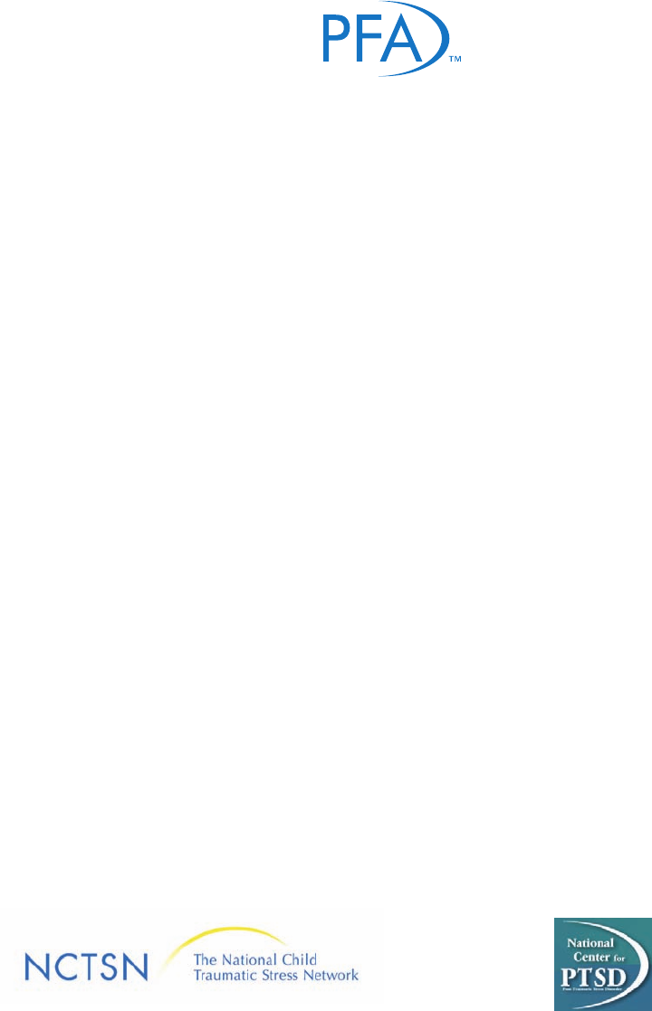 PSYCHOLOGICAL FIRST AID Field Operations Guide 2nd Edition National Child Traumatic Stress Network National Center for PTSD National Child Traumatic Stress Network Established by Congress in 2000, the National Child Traumatic Stress Network (NCTSN) is a unique collaboration of academic and community-based service centers whose mission is to raise the standard of care and increase access to services for traumatized children and their families across the United States. Combining knowledge of child development, expertise in the full range of child traumatic experiences, and attention to cultural perspectives, the NCTSN serves as a national resource for developing and disseminating evidence-based interventions, trauma-informed services, and public and professional education. National Center for PTSD VA’s National Center for PTSD is a world leader in research and education programs focusing on PTSD and other psychological and medical consequences of traumatic stress. Mandated by Congress in 1989, the Center is a consortium of seven academic centers of excellence providing research, education and consultation in the field of traumatic stress. The views, opinions, and content are those of the authors, and do not necessarily reflect those of SAMHSA or HHS. Copyright © 2006 Brymer M, Jacobs A, Layne C, Pynoos R, Ruzek J, Steinberg A, Vernberg E, Watson P, (National Child Traumatic Stress Network and National Center for PTSD). All rights reserved. You are welcome to copy or redistribute this material in print or electronically provided the text is not modified, the authors and the National Child Traumatic Stress Network (NCTSN) and National Center for PTSD (NCPTSD) are cited in any use, and no fee is charged for copies of this publication. Unauthorized commercial publication or exploitation of this material is specifically prohibited. Anyone wishing to use any of this material for commercial use must request and receive prior written permission from the NCTSN. Permission for such use is granted on a case-by-case basis at the sole discretion of NCTSN. If you would like permission to adapt or license these materials, please contact Melissa Brymer, Psy.D. at mbrymer@mednet.ucla.edu. Other inquires can be directed to the NCTSN National Resource Center at info@nctsn.org or (919) 682-1552. Acknowledgements...............................................................................................................................1 Introduction.and.Overview..................................................................................................................5 Preparing.to.Deliver.Psychological.First.Aid...................................................................................13 Core.Actions........................................................................................................................................19 1. Contact and Engagement .....................................................................................................23 2. Safety and Comfort ..............................................................................................................27 3. Stabilization (if needed).......................................................................................................49 4. Information Gathering: Needs and Current Concerns .........................................................57 5. Practical Assistance ..............................................................................................................65 6. Connection with Social Supports.........................................................................................69 7. Information on Coping.........................................................................................................77 8. Linkage with Collaborative Services ...................................................................................93 LIST.OF.APPENDICES:...................................................................................................................97 Appendix.A:. Overview of Psychological First Aid .............................................................................................99 Appendix.B:. Service Delivery Sites and Settings .............................................................................................103 Appendix.C:. Psychological First Aid Provider Care .........................................................................................109 Appendix.D:. Psychological First Aid Worksheets ............................................................................................119 Appendix.E:. Handouts for Survivors ................................................................................................................125 Appendix.F:. Duplicate Handouts to Copy and Distribute Psychological First Aid Table of Contents Psychological First Aid - Field Operations Guide I .This.page.intentionally.left.blank. Acknowledgements This Psychological First Aid Field Operations Guide was developed by the National Child Traumatic Stress Network and the National Center for PTSD. Members of the National Child Traumatic Stress Network and the National Center for PTSD, as well as other individuals involved in coordinating and participating in disaster response, have contributed to the current document. The principal authors (in alphabetical order) included: Melissa Brymer, Christopher Layne, Anne Jacobs, Robert Pynoos, Josef Ruzek, Alan Steinberg, Eric Vernberg, and Patricia Watson. Special contributors included: Steve Berkowitz, Dora Black, Carrie Epstein, Julian Ford, Laura Gibson, Robin Gurwitch, Jack Herrmann, Jessica Hamblen, Russell Jones, Robert Macy, William Saltzman, Janine Shelby, Merritt Schreiber, Betty Pfefferbaum, Rose Pfefferbaum, Margaret Samuels, Cynthia Whitham, Bonita Wirth, and Bruce Young. Additional material for this Psychological First Aid Field Operations Guide was drawn from an adaptation by the Medical Res