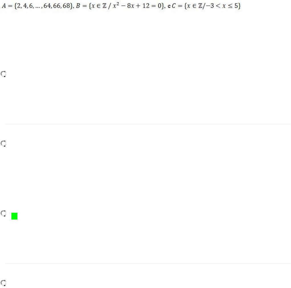 O conjunto A é o conjunto de todos os números pares de 2 até 68. O conjunto B é solução da equação do segundo grau, ou seja, as raízes 6 e 2. Por fim, o conjunto C são os números –2, –1, 0, 1, 2, 3, 4, 5. Dessa forma, a sequência correta será: A ⊃ B, B ⊂ A, 36 ∈ A, 6 ∈ B, –3 ∉ C.