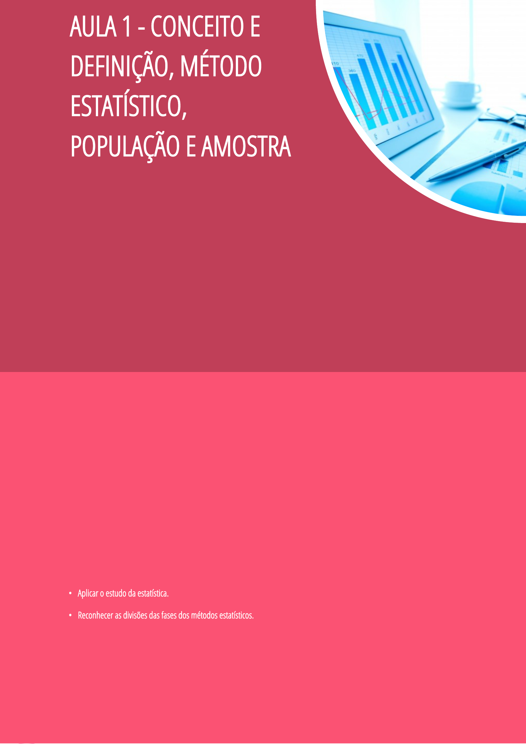 AULA 1 - CONCEITO E DEFINIÇÃO, MÉTODO ESTATÍSTICO, POPULAÇÃO E AMOSTRA • Aplicar o estudo da estatística. • Reconhecer as divisões das fases dos métodos estatísticos. CONTEXTUALIZANDO A APRENDIZAGEM Caro(a) Aluno(a), seja bem-vindo(a) à mais uma disciplina. Aqui, trataremos as noções básicas de estatística. Durante nossos estudos, você perceberá que a estatística se apresenta como uma disciplina muito importante, porque, pode ser utilizada como ferramenta que associa dados aos problemas reais, gerando informações relevantes para o estabelecimento de conclusões capazes de viabilizar a tomada de decisões em ambientes de incertezas e variações. Imagine que durante um telejornal o repórter divulga uma pesquisa, segundo a qual apenas 5% dos brasileiros têm hábito de ler jornal diariamente. Você já pensou em como essas pesquisas são realizadas? É possível entrevistarmos toda a população brasileira para sabermos qual a porcentagem de brasileiros que possuem hábito de ler diariamente jornal? A partir do estudo de dados, conseguimos tirar diversas informações sobre uma determinada situação, problema ou até mesmo empresa como, por exemplo, onde os riscos seriam menores nessa empresa, a viabilidade de um investimento, dentre outros. Assim, podemos perceber que, cada vez mais, a estatística é utilizada como ferramenta vital dentro da organização. Além disso, o funcionário que tem maior conhecimento na área está ganhando mais espaço no mercado e se valorizando. Por isso, na Aula 1, iremos abordar o conceito de estatística, a partir de vários estudiosos dessa área, os métodos estatísticos, população e amostra. Preparado(a) para conhecer mais sobre o mundo da estatística? Então prossiga e bons estudos! Mapa mental panorâmico Para contextualizar e ajudá-lo(a) a obter uma visão panorâmica dos conteúdos que você estudará na Aula 1, bem como entender a inter- relação entre eles, é importante que se atente para o Mapa Mental, apresentado a seguir: CONCEITO E DEFINIÇÃO, MÉTODO ESTATÍSTICO, POPULAÇÃO E AMOSTRA 1 INTRODUÇÃO À ESTATÍSTICA 1.1 CONCEITO E DEFINIÇÃO 1.1.1 HISTÓRIA E EVOLUÇÃO 1.1.2 IMPORTÂNCIA DA ESTATÍSTICA 1.2.3 A IMPORTÂNCIA DA ESTATÍSTICA NAS QUATRO ÁREAS DA EMPRESA 2 GRANDES ÁREAS DA ESTATÍSTICA 2.1 TERMOS DE UMA PESQUISA ESTATÍSTICA 2.1.1 POPULAÇÃO, AMOSTRA E VARIÁVEL 3 MÉTODO ESTATÍSTICO CONCEITO E DEFINIÇÃO, MÉTODO ESTATÍSTICO, POPULAÇÃO E AMOSTRA 1 INTRODUÇÃO À ESTATÍSTICA Podemos entender a estatística como sendo um método de estudo de comportamento coletivo cujas conclusões apresentam resultados numéricos. Pois bem, seguindo esse raciocínio podemos concluir que a Estatística torna-se parte fundamental de diversas áreas, principalmente, da área de pesquisas científicas. Através dessa área é possível aumentar o lucro das empresas, aumentar a qualidade dos processos ou produtos, minimizar custos, tomar decisões de valor político ou econômico, aumentar a análise crítica, entre outros. Ao analisar uma empresa em suas quatro principais áreas: finanças, produção, marketing e recursos humanos, percebe-se que os métodos estatísticos influenciam diretamente ou indiretamente cada um desses elementos. Enquanto nas finanças e na produção são feitas análises que apontam valores quantitativos e são afetadas diretamente por esses resultados, nas áreas de marketing e recursos humanos esses impactos ocorrem de forma indireta. Reconhecendo as áreas citadas verifica-se um enorme potencial de crescimento da empresa. Presume-se utilizar dos conceitos e das fórmulas da área como indicadores de decisão para as empresas e solução de problemas. A estatística faz parte da área de estudo de pesquisa operacional que oferece ferramentas para identificar problemas através de seus sintomas e procurar solucioná-los para tomar a decisão correta (ANDRADE, 2009). 1.1 CONCEITO E DEFINIÇÃO A palavra estatística lembra, para grande parte das pessoas, recenseamento. Os censos existem há milhares de anos e constituem um esforço imenso e caro feito pelos governos, com o objetivo de conhecer seus habitantes, sua condição socioeconômica, sua cultura, religião, etc. Portanto, associar estatística a censo é perfeitamente correto do ponto de vista histórico, sendo interessante salientar que as palavras estatística e estado têm a mesma origem latina: status. De acordo com Vieira (2013, p.1), “a estatística é a ciência que fornece os princípios e a metodologia para coleta, organização, apresentação, resumo, análise e interpretação de dados”. Para Bernonville citado por Falco (2008, p.12): a “Estatística é um conjunto de métodos e processos quantitativos que serve para estudar e medir os fenômenos coletivos”. A estatística é também comumente associada às pesquisas de opinião pública, aos vários índices governamentais, aos gráficos e às médias publicados diariamente na imprensa. Na realidade, entretanto, a estatística engloba muitos outros aspectos, sendo fundamental na análise de dados provenientes de quaisquer processos onde exista variabilidade. É possível distinguir duas concepções para a palavra ESTATÍSTICA: plural e singular. No plural (estatísticas), indica qualquer coleção de dados numéricos, reunidos com a finalidade de fornecer informações acerca de uma atividade qualquer. Assim, por exemplo, as estatísticas demográficas referem-se aos dados numéricos sobre nascimentos, falecimentos, matrimônios, desquites, etc. As estatísticas econômicas consistem em dados numéricos relacionados com emprego, produção, vendas e com outras atividades ligadas aos vários setores da vida econômica. No singular (estatística), indica a atividade humana especializada ou um corpo de técnicas, ou ainda uma metodologia desenvolvida para a coleta, a classificação, a apresentação, a análise e a interpretação de dados quantitati