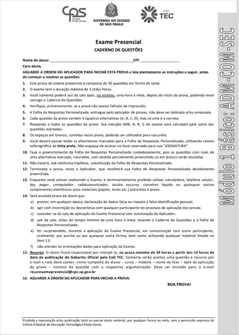 Estadual de Educação Tecnológica Paula Souza. Estadual de Educação Tecnológica Paula Souza. Questão 01 Questão 02 LEIA O TEXTO A SEGUIR. ELE CONTÉM AS INFORMAÇÕES NECESSÁRIAS PARA VOCÊ RESPONDER ÀS QUESTÕES 03 E 04. Exame Presencial – Módulo I A Administração possui quatro funções básicas que se relacionam com a organização dos recursos tecnológicos, financeiros, humanos, além de material para que ela possa atingir, com o máximo de eficiência e eficácia, seus objetivos e resultados previstos. Considere essas informações e assinale a seguir a ação pautada na função planejar: (A) A empresa GG-Calçados aplicou recursos financeiros na compra de novos modelos que serão vendidos em uma futura campanha promocional da empresa. (B) Murilo comprou carnes e bebidas para fazer um churrasco com a vizinhança e os colegas de trabalho da empresa XPTO Bolsas e Acessórios. (C) A empresa TopWinne produziu dois lotes de vinhos especiais para distribuir como brindes promocionais aos clientes denominados premium. (D) Lucas traçou como objetivo viajar para a China e, para isso, determinou que Marta, sua esposa, reserve 30% dos seus ganhos para a viagem. Ser empreendedor Geralmente, o empreendedor é associado à pessoa que abre o próprio negócio. No entanto, hoje, existe o conceito de empreendedorismo corporativo. Isso significa que o empregado deve ver a organização em que trabalha como se fosse sua e ter uma postura proativa, ou seja: • estar aberto às novidades, aprendendo sempre; • estar atento às mudanças no ambiente externo; • propor mudanças, inovações e melhorias que possam aumentar a eficiência e a eficácia da organização; • antecipar-se aos processos de mudança, colaborando para tornar a organização dinâmica e inovadora. (Agendas de Estudo, Módulo I, p. 10.) Tendo o texto como referência, analise as alternativas a seguir e assinale aquela que seja adequada à atitude de um empreendedor corporativo: (A) Teodoro foi contratado pela Revista Evidência para trabalhar com artes e desenhos. Anteriormente, trabalhou como desenhista de revista em quadrinhos, desenhando ótimas imagens que ilustravam suas revistas. (B) Noemi orienta um grupo de funcionários da Rede de Farmácia FarMaior. Eles cumprem à risca as orientações recebidas, utilizam os recursos disponíveis para o trabalho e participam das reuniões quando convidados. (C) Laura é funcionária de uma escola de música. Ela participa de capacitações e de treinamentos para os cursos online que a escola oferece. É uma das melhores da turma, com notas altas e sem falta alguma. (D) Clóvis trabalha na oficina FirstCar. Em seu segundo mês, ele organizou a recepção dos carros e a fila de atendimento e, além disso, sugeriu a compra de parafusadeiras pneumáticas para acelerar o trabalho. A personagem Mônica, que foi criada pelo cartunista Mauricio de Sousa no início da década de 60 especialmente para homenagear sua filha, retribuirá o carinho dos leitores de um jeito descolado. A baixinha, gorducha e dentuça apostará nos novos companheiros de crianças, adolescentes e adultos: os smartphones e tablets. A companhia Mauricio de Sousa Produções lança o primeiro jogo da Mônica para plataformas com Proibida a reprodução e/ou publicação total ou parcial deste material, por qualquer forma ou meio, sem a permissão expressa do Centro Estadual de Educação Tecnológica Paula Souza. Questão 03 Questão 04 “Planejar representa a forma como a empresa pretende atingir os objetivos e as metas propostas. Se o planejamento realizado não for executado, acompanhado, controlado e o mais importante, corrigido se necessário, de nada adiantará realizá-lo.” Exame Presencial – Módulo I sistemas operacionais da Apple e Android. "Teremos mais de dez aplicativos, como jogos para crianças, revistas digitais e até guias turísticos, só que agora voltado para os pais”, garante o gerente de produtos digitais da MSP. No futuro, o foco é apostar em um aplicativo para leitura dos gibis, que reunirá também uma banca virtual para adquirir os quadrinhos. É a Mônica do mundo moderno, agora cada vez mais móvel e conectada. A MSP, como qualquer outra empresa, necessita acompanhar a evolução do mundo para manter-se atualizada. Essa estratégia ficou evidenciada quando a empresa (A) conquistou um público maior ao adotar aplicativos e jogos digitais que trouxeram a antiga personagem para o contexto atual, ganhando um número maior de leitores infantis. (B) decidiu investir em relacionamento com os pais das crianças que são o público-alvo da personagem Mônica, por meio de gibis vendidos em bancas virtuais para os adultos. (C) selecionou, como público atual, os pais de adolescentes que interagem por meio de tecnologias para acessar a versão das histórias da Mônica que antes eram lidas em gibis. (D) percebeu que, para atingir um público mais diversificado, precisava acompanhar a evolução da tecnologia, adequando a forma de leitura para diversos aplicativos informatizados. A MSP está atenta às mudanças que ocorrem ao seu redor e busca tomar decisões que a mantenha no mercado. Tendo essas informações como referência, analise os itens a seguir. 1. Facilidade de acesso à tecnologia. 2. Popularização de tecnologias interativas. 3. Maior qualidade de vida do público-alvo. É válido afirmar que exerce influência nas decisões da MSP, o contido em: (A) 2, somente. (B) 1 e 2, somente. (C) 1 e 3, somente. (D) 2 e 3, somente. Um grupo de estagiários recém-contratados por uma empresa deverá pesquisar e apresentar um trabalho sobre a importância do planejamento para o sucesso de um empreendimento. Eles deverão iniciar a pesquisa partindo do seguinte conceito proposto pela empresa: Para completar o texto apresentado, os estagiários listaram algumas afirmações que possivelmente integrarão o trabalho. Analise-as a seguir: 1. O processo de planejamento deve ser dinâm