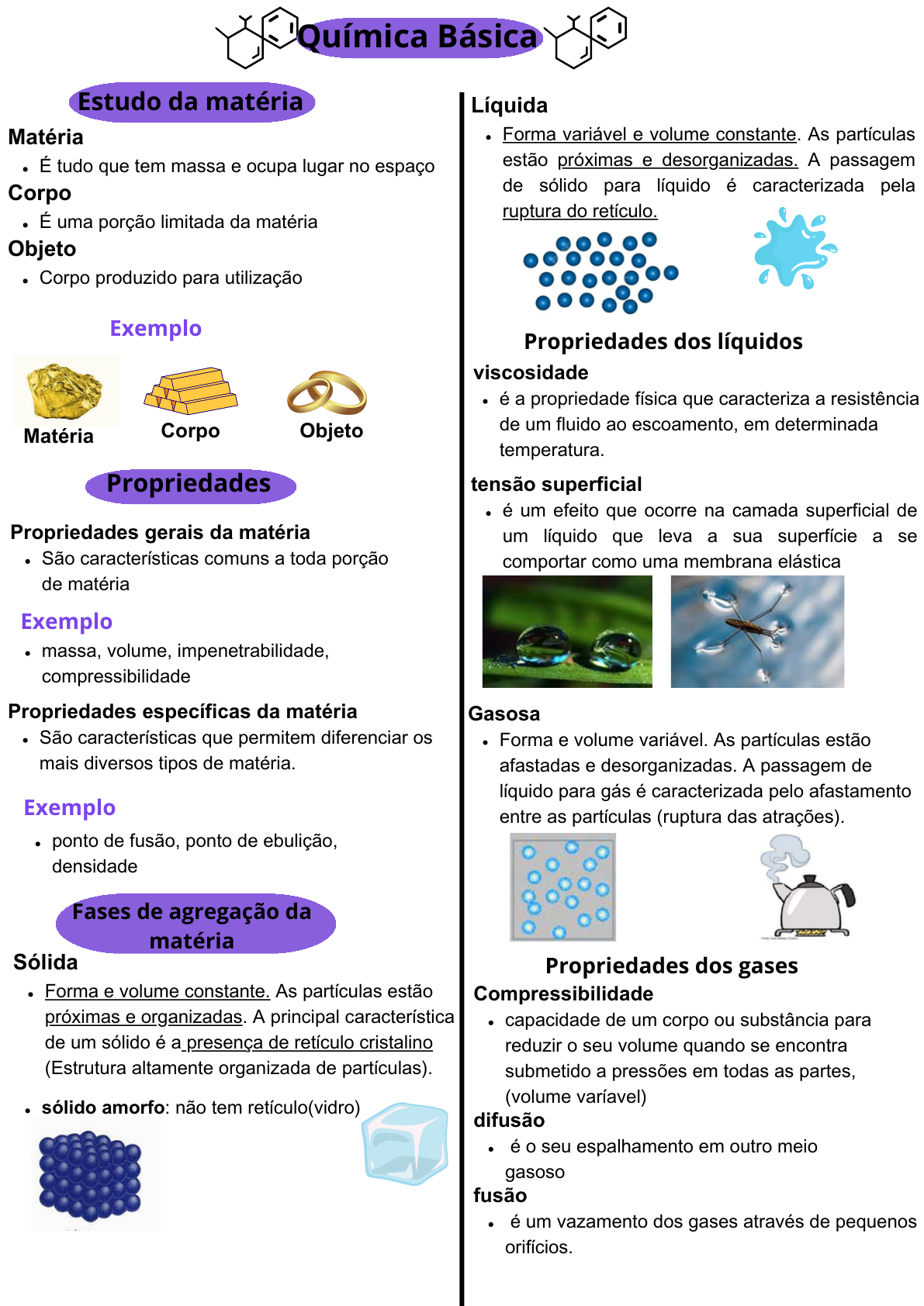 Química Básica Estudo da matéria Matéria É tudo que tem massa e ocupa lugar no espaço Corpo É uma porção limitada da matéria Objeto Corpo produzido para utilização Exemplo Matéria ObjetoCorpo Propriedades gerais da matéria São características comuns a toda porção de matéria Propriedades Exemplo massa, volume, impenetrabilidade, compressibilidade Propriedades específicas da matéria São características que permitem diferenciar os mais diversos tipos de matéria. Exemplo ponto de fusão, ponto de ebulição, densidade Fases de agregação da matéria Sólida Forma e volume constante. As partículas estão próximas e organizadas. A principal característica de um sólido é a presença de retículo cristalino (Estrutura altamente organizada de partículas). sólido amorfo: não tem retículo(vidro) Líquida Forma variável e volume constante. As partículas estão próximas e desorganizadas. A passagem de sólido para líquido é caracterizada pela ruptura do retículo. Propriedades dos líquidos viscosidade é a propriedade física que caracteriza a resistência de um fluido ao escoamento, em determinada temperatura. tensão superficial é um efeito que ocorre na camada superficial de um líquido que leva a sua superfície a se comportar como uma membrana elástica Gasosa Forma e volume variável. As partículas estão afastadas e desorganizadas. A passagem de líquido para gás é caracterizada pelo afastamento entre as partículas (ruptura das atrações). Propriedades dos gases Compressibilidade capacidade de um corpo ou substância para reduzir o seu volume quando se encontra submetido a pressões em todas as partes, (volume varíavel) difusão é o seu espalhamento em outro meio gasoso fusão é um vazamento dos gases através de pequenos orifícios. Sólido GasosoLíquido fusão endoendo vaporização ruptura do reticulo ruptura das atrações Q c) Pote (moringa) de barro água Mudanças de fase de agregação Mudanças de fase Resublimação ou Sublimação aumento de S=entropia: desordem H=entalpia: energia ex de Sublimação nafitaina gelo seco(carbono no estado solido) Tipos de Vaporização 1-Evaporização passagem lenta e natural ocorre em qualquer temperatura em que haja liquido aumento de temperatura e de vaporização ex: varal de roupa 2-Ebulição processo rápido e turbulento ocorre em uma temperatura determinada aumento de temperatura e baixa solubilidade do ar ex: panela 3-Calefação processo imediato ocorre devido a um choque térmico ex: colocar agua na frigideira quente fenômenos do cotidiano a) Termo regulação corporal (suor) suor evaporação Q(calor):tira calor do corpo endotermico regula o corpo L->Gbaixa temperatura b) Ventilador vento evaporação baixa temperatura aumenta velocidade de evaporação do liquido do corpo endotérmico L->G poroso- água pode atravessar endotérmico L->G evapora baixa temperatura rouba calor de dentro d) Pot in pot Q areia pote de barro evapora baixa temperatura e) “Suor” em copo vapor d'água que existe na nossa atmosfera que encosta na superfície do copo aumento de temperatura G->L condensaçao Q calor solidificação condensação ou liquefação f) Ebulição em altitude pressão atmosférica o ar que esta em cima faz pressão ao nível do mar o alimento cozinha mais rápido ar 1atm-pressao p.e-100ºC ar p D2O(H2) ex: usina nucleares piscina que barra radiação em locais que descarta lixo radioativo dura: muito sais de cálcio e magnético Mistura heterogêneo 2 fases 2 fases Gráficos de Mudança de Fase substância Pura P.E e P.F são constantes mistura comum P.E e P.F são variáveis 2 substancias vários pontos faixa de fusão faixa de ebulição mistura eutética mistura azeotrópica atrações P.F: constante P.E: variável P.F: variável P.E: constante diagrama de fases as 3 regiões ao mesmo tempo gás x vapor gás: pode ser liquefeito(ficar liquido) por aumento de pressão vapor: não pode virar liquido por pressão baixa temperatura para ficar liquido Alotropia 1-mistura heterogênea- solido+solido Oxigênio O2 gás oxigênio Gás Vital Oxidante: arranca elétrons Comburente: alimenta a combustão 03 gás ozônio Forte oxidante - bactericida Filtra os raios ultra violeta diamante cn +duro: não tira partículas de si isolante elétrico: não conduz corrente elétrica macromolécula(tetraédrica) sp3 carbono grafite mole: tira partícula dele, feito de camadas não se ligam forte conduz corrente: tem dupla alternadas (eletrodo) lubrificante ( maquinas, fechaduras) trigonal plano sp2 Cora feno é uma camada fósforo p4-branco instável, pega fogo com facilidade bomba incendiaria Pn -vermelho mais estável enxofre S8- Râmbico mais estável S8- monoclínico instável separação de misturas Capacidade que certos elemento tem de formar substância simples diferentes catação catar pela diferença de tamanho, de forma. ventilação corrente de ar diferença de densidade peneiração peneira, separa sólidos pelo tamanho separação magnética ima, substancias atraídas feno magnéticas(ferro, cobalto, níquel) dissolução fracionada um de cada vez flotação flutuar colocar um liquido que tem densidade intermediaria entre sólidos levitação garimpos separa usando uma corrente de água uso de mercúrio na levitação hg dissolve o outro ->liga metálica ->amálgama 2-mistura heterogênea- liquido+ solido filtração fica os resíduos sólidos, passa o liquido filtrado filtração a vácuo aumenta a velocidade da filtração decantação diferença de densidade centrifugação aumenta a velocidade da decantação 3-mistura heterogênea- liquido+ liquido funil de decantação menor densidade em cima menor densidade embaixo câmara de poeira alta pressão, o sólido fica e o ar sai 4-mistura heterogênea- sólido+ gás 1-mistura homogênea- sólido+ liquido evaporação liquido evapora e fica só o sólido destilação simples diferença de ponto de ebulição quem tem a menor ponto de ebul