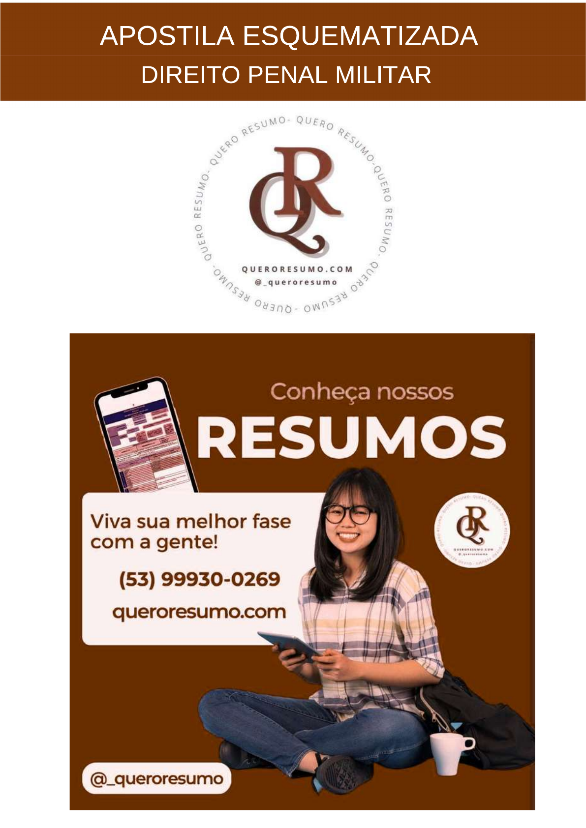 APOSTILA ESQUEMATIZADA DIREITO PENAL MILITAR RESUMO- QUERO QUERO RESUMO- QUERO RESUMO-QUERO QUERORESUMO.COM @_queroresumo Conheça nossos RESUMOS Viva sua melhor fase com a gente! (53) 99930-0269 queroresumo.com @_queroresumoCÓDIGO PENAL MILITAR Lembre-se: texto legal possui especial relevância. Se possível, faça a leitura integral de todos os artigos que fazem parte do conteúdo programático do seu edital. Esse material contém todos os artigos do Código Penal Militar, no entanto, os artigos com maior relevância e tópicos mais cobrados em concursos possui grifo vermelho e comentário. Material atualizado em setembro de 2024. PARTE GERAL TÍTULO I DA APLICAÇÃO DA LEI PENAL MILITAR Princípio de legalidade Art. 1° Não há crime sem lei anterior que o defina, nem pena sem prévia cominação legal. Retroatividade de lei mais benigna: § 1° A lei posterior que, de qualquer Lei supressiva de incriminação: Art. 2° outro modo, favorece agente, aplica-se retroativamente, ainda quando já Ninguém pode ser punido por fato que lei posterior deixa de considerar crime, tenha sobrevindo sentença condenatória irrecorrível. cessando em virtude dela a execução e os Apuração da maior benignidade: § 2° Para se reconhecer qual a mais efeitos penais da sentença condenatória. favorável, a lei posterior e a anterior devem ser consideradas separadamente, cada qual no conjunto de suas normas aplicáveis ao fato. Lei supressiva de Retroatividade de lei mais incriminação: Art. 2° benigna: § 1° A conduta continua sendo crime, Determinada conduta deixa ocorre mudança benéfica à de ser crime. situação do acusado. Penas não superiores a 2 anos ou superiores a Aplicaçãodaleimaisbenigna Justiça Militar da União 2 anos cumpridas em penitenciaria militar: Compete ao Juiz-Auditor. Qualquer pena cominada a civil; Penas maiores que 2 anos cominadas a militar Competência é do Juiz da Vara de Execuções que perdeu tal condição e na ausência de Penais. penitenciária militar. Medidas de segurança Art. 3° As medidas de segurança regem-se pela lei vigente ao tempo da sentença, prevalecendo, entretanto, se diversa, a lei vigente ao tempo da execução. POLICIAL QUERORESUMO.COM @Lei excepcional ou temporária Art. 4° A lei excepcional ou temporária, Lei temporária embora decorrido o período de sua Lei que possui um prazo de vigência pré-determinado. duração ou cessadas as circunstâncias que a determinaram, aplica-se ao fato Lei Excepcional praticado durante sua vigência. Assim como o Código Penal (CP), o Código Penal Militar (CPM) adota a teoria da ATIVIDADE para determinar o TEMPO do crime. Tempo do crime Art. 5° Considera-se praticado o crime no momento da ação ou omissão, ainda que outro seja o do resultado. Lugar do crime Art. 6° Considera-se praticado o fato, no lugar em que se desenvolveu a atividade criminosa, no todo ou em parte, e ainda que sob forma de participação, bem como onde se produziu ou deveria produzir-se o resultado. Nos crimes omissivos, o fato considera-se praticado no lugar em que deveria realizar-se a ação omitida. Código Penal adotou a teoria da Ubiquidade para determinar LUGAR onde ocorreu a infração penal, Código Penal Militar adotou um sistema misto, conciliando duas teorias diferentes Código Penal Militar (lugar do crime) Se o crime é Se crime é COMISSIVO OMISSIVO Adota-se a teoria da Adota-se a teoria da UBIQUIDADE, MISTA ATIVIDADE ou ou UNITÁRIA. teoria da AÇÃO! Territorialidade, Extraterritorialidade Art. 7° Aplica-se a lei penal militar, sem prejuízo de convenções, tratados e regras de direito internacional, ao crime cometido, no todo ou em parte no território nacional, ou fora dele, ainda que, neste caso, agente esteja sendo processado ou tenha sido julgado pela justiça estrangeira. Segundo a doutrina, aplica-se princípio da territorialidade de forma TEMPERADA. Aplica-se a territorialidade e a extraterritorialidade de forma INCONDICIONADA como regras de aplicação da lei penal. Território nacional por extensão § 1° Para os efeitos da lei penal militar consideram-se como extensão do território nacional as aeronaves e os navios brasileiros, onde quer que se encontrem, sob comando militar ou militarmente utilizados ou ocupados por ordem legal de autoridade competente, ainda que de propriedade privada. Ampliação a aeronaves ou navios estrangeiros § 2° É também aplicável a lei penal militar ao crime praticado a bordo de aeronaves ou navios estrangeiros, desde que em lugar sujeito à administração militar, e o crime atente contra as instituições militares. Conceito de navio § 3° Para efeito da aplicação deste Código, considera-se navio toda embarcação sob comando militar. POLICIAL QUERORESUMO.COM @_queroresumoSuperfície REAL Terrestre Águas Territoriais Espaço aéreo correspondente. Principio da TERRITORIALIDA Sob comando militar Militarmente utilizados EXTENSÃO Aeronaves e navios Ocupados por ordem LEGAL de autoridade competente. Pena cumprida no estrangeiro Art. 8° A pena cumprida no estrangeiro atenua a pena imposta no Brasil pelo mesmo crime, quando diversas, ou nela é computada, quando idênticas. Parte da doutrina entende que referido artigo não foi recepcionado pela CF/88, pois o indivíduo seria punido duas vezes pelo mesmo crime (bis in idem). Há quem entenda em sentido diferente, no âmbito da existência de possibilidade de aplicação do referido artigo para caso de extraterritorialidade incondicionada. Para fins de prova, dificilmente referido debate será cobrado. CRIMES MILITARES EM TEMPO DE PAZ Art. 9° Consideram-se crimes militares, em tempo de paz: I os crimes de que trata este Código, quando definidos de modo diverso na lei penal comum, ou nela não previstos, qualquer que seja agente, salvo disposição especial; III os crimes praticados por militar da reserva, ou II- os crimes previstos neste Código e os previstos na reformado, ou por civil, contra as insti