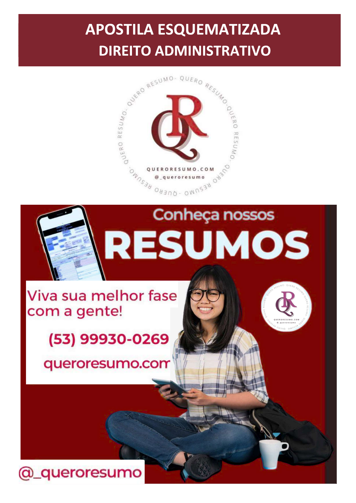 APOSTILA ESQUEMATIZADA DIREITO ADMINISTRATIVO QUERO QUERO RESUMO- QUERO RESUMO-QUERO RESUMO QUERORESUMO.COM QUERO @_queroresumo Conheça nossos E RESUMOS QUERO Viva sua melhor fase RESUMO QUERO com a gente! QUERO RESUMO COM (53) 99930-0269 queroresumo.com @_queroresumoDIREITO ADMINISTRATIVO ESQUEMATIZADO 1. Conceitos Básicos de Direito Administrativo; 2. Princípios da Administração Pública; 3. Poderes Administrativos; 4. Atos Administrativos; 5. Responsabilidade Civil da Administração Pública; 6. Controle da Administração; 7. Os poderes e deveres do administrador público; 8. uso e abuso do poder. 1. CONCEITOS BÁSICOS DE DIREITO ADMINISTRATIVO Conceitos básicos do Direito Administrativo de acordo com os doutrinadores: CELSO ANTÔNIO o ramo do Direito Público que disciplina a função administrativa e os órgãos que a BANDEIRA DE MELLO exercem." ramo do Direito Público que tem por objeto os órgãos, agentes e pessoas jurídicas MARIA SYLVIA ZANELLA administrativas que integram a Administração Pública, a atividade jurídica não contenciosa DI PIETRO que exerce e os bens de que se utiliza para a consecução de seus fins, de natureza pública." o conjunto harmônico de princípios jurídicos que regem órgãos, os agentes e as HELY LOPES MEIRELLES atividades públicas administrativas." JOSÉ DOS SANTOS conjunto de normas e princípios que, visando sempre ao interesse público, regem as relações jurídicas entre as pessoas e órgãos do Estado e entre este e as coletividades a que CARVALHO FILHO devem servir." A Administração Pública pode ser entendida em 2 vertentes: 1. Sentido subjetivo 2. Sentido objetivo Administração Pública (iniciais maiúsculas). administração pública (iniciais minúsculas). Conjunto de órgãos e pessoas jurídicas ao qual a lei Encaixa-se no contexto de atividade executada concede a função administrativa do Estado. sob regime de Direito Público. Proteger o interesse público, o que não deve ser confundido com interesse estatal, uma vez Finalidade do Direito que, o poder público age em prejuízo da coletividade. Finalidade executada pelos Poderes Administrativo Executivos de cada esfera federativa: União, Estados-membros, Mun. e D.F. Entretanto, exercida em caráter atípico pelos Poderes Legislativo e Judiciário das esferas federativas. As pessoas jurídicas são dotadas de personalidade, sujeito de direitos e obrigações, atributo pertinente aos entes políticos (União, Estados, Distrito Federal e Municípios). E podem ser classificadas em pessoa jurídica de: Direito Privado Direito Público As associações, as sociedades, as Externo: Estados estrangeiros e todos regidos pelo direito internacional público. fundações privadas, as Interno: União, os Estados (federados), o Distrito Federal, os territórios, os organizações religiosas e os municípios, as autarquias (inclusive as associações públicas), e as demais partidos políticos, conforme art. entidades de caráter público, criadas por lei (p.ex.: fundações públicas). No Brasil 44 do Código Civil. há uma relação de coordenação entre os entes políticos que formam a federação. POLICIAL QUERORESUMO.COM @_queroresumoConceito de Estado Povo. Estado é a pessoa jurídica de direito público externo Território. constituída por três elementos indissociáveis Governo soberano. Forma de Estado Aquele em que há um único poder político central, sendo marcado, portanto, pela centralização Unitário política. Federado Aquele em que há uma descentralização política, coexistindo diversos poderes políticos distintos. Estado possui 3 funções básicas (administrativa/executiva, legislativa e judicial), distribuídas em poderes, com intuito de garantir os direitos individuais e a eficiência no exercício dessas funções. sistema de controles recíprocos entre os poderes, exercem funções típicas e atípicas (legiferante, jurisdicional e administrativa ou executiva). Possui natureza política, tendo a atribuição de formular as políticas públicas, Função de Governo sendo uma atividade de comando, coordenação, planejamento e direção dotada de soberania, subordinada apenas ao texto constitucional. Atuação técnica, neutra, normalmente vinculada à lei ou à norma técnica e Função de Administração exercida mediante conduta hierarquizada, atividade subalterna (de execução), dotado de caráter instrumental. Forma de governo Caracterizada pela elegibilidade dos representantes do povo, temporariedade República dos mandatos e dever de prestar contas. Transmissão do poder pelo critério hereditário, dotado de vitaliciedade, Monarquia inexistindo o dever de prestar contas. Sistemas de governo Presidencialismo Parlamentarismo A Chefia do Poder Executivo exercida pelo Poder Executivo tem suas atribuições divididas, sendo a Presidente, que acumula as funções de Chefia de Estado exercida pelo Monarca ou pelo Presidente; a Chefe de Estado e Chefe de Governo. Chefia de Governo se dá pelo Primeiro-Ministro ou Presidente Mandato fixo, não depende da confiança do do Conselho de Ministros, os quais são, como regra, indicados parlamento para manutenção do seu cargo. pelo Chefe de Estado. executivo depende da confiança do Por sua vez, os membros do Poder Parlamento. Se o governo entender que o parlamento não Legislativo são eleitos para mandatos fixos, possui mais a confiança do povo, pode optar por dissolvê-lo, e o órgão legislativo não está sujeito à convocando eleições extraordinárias para formação de um dissolução pelo executivo. novo parlamento. POLICIAL QUERORESUMO.COM @_queroresumoSentidos da Expressão Administração Pública Aspecto subjetivo/formal/orgânico: Sentido amplo: órgãos constitucionais de Governo e órgãos representa os entes que exercem as administrativos subordinados. funções administrativas, abrangendo as pessoas jurídicas, os órgãos e os agentes Sentido estrito: órgãos administrativos subord