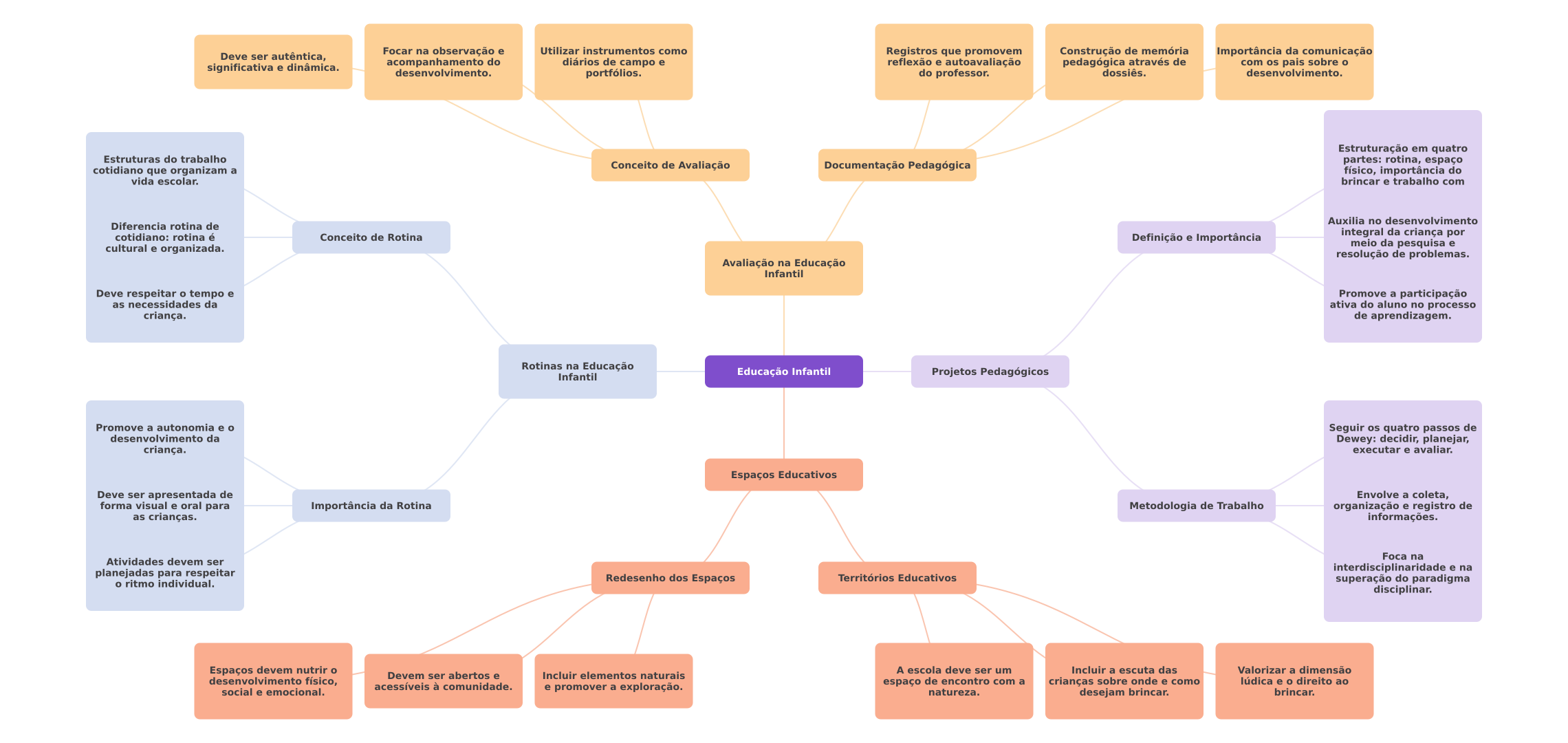 Focar na observação e Utilizar instrumentos como Deve ser autêntica, Registros que promovem Construção de memória Importância da comunicação significativa e dinâmica. acompanhamento do diários de campo e reflexão e autoavaliação pedagógica através de com os pais sobre desenvolvimento. portfólios. do professor. dossiês. desenvolvimento. Estruturação em quatro Estruturas do trabalho cotidiano que organizam a Conceito de Avaliação Documentação Pedagógica partes: rotina, espaço físico, importância do vida escolar. brincar e trabalho com Auxilia no desenvolvimento Diferencia rotina de cotidiano: rotina é Conceito de Rotina Definição e Importância integral da criança por cultural e organizada. meio da pesquisa e resolução de problemas. Avaliação na Educação Infantil Deve respeitar tempo e Promove a participação as necessidades da ativa do aluno no processo criança. de aprendizagem. Rotinas na Educação Infantil Educação Infantil Projetos Pedagógicos Promove a autonomia e Seguir os quatro passos de desenvolvimento da Dewey: decidir, planejar, criança. executar e avaliar. Espaços Educativos Deve ser apresentada de Envolve a coleta, forma visual e oral para Importância da Rotina Metodologia de Trabalho organização e registro de as crianças. informações. Foca na Atividades devem ser planejadas para respeitar interdisciplinaridade e na ritmo individual. Redesenho dos Espaços Territórios Educativos superação do paradigma disciplinar. Espaços devem nutrir A escola deve ser um Incluir a escuta das Valorizar a dimensão Devem ser abertos e Incluir elementos naturais desenvolvimento físico, acessíveis à comunidade. espaço de encontro com a crianças sobre onde e como lúdica e direito ao social e emocional. e promover a exploração. natureza. desejam brincar. brincar.