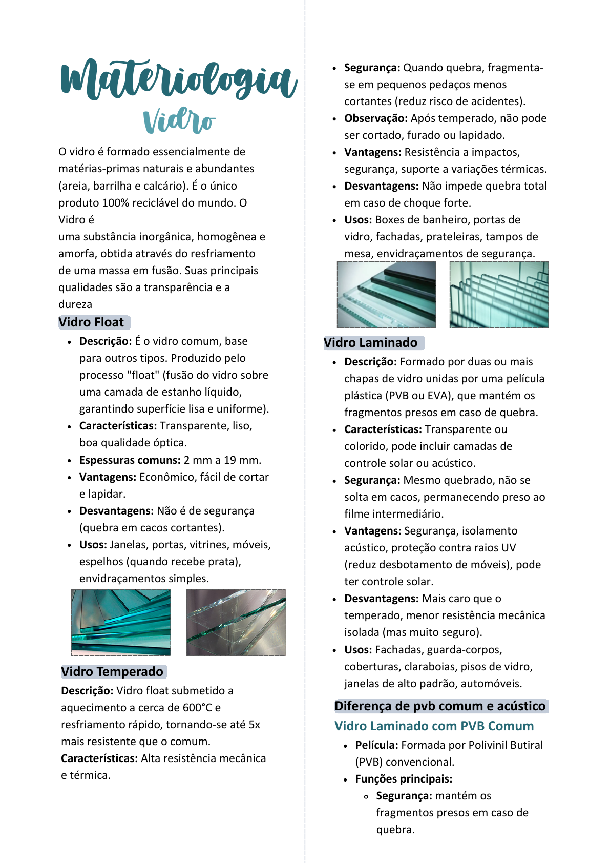 Vidro Float Descrição: É o vidro comum, base para outros tipos. Produzido pelo processo "float" (fusão do vidro sobre uma camada de estanho líquido, garantindo superfície lisa e uniforme). Características: Transparente, liso, boa qualidade óptica. Espessuras comuns: 2 mm a 19 mm. Vantagens: Econômico, fácil de cortar e lapidar. Desvantagens: Não é de segurança (quebra em cacos cortantes). Usos: Janelas, portas, vitrines, móveis, espelhos (quando recebe prata), envidraçamentos simples. Vidro Laminado Descrição: Formado por duas ou mais chapas de vidro unidas por uma película plástica (PVB ou EVA), que mantém os fragmentos presos em caso de quebra. Características: Transparente ou colorido, pode incluir camadas de controle solar ou acústico. Segurança: Mesmo quebrado, não se solta em cacos, permanecendo preso ao filme intermediário. Vantagens: Segurança, isolamento acústico, proteção contra raios UV (reduz desbotamento de móveis), pode ter controle solar. Desvantagens: Mais caro que o temperado, menor resistência mecânica isolada (mas muito seguro). Usos: Fachadas, guarda-corpos, coberturas, claraboias, pisos de vidro, janelas de alto padrão, automóveis. Diferença de pvb comum e acústico Vidro Laminado com PVB Comum Película: Formada por Polivinil Butiral (PVB) convencional. Funções principais: Segurança: mantém os fragmentos presos em caso de quebra. O vidro é formado essencialmente de matérias-primas naturais e abundantes (areia, barrilha e calcário). É o único produto 100% reciclável do mundo. O Vidro é uma substância inorgânica, homogênea e amorfa, obtida através do resfriamento de uma massa em fusão. Suas principais qualidades são a transparência e a dureza Materiologia Vidro Segurança: Quando quebra, fragmenta- se em pequenos pedaços menos cortantes (reduz risco de acidentes). Observação: Após temperado, não pode ser cortado, furado ou lapidado. Vantagens: Resistência a impactos, segurança, suporte a variações térmicas. Desvantagens: Não impede quebra total em caso de choque forte. Usos: Boxes de banheiro, portas de vidro, fachadas, prateleiras, tampos de mesa, envidraçamentos de segurança. Vidro Temperado Descrição: Vidro float submetido a aquecimento a cerca de 600°C e resfriamento rápido, tornando-se até 5x mais resistente que o comum. Características: Alta resistência mecânica e térmica. Vidro Insulado Descrição: Composto por duas (ou mais) chapas de vidro separadas por uma câmara de ar ou gás (argônio), selada hermeticamente. Características: Ótimo isolamento térmico e acústico, pode combinar diferentes tipos de vidro (float, laminado, temperado). Vantagens: Reduz consumo de energia (climatização), diminui ruídos, evita condensação interna. Desvantagens: Custo elevado, instalação mais complexa. Usos: Fachadas de edifícios comerciais e residenciais, janelas de alto desempenho, projetos sustentáveis e acústicos. Proteção UV: filtra até 99% dos raios ultravioleta, ajudando a evitar desbotamento de móveis e tecidos. Controle solar (opcional): pode receber películas especiais para reduzir entrada de calor e luz. Isolamento acústico: reduz ruídos, mas de forma limitada (melhora em média de 2 a 3 dB em relação ao vidro comum). Aplicações: fachadas, guarda-corpos, coberturas, portas e janelas onde o foco é segurança e estética. Vidro Laminado com PVB Acústico (ou PVB especial) Película: Polivinil Butiral acústico, mais espesso e com formulação própria para absorver vibrações sonoras. Funções principais: Segurança: mantém os cacos presos, assim como o PVB comum. Proteção UV: também filtra os raios ultravioleta. Isolamento acústico elevado: reduz ruídos em até 5 dB a mais que o laminado comum (dependendo da composição), o que é bastante perceptível em ambientes urbanos ruidosos. Aplicações: janelas antirruído, fachadas em áreas de tráfego intenso, aeroportos, hospitais, hotéis, escritórios, escolas e residências em regiões urbanas movimentadas. Vidro Impresso Descrição: Vidro obtido a partir do vidro float, que recebe uma textura ou relevo em uma das superfícies durante a fabricação. Características: Difunde a luz, mas não permite visão nítida. Disponível em vários padrões decorativos (geométricos, florais, ondulados, etc.). Vantagens: Privacidade sem perder luminosidade; variedade estética. Desvantagens: Não proporciona isolamento térmico/acústico elevado. Usos: Janelas de banheiros, divisórias internas, portas decorativas, móveis, ambientes que pedem luz com privacidade. Astral Tipos de paginação: Mini Boreal Pontilhado Mosaico Ártico Granito Canelado Antilope Natura Aqualux Florarite Luxor Vidro Acidato (ou Fosco / Jateado Químico) Descrição: Vidro submetido a tratamento com ácido para obter acabamento fosco e acetinado. Características: Superfície lisa, translúcida, difunde a luz, evita visão direta. Vantagens: Elegância, privacidade, fácil de limpar (comparado ao jateado com areia), resistente a manchas. Desvantagens: Mais caro que o vidro comum; pode riscar se não houver cuidado. Usos: Portas, divisórias, móveis, boxes de banheiro, escritórios, ambientes sofisticados que pedem luz difusa. Vidro Serigrafado Descrição: Vidro que recebe aplicação de esmalte cerâmico (através de serigrafia ou impressão digital), fixado na superfície do vidro e depois temperado para aderência permanente. Características: Pode ter desenhos, padrões, cores ou logotipos; resistente à abrasão. Vantagens: Decoração personalizada; durabilidade da estampa; resistência ao calor e umidade. Desvantagens: Custo mais elevado; exige projeto gráfico. Usos: Fachadas comerciais, divisórias, portas, revestimentos internos, design de interiores moderno. Vidro Aramado Descrição: Vidro que possui uma malha metálica (geralmente aço) incorporada em seu interior durante a fabricação. Características: Resistência ao fogo, segu