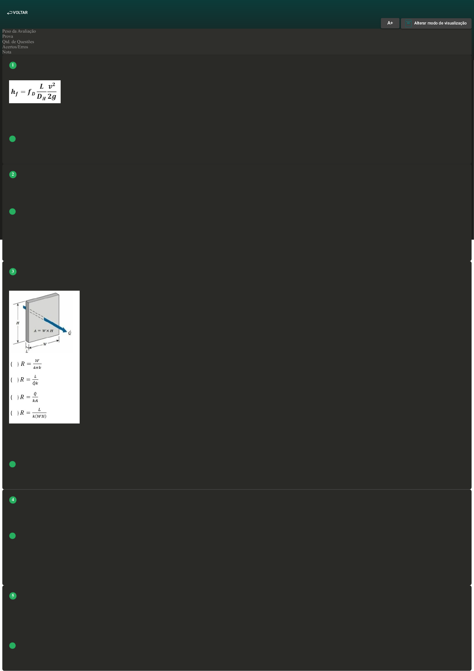 Prova Impressa GABARITO | Avaliação II - Individual (Cod.:1523949) Peso da Avaliação 2,00 Prova 105531406 Qtd. de Questões 10 Acertos/Erros 9/1 Nota 9,00 Uma tubulação de aço para condução de água é constituída por um trecho totalmente horizontal, sem acessórios, de comprimento igual a 2800 m e diâmetro interno de 250 mm. A vazão do escoamento é de 150 m³/h. O fator de atrito de Darcy (ou coeficiente da perda de carga distribuída) da tubulação pode ser considerado fD = 0,016. Adote g=9,81 m/s². Calcule a perda de carga total aproximada, em "metros", pela tubulação. Assinale a alternativa CORRETA: A hf = 85,28 m. B hf = 0,0658 m. C hf = 6,57 m. D hf = 0,41 m. Na análise do sistema de escoamento de fluidos em tubulações, as perdas de pressão normalmente são expressas em termos da altura equivalente da coluna de fluido, chamada de perda de carga (hp). Com base nos conceitos envolvendo o cálculo de perda de carga ou queda de pressão no escoamento, analise as sentenças a seguir: I- A perda de carga é causada pela viscosidade e está relacionada diretamente à tensão de cisalhamento na parede do tubo. II- A perda de carga representa a altura adicional a que o fluido precisa ser elevado por uma bomba para superar as perdas por atrito do tubo. III- Depois que a queda de pressão (ou perda de carga) for conhecida, a potência de bombeamento necessária para superar a perda de energia do fluido pode ser determinada.Assinale a alternativa CORRETA: A As sentenças I, II e III estão corretas. B Somente a sentença III está correta. C Somente a sentença I está correta. D Somente a sentença II está correta. A condução de calor unidimensional em regime permanente é um fenômeno modelado matematicamente através da lei de Fourier. Uma técnica muito utilizada para o estudo da condução de calor em paredes planas é o uso do conceito de resistência à transmissão de calor, uma analogia com a resistência elétrica da lei de Ohm. Com base na figura a seguir e nas formas corretas da equação constitutiva da resistência térmica para condução em paredes planas, classifique V para as opções verdadeiras e F para as sentenças falsas: Assinale a alternativa que apresenta a sequência CORRETA: Fonte: ÇENGEL, Y. A.; GHAJAR, A. J. Transferência de Calor e Massa. Uma abordagem prática. 4. ed. Porto Alegre: AMGH, 2012. p. 19. A F - F - V - V. B V - F - V - F. C F - F - F - V. D V - V - V - F. Para a modelagem matemática do fenômeno da convecção de calor, é comum utilizar alguns parâmetros adimensionais, que geralmente são nomeados em homenagem ao cientista que desenvolveu a teoria ou experimentos associados. Sobre o exposto, classifique V para as sentenças verdadeiras e F para as sentenças falsas: ( ) O número de Prandtl (Pr) é um dos parâmetros adimensionais utilizados em várias correlações empíricas da convecção de calor. ( ) O número de Reynolds (Re) relaciona as forças de inércia e as forças viscosas no escoamento de um fluido. ( ) O número de Prandtl (Pr) e o número de Reynolds (Re) são definidos na unidade m²/s no Sistema Internacional.Assinale a alternativa que apresenta a sequência CORRETA: A V - V - F. B F - F - V. C V - F - V. D F - V - F. Um dos mecanismos de transferência de calor é a radiação. Este tipo de mecanismo difere da condução e da convecção em alguns aspectos fundamentais. Sobre a transferência de calor por radiação, analise as sentenças a seguir: I- A radiação é um fenômeno de transferência de calor que requer a presença de um meio intermediário. II- Radiação é a energia emitida pela matéria na forma de ondas eletromagnéticas como resultado da mudança da configuração eletrônica de átomos e moléculas. III- Todos os corpos que estão acima da temperatura de 0 K (zero absoluto) emitem radiação térmica.Assinale a alternativa CORRETA: A As sentenças I e II estão corretas. B Somente a sentença I está correta. C As sentenças II e III estão corretas. D As sentenças I e III estão corretas. VOLTAR A+ Alterar modo de visualização 1 2 3 4 5 Considere o fenômeno de transmissão de calor por condução unidimensional, em regime permanente e sem geração de calor por uma parede plana. As faces das paredes (k = 1,83 W/m·K) de um reservatório apresentam as temperaturas de 25ºC e 125ºC. Deseja-se que o fluxo de calor seja de 750 W/m². Considerando que esta situação seja atingida e qual deve ser a espessura da parede, assinale a alternativa CORRETA: A A espessura deve ser de 61 cm. B A espessura deve ser de 24,4 cm. C A espessura deve ser de 30,5 cm. D A espessura deve ser de 6,1 cm. A convecção de calor é um mecanismo de transferência de energia térmica que requer a presença de um fluido.Sobre a definição de convecção forçada em gases, assinale a alternativa CORRETA: A É o tipo de mecanismo que envolve somente o fenômeno da evaporação de um fluido. B É o tipo de mecanismo que envolve o fenômeno de condensação e evaporação de um fluido. C É o tipo de mecanismo cujo valor do coeficiente de transferência de calor por convecção (h) é sempre menor do que no fenômeno de convecção de mudança de fase. D É o tipo de mecanismo cujo valor do coeficiente de transferência de calor por convecção (h) é sempre maior do que o mecanismo de convecção natural em um líquido. A equação de Bernoulli pode ser aplicada para descrever o balanço de energias mecânicas em um escoamento de fluido em regime permanente. A partir de um somatório da energia potencial, energia cinética e energia de fluxo de um fluido, é possível determinar a sua carga hidráulica de escoamento. Com base no balanço de energia mecânica aplicado ao escoamento em regime permanente de um fluido e nas formas de apresentação da equação de Bernoulli, classifique V para as sentenças verdadeiras e F para as falsas: Assinale a alternativa que apresenta a sequência CORRETA: A V - F - V. B 