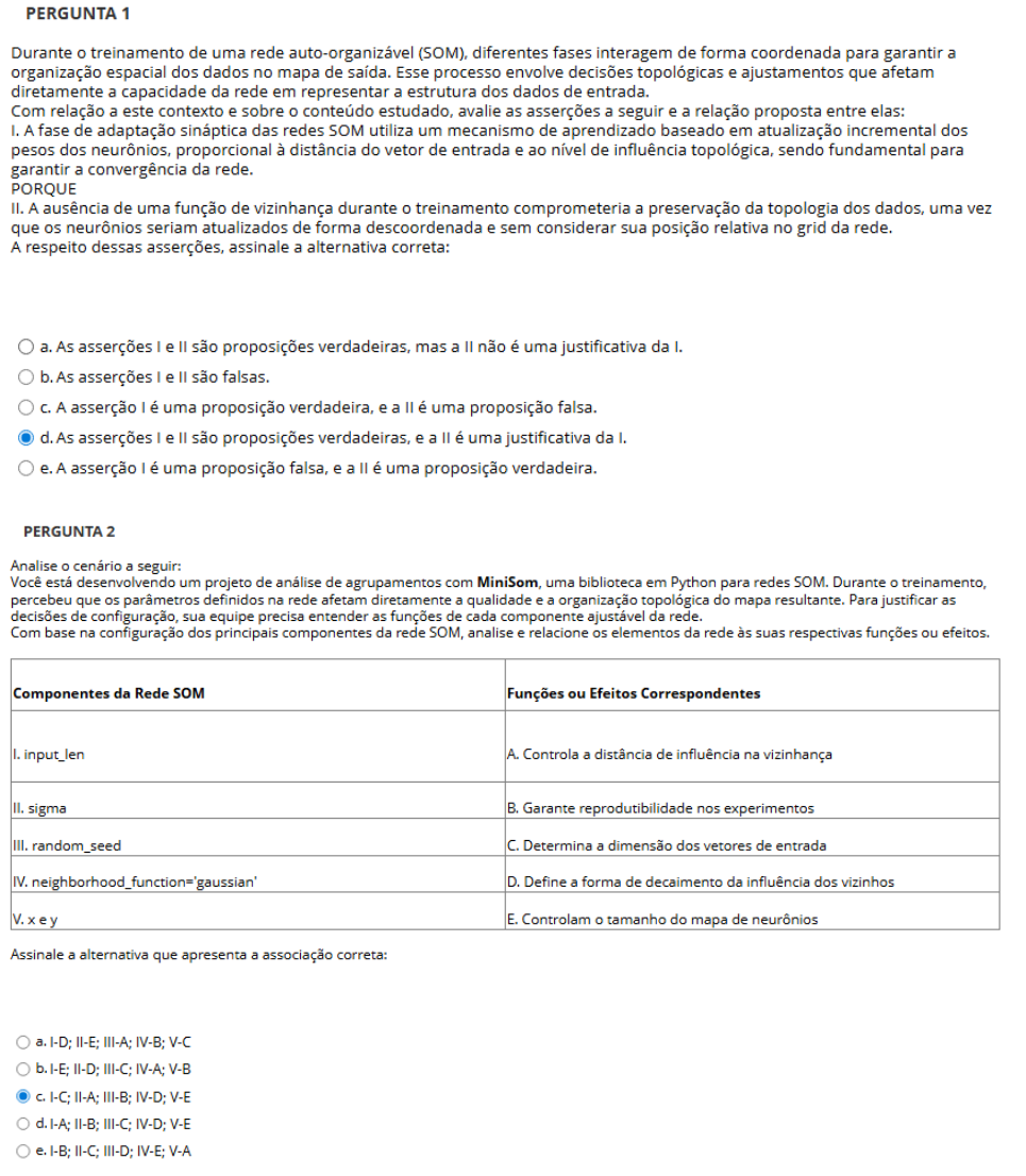 PERGUNTA 1 Durante treinamento de uma rede auto-organizável (SOM), diferentes fases interagem de forma coordenada para garantir a organização espacial dos dados no mapa de saída. Esse processo envolve decisões topológicas e ajustamentos que afetam diretamente a capacidade da rede em representar a estrutura dos dados de entrada. Com relação a este contexto e sobre o conteúdo estudado, avalie as asserções a seguir e a relação proposta entre elas: I. A fase de adaptação sináptica das redes SOM utiliza um mecanismo de aprendizado baseado em atualização incremental dos pesos dos neurônios, proporcional à distância do vetor de entrada e ao nível de influência topológica, sendo fundamental para garantir a convergência da rede. PORQUE II. A ausência de uma função de vizinhança durante treinamento comprometeria a preservação da topologia dos dados, uma vez que os neurônios seriam atualizados de forma descoordenada e sem considerar sua posição relativa no grid da rede. A respeito dessas asserções, assinale a alternativa correta: a. As asserções e são proposições verdadeiras, mas a não é uma justificativa da I. b. As asserções e são falsas. A asserção é uma proposição verdadeira, e a é uma proposição falsa. d. As asserções e são proposições verdadeiras, e a é uma justificativa da I. e. A asserção é uma proposição falsa, e a é uma proposição verdadeira. PERGUNTA 2 Analise cenário a seguir: Você está desenvolvendo um projeto de análise de agrupamentos com MiniSom, uma biblioteca em Python para redes SOM. Durante treinamento, percebeu que os parâmetros definidos na rede afetam diretamente a qualidade e a organização topológica do mapa resultante. Para justificar as decisões de configuração, sua equipe precisa entender as funções de cada componente ajustável da rede. Com base na configuração dos principais componentes da rede SOM, analise e relacione os elementos da rede às suas respectivas funções ou efeitos. Componentes da Rede SOM Funções ou Efeitos Correspondentes I. input_len A. Controla a distância de influência na vizinhança II. sigma B. Garante reprodutibilidade nos experimentos III. random_seed C. Determina a dimensão dos vetores de entrada IV. D. Define a forma de decaimento da influência dos vizinhos V.xey E. Controlam o tamanho do mapa de neurônios Assinale a alternativa que apresenta a associação correta: a. I-D; II-E; III-A; IV-B; V-C b. I-E; II-D; III-C; IV-A; V-B I-C; II-A; III-B; IV-D; V-E II-B; III-C; IV-D; V-E e. I-B; II-C; III-D; IV-E; V-APERGUNTA 3 A compreensão sobre a operação de uma rede RBF pode melhorar quando a estudamos como um classificador de padrões, mediante a análise da separabilidade de padrões. Assinale a alternativa que apresenta resumidamente como se dá a separabilidade de padrões em redes RBF. a. A separabilidade de padrões em redes RBF é garantida pela presença de múltiplas camadas ocultas com neurônios profundamente conectados. b.A separabilidade de padrões em redes RBF se dá pela conexão direta entre as camadas de entrada e saída, sem necessidade de funções ocultas. A separabilidade de padrões em redes RBF se dá pela utilização de funções de ativação não-lineares como ReLU e sigmoide. d.A separabilidade de padrões em redes RBF se dá pela existência de uma superfície que separa naturalmente os pontos da classe X1 dos pontos da classe X2. e.A separabilidade de padrões em redes RBF se dá unicamente pela estrutura dos dados de entrada, sem a necessidade de mapeamento para um espaço oculto. PERGUNTA 4 teorema de Micchelli fornece a base teórica para uso de funções de base radial (RBF) em problemas de interpolação, garantindo que a matriz de interpolação seja [preencher 1], desde que os pontos de entrada sejam distintos. Dentre as funções RBF utilizadas, as funções [preencher 2] e [preencher 3] são consideradas localizadas, pois seus valores tendem a zero à medida que a distância aumenta, o que favorece a definição positiva da matriz Ф e melhora a generalização da rede. Neste contexto, identifique os termos de [preencher 1], [preencher 2] e [preencher 3] que são substítuidos por: a. 1 simétrica; 2 normalizados; 3 logarítmicas b. 1 estável; 2 espacialmente próximos; 3 funções quadráticas 1 não singular; 2 distintos; 3 gaussianas d. 1 regularizada; 2 uniformes; 3 funções sigmoides e.1 diagonalizável; 2 ortonormais; 3 exponenciais modulares PERGUNTA 5 Uma equipe de engenheiros de aprendizado de máquina está desenvolvendo dois modelos para classificar imagens médicas. Um dos modelos é baseado em redes RBF, e outro em MLP. Durante uma reunião técnica, surge a necessidade de compreender a diferença entre os dois modelos, especialmente no que diz respeito à forma como os dados são processados na camada oculta de cada rede. A correta compreensão dessa diferença influenciará a escolha da rede ideal para o sistema final. Considerando apresentado, assinale a alternativa que reconhece uma diferença estrutural ou funcional entre redes RBF e MLP. a. As redes RBF empregam produto interno entre os vetores de entrada e pesos sinápticos na camada oculta. b. As redes RBF utilizam múltiplas camadas ocultas com funções sigmoides para ajuste. As unidades ocultas da rede RBF calculam a norma euclidiana entre a entrada e seus centros. d.As redes MLP realizam aproximações locais, enquanto as redes RBF aplicam aproximações globais. e. As redes MLP possuem apenas uma camada oculta, enquanto as RBF são compostas por múltiplas camadas não lineares.PERGUNTA 6 Você integra uma equipe de ciência de dados responsável por avaliar a qualidade de mapas auto-organizáveis (SOM) aplicados a dados biométricos. Durante a análise, seu supervisor solicita que você relacione corretamente as abordagens e métricas de avaliação com suas respectivas funções no processo de análise de desempenho do mapa SOM. Com base no