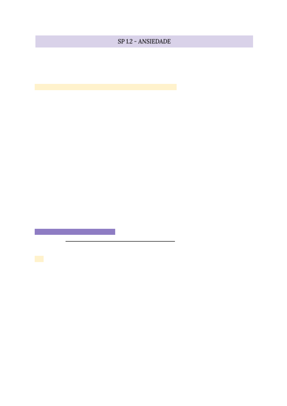 Ansiedade é um estado emocional que envolve apreensão ou preocupação sobre algo no futuro, combinado com respostas físicas (como batimentos acelerados, sudorese, tremores) e tendência a evitar situações percebidas como perigosas ou estressantes. Medo + ansiedade excessivos + perturbações comportamentais. ● Os transtornos tendem a se desenvolver na infância e persistir se não tratados; ● Maior frequência no sexo feminino; ● Medo + ansiedade = os dois estados se sobrepõem. Medo: resposta emocional a ameaça iminente real ou percebida Ansiedade: antecipação de ameaça futura. Esquiva como mecanismo: Tanto no medo quanto na ansiedade, a pessoa pode adotar a esquiva como forma de se proteger. ● O problema é que a esquiva reforça o ciclo → quanto mais a pessoa evita, mais mantém a sensação de perigo, impedindo que perceba que talvez não haja risco real. Existem diversos transtornos ansiosos: Agorafobia; Transtorno de Pânico com Agorafobia; Transtorno de Pânico; Fobia Específica; Fobia Social; Transtorno Obsessivo-Compulsivo; Transtorno de Estresse Pós-Traumático; Transtorno de Estresse Agudo; Transtorno de Ansiedade Generalizada; Transtorno de Ansiedade Devido a uma Condição Médica Geral; Transtorno de Ansiedade Induzido por Substância TRANSTORNOS DE PÂNICO (F41.0): Ataques de pânico recorrentes e inesperados. Um ataque de pânico é um surto abrupto de medo intenso ou desconforto intenso que alcança um pico em minutos e durante o qual ocorrem quatro (ou mais) dos seguintes sintomas: obs: O surto abrupto pode ocorrer a partir de um estado calmo ou de um estado ansioso. Sintomas (4 ou mais): 1. Palpitações, coração acelerado, taquicardia. 2. Sudorese. 3. Tremores ou abalos. 4. Sensações de falta de ar ou sufocamento. 5. Sensações de asfixia. 6. Dor ou desconforto torácico. 7. Náusea ou desconforto abdominal. 8. Sensação de tontura, instabilidade, vertigem ou desmaio. 9. Calafrios ou ondas de calor. 10. Parestesias 11. Desrealização (sensações de irrealidade) ou despersonalização (sensação de estar distanciado de si mesmo). 1 12. Medo de perder o controle ou “enlouquecer”. 13. Medo de morrer. obs: Além desses 13 sintomas, os ataques de pânico podem vir somados a: tinido (zumbido), dor na nuca, cefaleia, gritos e choro incontrolável; Para diagnosticar o TP = ataques recorrentes + pelo menos 1 mês apresentando um ou ambos dos critérios abaixo: ➔ Medo de ter novas crises: Apreensão ou preocupação persistente acerca de ataques de pânico adicionais ou sobre suas consequências (p. ex., perder o controle, ter um ataque cardíaco, “enlouquecer”). ◆ é ficar ansioso de forma contínua com a possibilidade de que o ataque volte ou de que cause algo grave. ➔ A pessoa muda sua rotina ou comportamento de forma exagerada e prejudicial, tentando evitar que uma nova crise de pânico aconteça = Uma mudança desadaptativa significativa no comportamento relacionada aos ataques ◆ Ex: Evitar fazer exercícios físicos porque o aumento da frequência cardíaca lembra os sintomas da crise ou não sair de casa sozinho por medo de passar mal em público. ◆ Criando dependência ou isolamento. A perturbação não é consequência dos efeitos psicológicos de uma substância (p. ex., droga de abuso, medicamento) ou de outra condição médica (p. ex., hipertireoidismo, doenças cardiopulmonares) ou por explicada por outro transtorno mental; Fatores de Risco: ● Afetividade negativa (neuroticismo): tendência a vivenciar emoções negativas. ● Sensibilidade à ansiedade: crença de que sintomas ansiosos são perigosos. ● História de “períodos de medo”: crises com sintomas parciais aumentam risco futuro ● Abuso físico e sexual. ● Tabagismo ● Estressores recentes: geralmente presentes antes do primeiro ataque (ex.: conflitos interpessoais, problemas de saúde, perdas familiares, experiências negativas com drogas). ● Histórico familiar: risco aumentado em filhos de pais com transtornos de ansiedade, depressão ou bipolaridade. ● Comorbidades médicas 2 TRANSTORNO DE ANSIEDADE GENERALIZADA (TAG) F41.1: Critério A: Ansiedade e preocupação excessivas (expectativa apreensiva), ocorrendo na maioria dos dias por pelo menos 6 meses, em relação a vários eventos ou atividades (como trabalho, escola, saúde, finanças). Critério B: O indivíduo considera difícil controlar a preocupação. Critério C: A ansiedade e a preocupação estão associadas com 3 (ou mais) dos seguintes seis sintomas (com pelo menos alguns deles presentes na maioria dos dias nos últimos 6 meses). obs: Apenas um item é exigido para crianças. 1. Inquietação ou sensação de estar com os nervos à flor da pele. 2. Fatigabilidade. 3. Dificuldade em concentrar-se ou sensações de “branco” na mente. 4. Irritabilidade. 5. Tensão muscular. 6. Perturbação do sono (dificuldade em conciliar ou manter o sono, ou sono insatisfatório e inquieto). Critério D: A ansiedade, a preocupação ou os sintomas físicos causam sofrimento clinicamente significativo ou prejuízo no funcionamento social, profissional ou em outras áreas importantes da vida do indivíduo. Critério E: A perturbação não é atribuível aos efeitos fisiológicos de uma substância (droga, medicamento) ou condição médica (como hipertireoidismo). Critério F: A perturbação não é mais bem explicada por outro transtorno mental (fobia específica, TOC, transtorno de pânico, etc.). Características associadas que apoiam o diagnóstico do TAG: ● Sintomas musculares e nervosos: ○ Tensão muscular / dores musculares ○ Tremores ○ Contrações musculares ○ Abalos ○ Nervosismo ou irritabilidade ● Sintomas somáticos: ○ Sudorese ○ Náusea ○ Diarreia ○ Resposta de sobressalto exagerada (assustar-se facilmente). ● Excitabilidade Autonômica (menos intensa que no pânico) → São menos proeminentes no TAG do que em outros transtornos de ansiedade (como