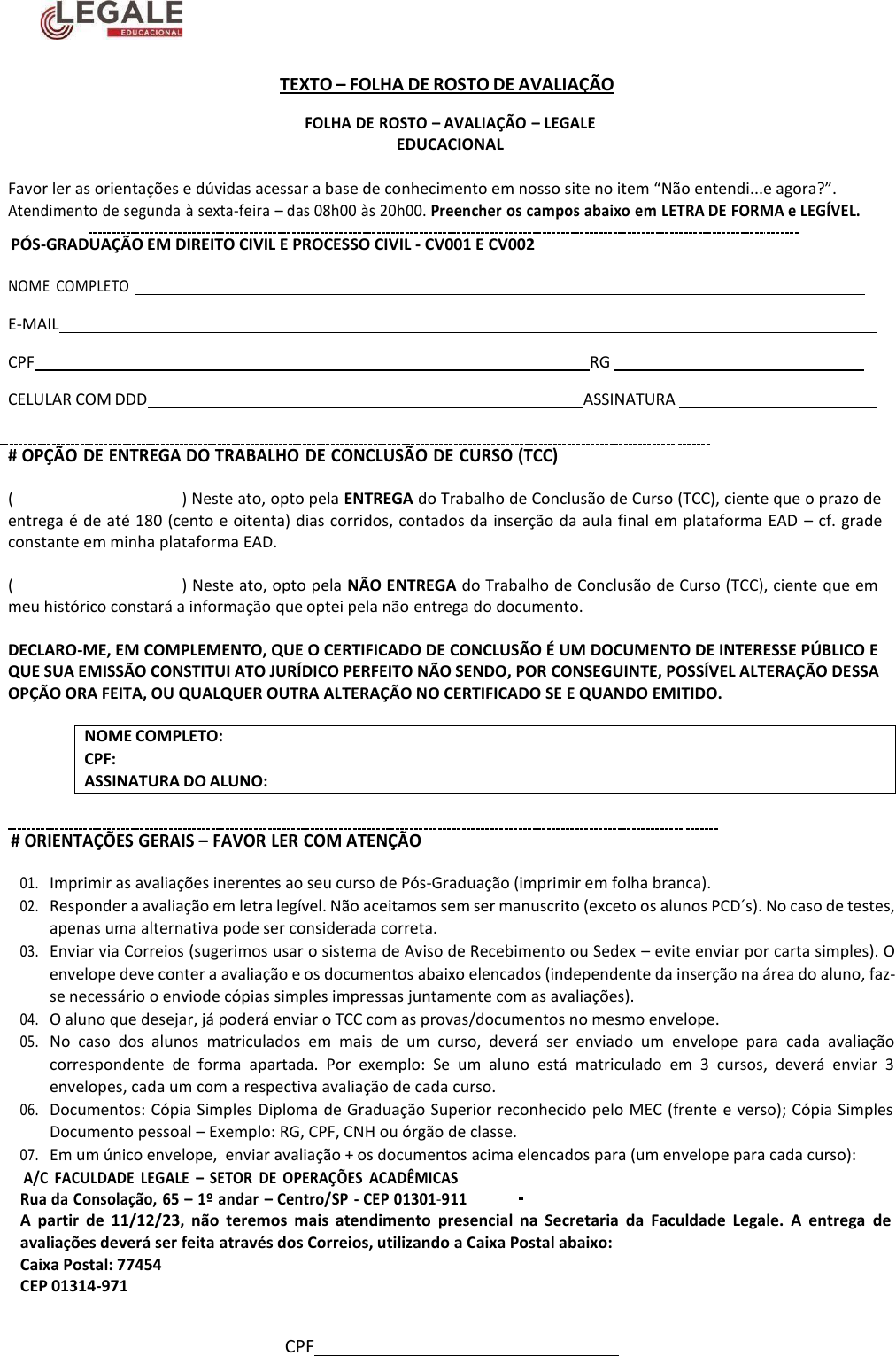 CPF TEXTO – FOLHA DE ROSTO DE AVALIAÇÃO FOLHA DE ROSTO – AVALIAÇÃO – LEGALE EDUCACIONAL Favor ler as orientações e dúvidas acessar a base de conhecimento em nosso site no item “Não entendi...e agora?”. Atendimento de segunda à sexta-feira – das 08h00 às 20h00. Preencher os campos abaixo em LETRA DE FORMA e LEGÍVEL. PÓS-GRADUAÇÃO EM DIREITO CIVIL E PROCESSO CIVIL - CV001 E CV002 NOME COMPLETO E-MAIL CPF RG CELULAR COM DDD ASSINATURA # OPÇÃO DE ENTREGA DO TRABALHO DE CONCLUSÃO DE CURSO (TCC) ( ) Neste ato, opto pela ENTREGA do Trabalho de Conclusão de Curso (TCC), ciente que o prazo de entrega é de até 180 (cento e oitenta) dias corridos, contados da inserção da aula final em plataforma EAD – cf. grade constante em minha plataforma EAD. ( ) Neste ato, opto pela NÃO ENTREGA do Trabalho de Conclusão de Curso (TCC), ciente que em meu histórico constará a informação que optei pela não entrega do documento. DECLARO-ME, EM COMPLEMENTO, QUE O CERTIFICADO DE CONCLUSÃO É UM DOCUMENTO DE INTERESSE PÚBLICO E QUE SUA EMISSÃO CONSTITUI ATO JURÍDICO PERFEITO NÃO SENDO, POR CONSEGUINTE, POSSÍVEL ALTERAÇÃO DESSA OPÇÃO ORA FEITA, OU QUALQUER OUTRA ALTERAÇÃO NO CERTIFICADO SE E QUANDO EMITIDO. NOME COMPLETO: CPF: ASSINATURA DO ALUNO: # ORIENTAÇÕES GERAIS – FAVOR LER COM ATENÇÃO 01. Imprimir as avaliações inerentes ao seu curso de Pós-Graduação (imprimir em folha branca). 02. Responder a avaliação em letra legível. Não aceitamos sem ser manuscrito (exceto os alunos PCD´s). No caso de testes, apenas uma alternativa pode ser considerada correta. 03. Enviar via Correios (sugerimos usar o sistema de Aviso de Recebimento ou Sedex – evite enviar por carta simples). O envelope deve conter a avaliação e os documentos abaixo elencados (independente da inserção na área do aluno, faz- se necessário o enviode cópias simples impressas juntamente com as avaliações). 04. O aluno que desejar, já poderá enviar o TCC com as provas/documentos no mesmo envelope. 05. No caso dos alunos matriculados em mais de um curso, deverá ser enviado um envelope para cada avaliação correspondente de forma apartada. Por exemplo: Se um aluno está matriculado em 3 cursos, deverá enviar 3 envelopes, cada um com a respectiva avaliação de cada curso. 06. Documentos: Cópia Simples Diploma de Graduação Superior reconhecido pelo MEC (frente e verso); Cópia Simples Documento pessoal – Exemplo: RG, CPF, CNH ou órgão de classe. 07. Em um único envelope, enviar avaliação + os documentos acima elencados para (um envelope para cada curso): A/C FACULDADE LEGALE – SETOR DE OPERAÇÕES ACADÊMICAS Rua da Consolação, 65 – 1º andar – Centro/SP - CEP 01301-911 A partir de 11/12/23, não teremos mais atendimento presencial na Secretaria da Faculdade Legale. A entrega de avaliações deverá ser feita através dos Correios, utilizando a Caixa Postal abaixo: Caixa Postal: 77454 CEP 01314-971 - 38654845813 CPF Para atendimento, favor entrar em contato através do e-mail: contato@falegale.edu.br 08. PRAZO DE ENTREGA DA AVALIAÇÃO: consultar a grade curricular na Plataforma EAD – a qual contém todas as datas oficiais emrelação ao seu curso. 09. A avaliação ao ser recebida pela Faculdade Legale, o aluno será informado por e-mail, no prazo de 03 (três) dias úteis. Recomendamos sempre consultar o lixo eletrônico/spam. 10. O prazo de correção da avaliação é de até 30 (trinta) dias úteis, contados a partir do recebimento. O aluno que optou pela NÃO entrega do TCC, automaticamente passará a fase de emissão do certificado de pós, após frequência de 75% nas aulas e obtenção de média igual ou superior a 7,0 (sete) em todas as disciplinas do curso. O aluno que eventualmente não obter a media será contatrealização de uma avaliação substitutiva através do e-mail informando nesta folha. 11. No momento em que o Certificado Digital de Conclusão for emitido, o aluno receberá um comunicado via e-mail. Neste mesmo comunicado, o aluno receberá as instruções caso opte por receber a via física do Certificado. Para visualizar o Certificadodigital, basta acessar com login e senha o Portal Acadêmico do Aluno. Cabe destacar que TODA ESTA EVOLUÇÃO DE RECEBIMENTO, CORREÇÃO E CERTIFICAÇÃO DEVERÁ SER ACOMPANHADA VIA ÁREA DO ALUNO – NO ITEM ACADÊMICO. 12. Aos alunos PCD´s, favor entrar em contato com a Faculdade Legale para maiores orientações. PÓS-GRADUAÇÃO EM DIREITO CIVIL E PROCESSO CIVIL - CV001 E CV002 1- Rita, em decorrência de diversos problemas conjugais, decidiu se divorciar de Marcelo. Contudo, em razão da resistência do cônjuge em consentir com sua decisão, foi preciso propor ação de divórcio. Após distribuída a ação, o juiz determinou a emenda da petição inicial, tendo em vista a ausência de cópia da certidão do casamento celebrado entre as partes, dentre os documentos anexados à inicial. Considerando o caso narrado e as disposições legais a respeito da ausência de documentos indispensáveis à propositura da ação, assinale a afirmativa correta. a) Ausente documento indispensável à propositura da ação, a petição inicial deve ser indeferida de imediato. b) A certidão de casamento é documento indispensável à propositura de qualquer ação. Constatando-se sua ausência, deve o autor ser intimado para emendar ou completar a inicial no prazo de 5 (cinco) dias. c) Ausente documento indispensável à propositura da ação, o autor deve ser intimado para emendar ou completar a inicial no prazo de 15 (quinze) dias. d) A ausência de documento indispensável à propositura da ação configura hipótese de improcedência liminar. e) Todas incorretas 2- João impetrou mandado de segurança contra determinada decisão judicial manifestamente teratológica; antes que o MS fosse julgado, houve o trânsito em julgado do processo no qual a referida decisão foi proferida: a) Não cabe apreciação do r