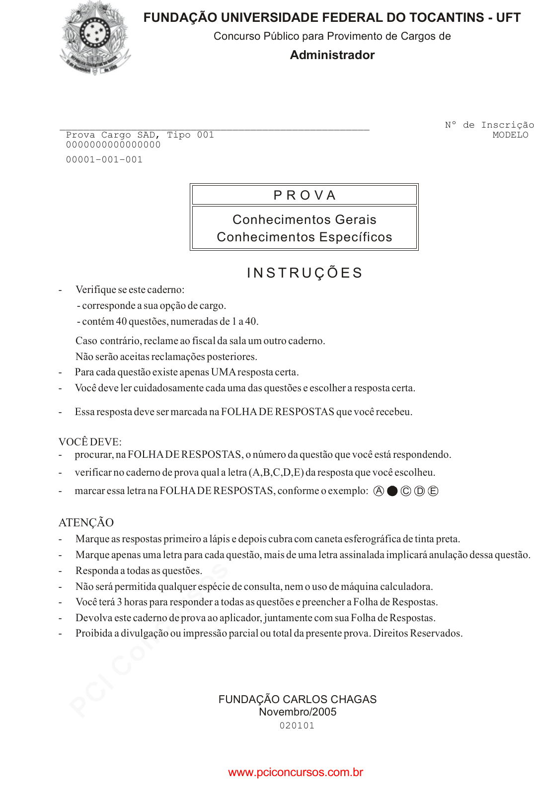 pcimarkpci MDAwMDowMDAwOjAwMDA6MDAwMDowMDAwOmZmZmY6YmFmYTo3NjMy:TW9uLCAwOCBTZXAgMjAyNSAxMTowMjoxMSAtMDMwMA== www.pciconcursos.com.br I N S T R U Ç Õ E S Conhecimentos Gerais Conhecimentos Específicos P R O V A FUNDAÇÃO CARLOS CHAGAS Novembro/2005 FUNDAÇÃO UNIVERSIDADE FEDERAL DO TOCANTINS - UFT Concurso Público para Provimento de Cargos de Administrador - Verifique se este caderno: - corresponde a sua opção de cargo. - contém 40 questões, numeradas de 1 a 40. Caso contrário, reclame ao fiscal da sala um outro caderno. Não serão aceitas reclamações posteriores. - Para cada questão existe apenas UMA resposta certa. - Você deve ler cuidadosamente cada uma das questões e escolher a resposta certa. - Essa resposta deve ser marcada na FOLHA DE RESPOSTAS que você recebeu. VOCÊ DEVE: - procurar, na FOLHA DE RESPOSTAS, o número da questão que você está respondendo. - verificar no caderno de prova qual a letra (A,B,C,D,E) da resposta que você escolheu. - marcar essa letra na FOLHA DE RESPOSTAS, conforme o exemplo: - Marque as respostas primeiro a lápis e depois cubra com caneta esferográfica de tinta preta. - Marque apenas uma letra para cada questão, mais de uma letra assinalada implicará anulação dessa questão. - Responda a todas as questões. - Não será permitida qualquer espécie de consulta, nem o uso de máquina calculadora. - Você terá 3 horas para responder a todas as questões e preencher a Folha de Respostas. - Devolva este caderno de prova ao aplicador, juntamente com sua Folha de Respostas. - Proibida a divulgação ou impressão parcial ou total da presente prova. Direitos Reservados. ATENÇÃO A C D E ____________________________________________________ Prova Cargo SAD, Tipo 001 0000000000000000 00001−001−001 Nº de Inscrição MODELO 020101 www.pciconcursos.com.br pcimarkpci MDAwMDowMDAwOjAwMDA6MDAwMDowMDAwOmZmZmY6YmFmYTo3NjMy:TW9uLCAwOCBTZXAgMjAyNSAxMTowMjoxMSAtMDMwMA== www.pciconcursos.com.br 28/10/05 - 14:09 2 UNITO105-CG1 CONHECIMENTOS GERAIS Atenção: As questões de números 1 a 10 referem-se ao texto que segue. Liberalismo O liberalismo promoveu uma idéia curiosa: para fazer a felicidade de todos (ou, ao menos, da maioria), não seria neces- sário decidir qual é o bem comum e, logo, impor aos cidadãos que se esforçassem para realizá-lo. Seria suficiente que cada um se preocupasse com seus interesses e seu bem-estar. Essa atitude espontânea garantiria o melhor mundo possível para todos. Afinal, nenhum seria burro a ponto de perseguir seu interesse particular de maneira excessiva, pois isso comprome- teria o bem-estar dos outros e produziria conflitos que rever- teriam contra o suposto malandro. Ora, o liberalismo, aparentemente, pegou feio. Não paro de encontrar pessoas convencidas de que, cuidando só de seus interesses, elas, no mínimo, não fazem mal a ninguém. Converso com M., que dirige o táxi que me leva a Gua- rulhos. Falamos das perspectivas políticas. Ele está indignado com a corrupção das altas e das baixas esferas da política, convencido de que, sem ladrões, o país avançaria e resolve- ríamos nossos problemas. Concordo, mas aponto que, mesmo calculando generosamente, o dinheiro que some na corrupção não seria suficiente para mudar a cara do Brasil. Sem dúvida, deve ser bem inferior ao dinheiro que o governo deixa de arrecadar por causa da sonegação banal: rendas não decla- radas, notas fiscais que só aparecem sob pedido e por aí vai. M. aceita essa idéia com gosto e lança uma diatribe contra os sonegadores, inimigos do povo brasileiro tanto quanto os corruptos. Pergunto a M. quanto ele paga de imposto de renda. Ganho a famosa resposta: “Não adianta pagar, porque nada volta para a gente”. Alego que não adianta esperar que algo volte, se a gente não paga. Essa história tem três morais: a democracia formal está forte; a concreta, nem tanto. Segunda: os espíritos são nobres, a carne segue fraca. Terceira: o nacionalismo brasileiro pode ser férvido, mas a experiência de uma comunidade de destino ainda está longe. (Contardo Calligaris, Terra de ninguém) 1. É correto afirmar que, para o autor do texto, a idéia curio- sa que o liberalismo promoveu é (A) um caminho seguro para o fortalecimento político do Brasil. (B) um método eficaz para combater a sonegação fiscal. (C) uma prática social que vem dando bons resultados. (D)) uma ilusão de muitos, como vem demonstrando a prática. (E) uma providência salutar, a ser imediatamente to- mada. _________________________________________________________ 2. Na conversa entre o autor e o motorista de táxi, fica claro que (A) ambos concordam quanto ao que seria suficiente para mudar a cara do Brasil. (B) ambos concordam quanto ao destino que vem sendo dado aos impostos arrecadados. (C) ambos sonegam impostos, embora defendam o sis- tema de arrecadação. (D) o autor se surpreende com a coerência das posições políticas do motorista. (E)) o autor reconhece uma contradição entre as pala- vras e as práticas do motorista. _________________________________________________________ 3. Considerando-se o contexto, deve-se compreender a frase o liberalismo, aparentemente, pegou feio no seguinte sen- tido: (A)) o liberalismo, à primeira vista, foi muito bem aco- lhido. (B) as idéias do liberalismo, aparentemente, pegaram mal. (C) a julgar pelas aparências, o liberalismo causou má impressão. (D) o liberalismo, já de início, mostrou suas garras. (E) o liberalismo causou uma péssima impressão inicial. _________________________________________________________ 4. Estão inteiramente respeitadas as normas de concor- dância verbal na frase: (A) Acabou por causar má impressão no autor as pala- vras que lhe dirigiu o motorista. (B)) Deve-se aos sonegadores de impostos uma boa parcela do desequilíbrio econômico. (C) As três morais com que finalizam o texto não são muito animadoras. (D) Não costumam haver entre os corruptos quem admi-