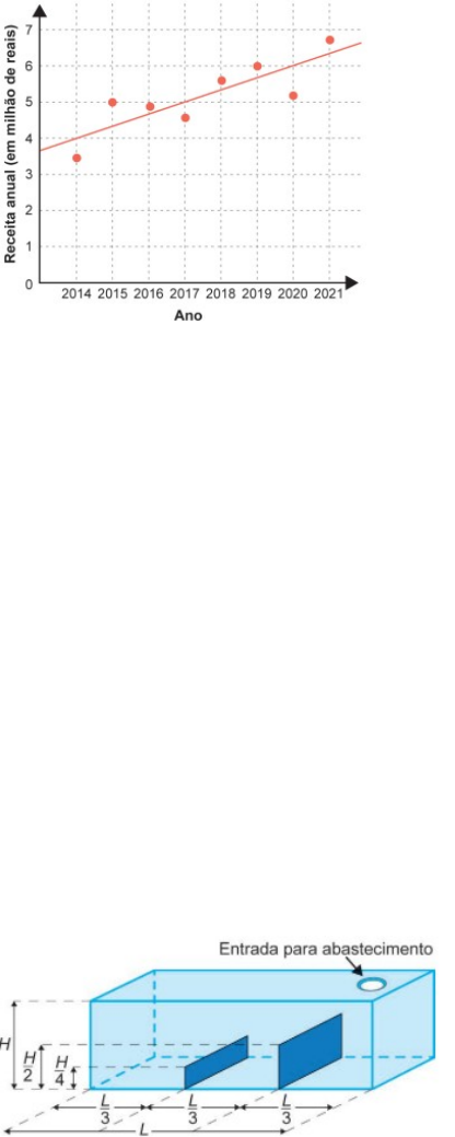 SIMULADO ENEM Questão 1: As receitas anuais obtidas por uma indústria no período de 2014 a 2021, em milhão de reais, foram registradas, por pontos, em um gráfico. Nele, também está representada a reta que descreve a tendência de evolução das receitas. Essa reta pode ser utilizada para estimar as receitas dos anos seguintes. A estimativa da receita, em milhão de reais, dessa indústria, para o ano de 2026, obtida a partir dessa reta de tendência, é a) 7 b) 8 c) 9 d) 10 e) 11 Questão 2: Um tanque, em formato de paralelepípedo reto retângulo, tem em seu interior dois anteparos verticais, fixados na sua base e em duas paredes opostas, sendo perpendiculares a elas, conforme a figura. Esses anteparos, de espessuras desprezíveis, estão instalados de maneira a dividir a base do tanque em três retângulos congruentes, tendo suas alturas iguais à metade e a um quarto da altura do tanque. O tanque é abastecido por uma entrada situada no teto, através de um duto que despeja água a uma vazão constante, sendo necessárias 12 horas para finalizar o seu enchimento. O gráfico que descreve, em cada instante, a maior altura de coluna de água, dentre aquelas que vão sendo formadas ao longo do enchimento do tanque, é Questão 3: Uma pesquisa realizada por estudantes da Faculdade de Estatística mostra, em horas por dia, como os jovens entre 12 e 18 anos gastam seu tempo, tanto durante a semana (de segunda-feira a sexta-feira), como no fim de semana (sábado e domingo). A seguinte tabela ilustra os resultados da pesquisa. De acordo com esta pesquisa, quantas horas de seu tempo gasta um jovem entre 12 e 18 anos, na semana inteira (de segunda-feira a domingo), nas atividades escolares? a) 20 b) 21 c) 24 d) 25 e) 27 Questão 4: O gráfico apresenta o comportamento de emprego formal surgido, segundo o Caged, no período de janeiro de 2010 a outubro de 2010. Com base no gráfico, o valor da parte inteira da mediana dos empregos formais surgidos no período é a) 212.952 b) 229.913 c) 240.621 d) 255.496. e) 298.041 Questão 5: Maria quer inovar em sua loja de embalagens e decidiu vender caixas com diferentes formatos. Nas imagens apresentadas estão as planificações dessas caixas. Quais serão os sólidos geométricos que Maria obterá a partir dessas planificações? a) Cilindro, prisma de base pentagonal e pirâmide. b) Cone, prisma de base pentagonal e pirâmide. c) Cone, tronco de pirâmide e pirâmide. d) Cilindro, tronco de pirâmide e prisma. e) Cilindro, prisma e tronco de cone. Questão 6: Durante uma aula de Matemática, o professor sugere aos alunos que seja fixado um sistema de coordenadas cartesianas (x, y) e representa na lousa a descrição de cinco conjuntos algébricos, I, II, III, IV e V, como se segue: I — é a circunferência de equação x² + y² = 9; II — é a parábola de equação y = − x² − 1, com x variando de −1 a 1; III — é o quadrado formado pelos vértices (−2, 1), (−1, 1), (−1, 2) e (−2, 2); IV — é o quadrado formado pelos vértices (1, 1), (2, 1), (2, 2) e (1, 2); V — é o ponto (0, 0). A seguir, o professor representa corretamente os cinco conjuntos sobre uma mesma malha quadriculada, composta de quadrados com lados medindo uma unidade de comprimento, cada, obtendo uma figura. Qual destas figuras foi desenhada pelo professor? Questão 7: Para comemorar o aniversário de uma cidade, um artista projetou uma escultura transparente e oca, cujo formato foi inspirado em uma ampulheta. Ela é formada por três partes de mesma altura: duas são troncos de cone iguais e a outra é um cilindro. A figura é a vista frontal dessa escultura. No topo da escultura foi ligada uma torneira que verte água, para dentro dela, com vazão constante. O gráfico que expressa a altura (h) da água na escultura em função do tempo (t) decorrido é Questão 8: Boliche é um jogo em que se arremessa uma bola sobre uma pista para atingir dez pinos, dispostos em uma formação de base triangular, buscando derrubar o maior número de pinos. A razão entre o total de vezes em que o jogador derruba todos os pinos e o número de jogadas determina seu desempenho. Em uma disputa entre cinco jogadores, foram obtidos os seguintes resultados: Jogador I – Derrubou todos os pinos 50 vezes em 85 jogadas. Jogador II – Derrubou todos os pinos 40 vezes em 65 jogadas. Jogador III – Derrubou todos os pinos 20 vezes em 65 jogadas. Jogador IV – Derrubou todos os pinos 30 vezes em 40 jogadas. Jogador V – Derrubou todos os pinos 48 vezes em 90 jogadas. Qual desses jogadores apresentou maior desempenho? a) I b) II c) III d) IV e) V Questão 9: Um professor, depois de corrigir as provas de sua turma, percebeu que várias questões estavam muito difíceis. Para compensar, decidiu utilizar uma função polinomial f, de grau menor que 3, para alterar as notas x da prova para notas y = f(x), da seguinte maneira: • A nota zero permanece zero. • A nota 10 permanece 10. • A nota 5 passa a ser 6. A expressão da função y = f(x) a ser utilizada pelo professor é a) y = -x² + b) y = - x² + 2x c) y = x² + x d) y = x + 2 e) y = x Questão 10: Um carpinteiro fabrica portas retangulares maciças, feitas de um mesmo material. Por ter recebido de seus clientes pedidos de portas mais altas, aumentou sua altura em , preservando suas espessuras. A fim de manter o custo com o material de cada porta, precisou reduzir a largura. A razão entre a largura da nova porta e a largura da porta anterior é a) b) c) d) Questão 11: As exportações de soja do Brasil totalizaram 4,129 milhões de toneladas no mês de julho de 2012, e registraram um aumento em relação ao mês de julho de 2011, embora tenha havido uma baixa em relação ao mês de maio de 2012. A quantidade, em quilogramas, de soja exportada pelo Brasil no mês de julho de 2012 foi de a) 4,129 x 10^3 b) 4,129 x 10^6 c) 4,129 x 10^9 d) 4,129 x 10^12 e) 4,129 x 10^15 Questão 12: Um paciente necessita de reidratação en