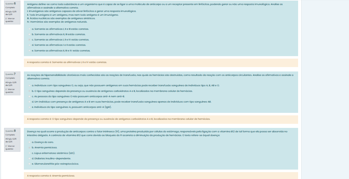 Questão 6 Antigeno define-se como um organismo que e capaz de se ligar uma de anticorpo DU um receptor presente em podendo gerar não uma resposta Analise as afirmativas e assinale são antigenos capazes de ativar e gerar uma resposta de Todo é um antigeno, mas nem todo antigeno e um Marcar Acidos nucléicos exemplos de antigenos IV. exemplos de antigenos Somente as afirmativas estão b. Somente as afirmativas estão Somente as afirmativas estão d. Somente as afirmativas estão corretas Somente as estão A resposta Somente as afirmativas e IV estão 7 As reações de hipersensibilidade citotóxicas mais conhecidas as reações de nas quais as hemácias destruídas, como resultado reação com os anticorpos circulantes Analise as afirmativas assinale Complete alternativa 0.05 de a Individuos com tipo sanguineo ou seja, que não antigenos em suas pode receber transfusão de individuos tipo All Marcar b. tipo sanguineo depende da presença ou de antigenos carboidratos localizados membrana celular de As pessoas do tipo sanguineo não anticorpos anti- A nem Um individuo com presença de antigenos A em suas pode receber transfusão de individuos com tipo sanguineo AB. do tipo sanguineo anticorpos A resposta tipo sanguineo depende presença ou de antigenos carboidratos A localizados no membrana celular de Questão 8 Doença no qual ocorre produção de anticorpos fator intrinseco (FI), uma proteina produzida por células do responsáveis ligação com vitamina B12 de tal forma que possa ser no Completo intestino A caréncia de vitamina que corre devido bloqueio do FI acarreta diminuição produção de texto refere-se doença: Atingiu de Doença do b. Anemia questão Lúpus (LES). Diabetes pós-estreptocócica A correto Anemia