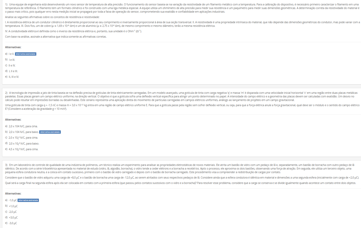 1) Uma equipe de engenharia está desenvolvendo um novo sensor de temperatura de alta precisão. 0 funcionamento do sensor baseia-se na variação da resistividade de um filamento metálico com a temperatura. Para a calibração do dispositivo, é necessário primeiro caracterizar 0 filamento em uma temperatura de referência. 0 filamento tem um formato e foi construído com uma liga metálica especial. A equipe utiliza um ohmimetro de alta precisão para medir sua resistência e um paquimetro para medir suas dimensões geométricas. A determinação correta da resistividade do material é 0 passo mais critico, pois qualquer erro nesta medição inicial se propagará por toda a faixa de operação do sensor, comprometendo sua exatidão e confiabilidade em aplicações Analise as seguintes afirmativas sobre conceitos de resistência e resistividade: A resistência elétrica de um condutor cilindrico é diretamente proporcional ao seu comprimento e inversamente proporcional de sua seção A resistividade é uma propriedade intrinseca do material, que não depende das dimensões geométricas do condutor, mas pode variar com a temperatura. III. Dois fios, um de cobre (p 1,69 e um de (p 2,75 X 10-8 de mesmo comprimento e mesmo diâmetro, terão a mesma resistência elétrica. IV. A condutividade elétrica é definida como inverso da resistência elétrica e, portanto, sua unidade é 0 Com base na assinale a alternativa que indica somente as afirmativas Alternativas: a) assinalada b) III. c) IV. d) III. e) III IV. 2) A tecnologia de impressão a jato de tinta baseia-se na deflexão precisa de de tinta eletricamente carregadas. Em um modelo avançado, uma de tinta com carga negativa e massa 'm' disparada com uma velocidade inicial horizontal em uma região entre duas placas metálicas paralelas. Essas placas geram um campo elétrico uniforme, na direção vertical. 0 objetivo que a sofra uma deflexão vertical especifica para atingir um ponto determinado no papel. A intensidade do campo elétrico e a geometria das placas devem ser calculadas com exatidão. Um desvio no cálculo pode resultar em impressões borradas ou desalinhadas. Este cenário representa uma aplicação direta do movimento de particulas carregadas em campos elétricos uniformes, análogo ao lançamento de projéteis em um campo gravitacional. Uma de tinta com carga -1,5 nC e massa m 3,0 X 10-12 kg entra em uma região de campo elétrico uniforme E. Para que a goticula passe pela região sem sofrer deflexão vertical, ou seja, para que a força elétrica anule a força gravitacional, qual deve ser 0 módulo e 0 sentido do campo elétrico E? (Considere a aceleração da gravidade g 10 Alternativas: a) 2,0 X 104 N/C, para cima. b) 2.0 X 104 N/C, para baixo. Alternativa assinalada c) 2,0 N/C, para d) 2.0 X 10¿² N/C, para e) 4,5 X 10¿² N/C, para 3) Em um laboratório de controle de qualidade de uma indústria de um técnico realiza um experimento para analisar as propriedades eletrostáticas de novos Ele atrita um bastão de vidro com um pedaço de e, separadamente, um bastão de borracha com outro pedaço de De acordo com a série triboelétrica apresentada no material de estudo (vidro, algodão, borracha). 0 vidro tende a ceder elétrons e a borracha a Após processo, ele aproxima dois bastões, observando uma força de atração. Em seguida, ele utiliza um terceiro objeto, uma pequena esfera condutora neutra, e a coloca em contato sucessivo, primeiro com bastão de vidro carregado e depois com 0 bastão de borracha carregado. Este procedimento visa a compreender a redistribuição de cargas por Considere que bastão de vidro adquiriu uma carga de +8,0 e bastão de borracha uma carga de -12,0 ao serem atritados com seus respectivos pedaços de Considere ainda que a esfera condutora em material dimensões a uma segunda esfera (inicialmente com carga de +2,0 Qual será a carga final na segunda esfera após ela ser colocada em contato com a primeira esfera (que passou pelos contatos sucessivos com 0 vidro e a borracha)? Para resolver esse problema, considere que a carga se conserva e se divide igualmente quando acontece um contato entre dois objetos. Alternativas: a) -1,0 assinalada b) c) d) e)
