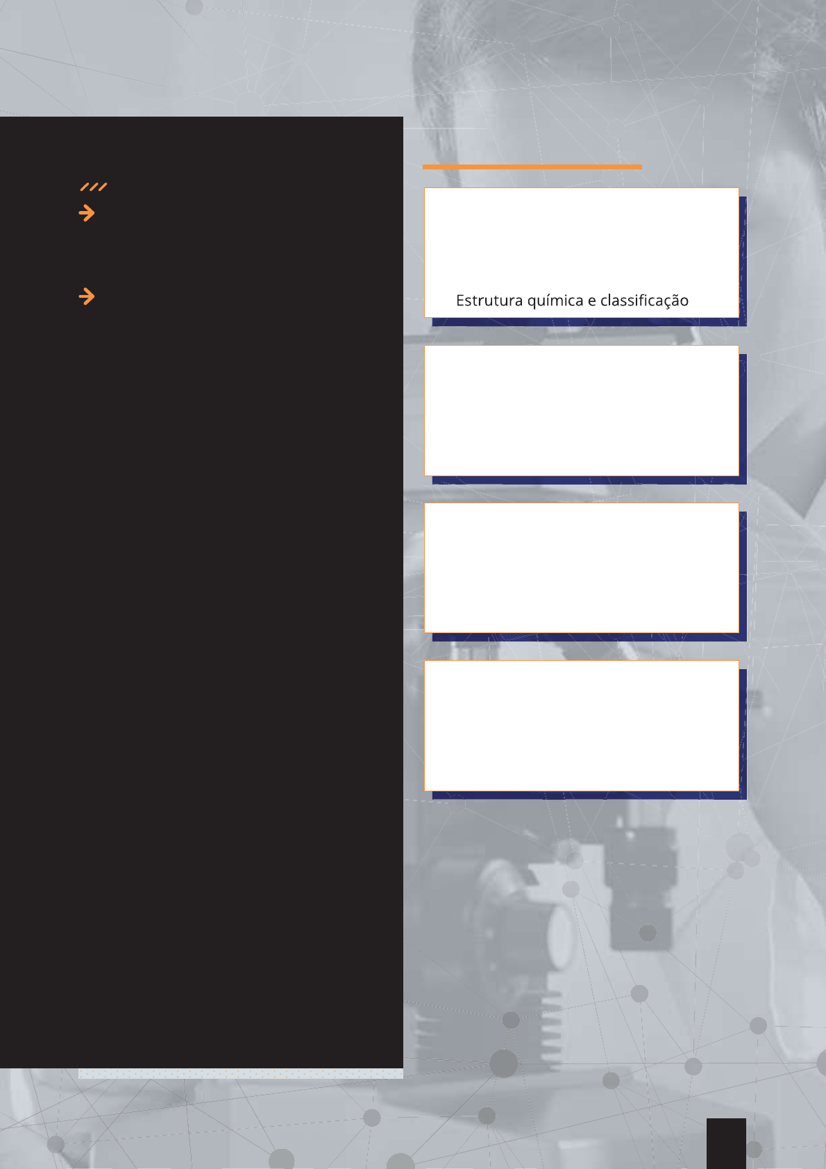Objetivos do capítulo Compreender as diferenças químicas e funcionais entre as classes de lipídios presentes biologicamente; Entender os papéis cruciais dos lipídios nos sistemas biológicos. LIPÍDIOS NÃO SAPONIFICÁVEIS • Introdução • Propriedades e importância • Esteróis e esteroides • Terpenos e terpenóides LIPÍDIOS SAPONIFICÁVEIS • Introdução • Triacilgliceróis • Ceras • Lipídios de membrana LIPÍDIOS BIOLOGICAMENTE ATIVOS • Introdução • Mensageiros e sinais • Cofatores enzimáticos • Pigmentos TÓPICOS DE ESTUDO LIPÍDES, GORDURAS OU LIPÍDIOS • Introdução • Fontes de lipídios • Propriedades e funções • BIOQUÍMICA GERAL 131 A gordura ganhou status de vilã nos últimos tempos. Eliminá-la da rotina alimentar e do corpo tem sido o objetivo principal de diversas dietas e de atividades físicas “da moda” que conquistam um número cada vez maior de adeptos. Mas o que pouco se fala é da importância que a gordura tem para a saúde. Nesse caso, mais do que nun- ca, vale a frase “tudo em exagero faz mal”, mas em doses equilibradas, as gorduras senciais para o nosso corpo. Mas o que de fato são os lipídios e qual a sua importância em nosso organismo? Contextualizando o cenário BIOQUÍMICA GERAL 132 Lipídios6. Dentre os principais marcos históricos de descobertas relacionadas a lipídios, destaca-se o estabelecimento do modelo de membrana celular. Em 1924, Frick determinou a espessura da membrana celular através de experimentos de medida da capacitância de soluções de eritró- citos. Gorter e Grandel realizaram experimentos de extração lipídica a partir das membranas celulares e foram capazes de observar a formação de monocamadas. O modelo de mosaico Além disso, outro marco histórico relacionado à história dos lipídeos em geral consiste na realização de um Congresso Internacional de Bioquímica em 1922, em que estabeleceu-se que os ésteres que, por hidrólise, fornecem ácidos carboxílicos superiores (ácidos graxos) seriam enquadrados num grupo geral, os lipídios ou lípides (do grego lipo, gordura). Lipídes, gorduras ou lipídios6.1 Os lipídios são um amplo grupo de compostos químicos orgânicos naturais, que constituem hidrogênio e oxigênio, apesar de também poder conter fósforo, nitrogênio e enxofre, entre os quais se incluem gorduras, ceras, esteróis, vitaminas lipossolúveis (como as vitaminas A, D, E, e K), fosfolipídios, entre outros. Alguns lípidos são moléculas lineares ou curvadas e outros são compostos cíclicos. Podem parte polar e outra não polar, e podem dissolver no meio aquoso estruturas como vesículas, lipossomas ou membranas. Os lipídios são geralmente incolores, un- tuosos ao tato, pouco consistentes e apre- sentam densidade menor do que a da água, na qual são insolúveis, porém emulsionáveis. lúveis a quente. Além disso, dissolvem-se em sulfeto de carbono, clorofórmio, éter etílico, acetona, benzeno, gasolina e outros solventes rosas e translúcidas, que não desaparecem BIOQUÍMICA GERAL 133 Introdução6.1.1 Os lipídios, também chamados de lípides e gorduras, são um grupo de biomoléculas com- postas principalmente por carbono, hidrogênio e oxigênio, podendo ter outros elementos, mos vivos, estando presentes neles ou sendo obtidos deles. Têm como característica comum a insolubilidade em água. Fontes de lipídios6.1.2 Os lipídios são constituintes dos seres vivos, e suas principais fontes alimentares são de origem animal e vegetal. Como fornecem calorias na dieta, devem ser consumidos de maneira equilibrada. Alimentos de origem animal que são fontes lipídicas incluem o leite, a manteiga, os ovos, os peixes e as carnes vermelhas. Já entre os vegetais, desta- cam-se o abacate, o coco, a soja, a canola, o azeite de oliva e as oleaginosas (nozes, cas- tanhas, amêndoas, gergelim) como fonte de lipídios. pelo aquecimento. Como as gorduras são usadas em processo de frituras seguidamente realizadas em reci- pientes abertos, em temperatura elevada (180 – 200 °C), há o contato direto com o ar. Tais con- ção), algumas das quais são perceptíveis pelo próprio escurecimento das gorduras, o aumento da viscosidade, a formação de espuma e produção de fumaça. Essas transformações afetam o sabor que a fritura confere aos produtos fritos, mas também produzem efeitos tóxicos, como irritação gastrointestinal, inibição de enzimas, destruição de vitaminas e carcinogênese, quan- Propriedades e funções6.1.3 Os lipídios são caracterizados quimicamente por sua baixa solubilidade em água e em solventes polares e alta solubilidade em solventes orgânicos, apolares, como álcool, éter, clo- rofórmio e acetona. Os lipídios são chamados de óleos, se líquidos à temperatura de 20ºC; e de gorduras, se sólidos na mesma temperatura. Podem ainda ser chamados de azeites, quando têm origem BIOQUÍMICA GERAL 134 ESCLARECIMENTO: do degradada é o triacilglicerol ou triglicerídeo, que é constituído por uma molécula de glicerol ligada a três ácidos graxos. na polpa de frutos (como é o caso do azeite de oliva e de dendê), ou de manteigas, como alguns lipídios de origem vegetal, a exemplo do cacau e de karité. Óleos e gorduras podem atuar como mo- léculas de reserva de energia em vegetais e animais. Esses lipídios de armazenamento possuem duas características que os tornam moléculas extremamente vantajosas a serem utilizadas como reserva de energia. A primei- ra é a sua hidrofobicidade, pois, quando a célula armazena lipídio em seu interior, essa molécula não carrega água de solvatação, como aconteceria com uma molécula solúvel em água. Dessa forma, as células que armazenam lipídios não carregam um peso extra da água de hidratação. A segunda característica dos lipídios está relacionada à sua grande capacidade de gerar energia quando degradados. Cada grama de lipídio metabolizado gera 9 kcal de energia, d