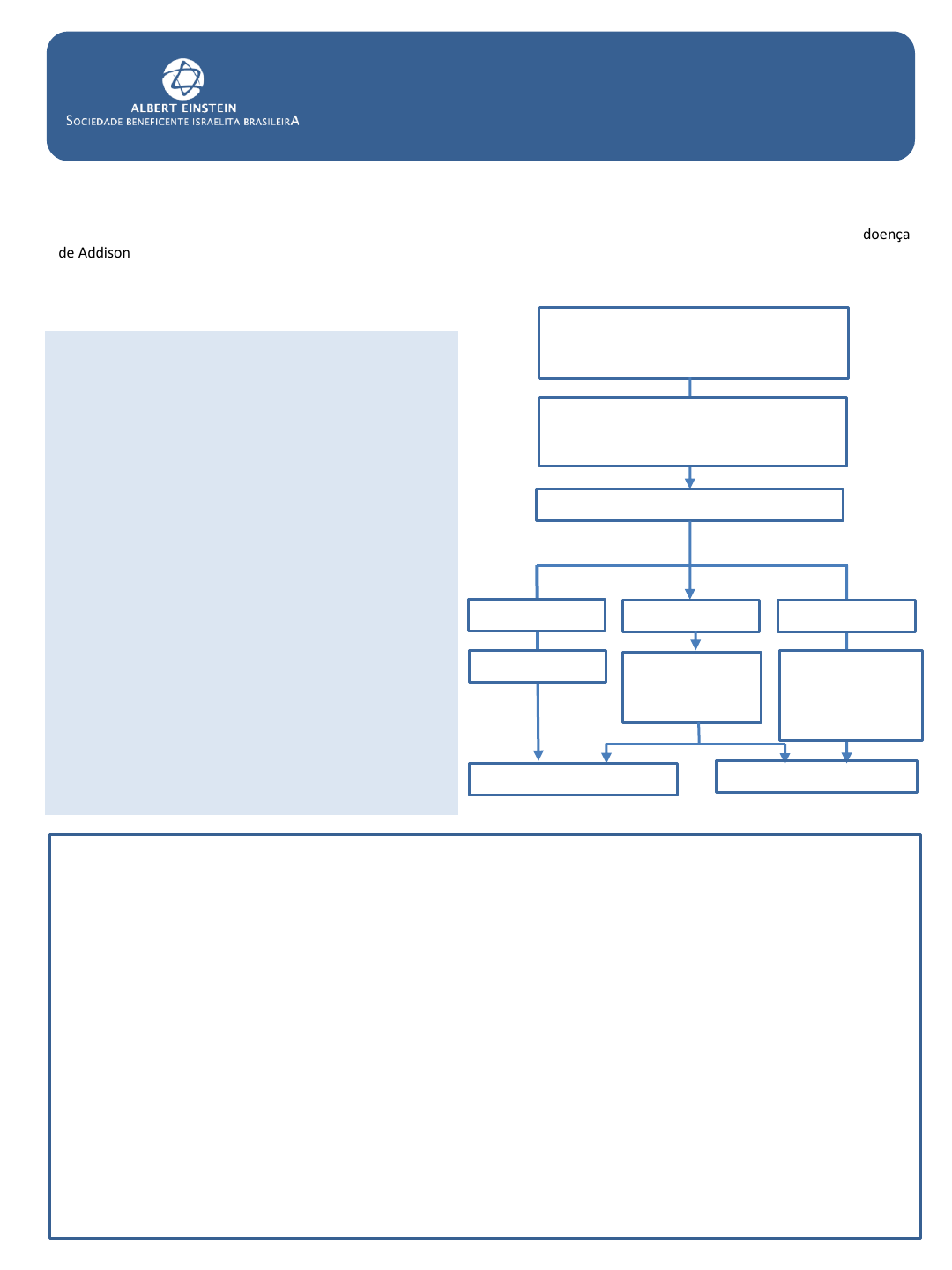 Guia do Episódio de Cuidado Insuficiência Adrenal Aguda 1. DIAGNÓSTICO Suspeita diagnóstica A insuficiência adrenal aguda é comorbidade rara nas emergências, com sinais e sintomas inespecíficos. Porém, se não suspeitada e tratada adequadamente, pode apresentar desfecho desfavorável. Atenção especial para pacientes com uso prévio de corticoide e sob injúria aguda como sepse, pós-operatório ou trauma. Sinais e sintomas • Astenia e prostração • Febre • Desidratação e hipovolemia • Hipotensão refratária • Hipoxemia refratária • Cefaleia • Alteração do nível de consciência • Náuseas e vômitos • Dor abdominal e diarreia • Hipoglicemia • Hiponatremia • Hipocalemia • Eosinofilia • Acidose metabólica 2. EXAMES A insuficiência adrenal é a deficiência na produção de hormônios pelo córtex adrenal. A perda abrupta da produção destes hormônios ou uma condição de estresse ao organismo ( infecção, cirurgia, trauma ) em vigência de deficiência crônica desses hormônios pode levar o indivíduo à insuficiência adrenal aguda. A insuficiência adrenal pode ser primária, por lesão direta do tecido suprarrenal, sendo a causa mais frequente autoimune (doença de Addison). Nesse caso ocorre a deficiência de glico e mineralocorticoide. Já a insuficiência adrenal secundária se dá por alteração hipotálamo-hipofisária, com deficiência apenas da produção de glicocorticoide, o que reduz a chance de insuficiência adrenal aguda. • Dosagem de cortisol sérico >18mcg/dL: Insuficiência adrenal improvável, buscar diagnóstico alternativo; 3-18mcg/dL : Realizar teste de estímulo com 250mcg de cortrosina; 18mcg/dL indica baixa probabilidade de resposta a corticoterapia; • Pico de cortisol
