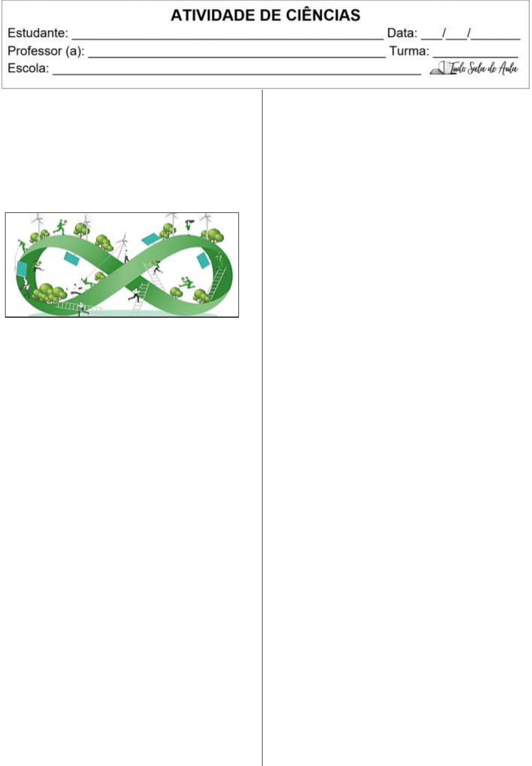 DESENVOLVIMENTO SUSTENTÁVEL O desenvolvimento sustentável é um modelo que busca promover o progresso econômico, social e político, junto com a preservação do meio ambiente, levando em conta que os recursos naturais são limitados. Isso significa utilizar os recursos de forma racional, garantindo o bem-estar das gerações atuais sem comprometer a disponibilidade deles para as gerações futuras. Para alcançar esse objetivo, é necessário o engajamento da sociedade civil, das empresas e dos governantes. Princípios do desenvolvimento sustentável O desenvolvimento sustentável se apoia em três pilares e princípios principais: sustentabilidade ambiental, sustentabilidade econômica e sustentabilidade social. Sustentabilidade ambiental: refere-se ao uso racional e consciente dos recursos naturais, buscando a conservação e a manutenção da biodiversidade. Sustentabilidade econômica: está ligada as práticas econômicas, financeiras e administrativas que promovem o crescimento econômico sem causar grandes impactos negativos ao meio ambiente e às comunidades. Sustentabilidade social: busca garantir o bem-estar da população por meio da redução das desigualdades e da garantia dos direitos básicos de todos os cidadãos. Objetivos do desenvolvimento sustentável Em 2015, durante a Cúpula das Nações Unidas sobre Desenvolvimento Sustentável, foram definidos os Objetivos de Desenvolvimento Sustentável (ODS). Eles representam um compromisso mundial para erradicar a pobreza, preservar o meio ambiente e o clima, além de assegurar paz e prosperidade para todas as pessoas até 2030. Os 17 ODS são: 1. Erradicação da pobreza; 2. Fome zero e agricultura sustentável; 3. Saúde e bem-estar; 4. Educação de qualidade; 5. Igualdade de gênero; 6. Água potável e saneamento; 7. Energia limpa e acessível; 8. Trabalho decente e crescimento econômico; 9. Indústria, inovação e infraestrutura; 10. Redução das desigualdades; 11. Cidades e comunidades sustentáveis; 12. Consumo e produção responsáveis; 13. Ação contra a mudança global do clima; 14. Vida na água; 15. Vida terrestre; 16. Paz, justiça e instituições eficazes; 17. Parcerias e meios de implementação. Ações sustentáveis Com a Revolução Industrial, a exploração dos recursos naturais cresceu em resposta aos padrões de consumo, modificando a forma como o ser humano se relaciona com a natureza. Hoje, entende-se que, para garantir o desenvolvimento, pessoas e empresas precisam adotar práticas sustentáveis, como: Fazer o descarte adequado do lixo e dos rejeitos; Utilizar energias limpas e renováveis; Optar por meios de transporte menos poluentes; Priorizar o transporte coletivo em vez do individual; Utilizar produtos biodegradáveis; Evitar o desperdício de água; Reduzir o desmatamento e as queimadas; Promover o reflorestamento. Larissa Fonteles https://www.tudosaladeaula.com/ Atividades___________________________________ 1. Conceitue desenvolvimento sustentável ________________________________________________ ________________________________________________ ________________________________________________ ________________________________________________ ________________________________________________ ________________________________________________ https://www.tudosaladeaula.com/ https://www.tudosaladeaula.com/ 2. No diagrama abaixo, escreva os princípios do desenvolvimento sustentável. Adaptado de https://www.todamateria.com.br/desenvolvimento- sustentavel/ 3. Descreva os pilares do desenvolvimento sustentável. 4. Leia com atenção a tirinha abaixo. Disponível em https://pvtribosemcena.blogspot.com/2015/06/tirinha-de- conscientizacao.html O autor da tirinha mostra que a) a natureza consegue se recuperar em tempo hábil. b) a urbanização está de acordo com o uso racional dos recursos naturais. c) as práticas de desenvolvimento urbano comprometem a qualidade de vida das gerações futuras. d) a destruição do bosque representa um exemplo de desenvolvimento sustentável. 5. Abaixo, identifique os responsáveis pelo desenvolvimento sustentável. 6. Com base nas ilustrações, indique ações sustáveis que devem ser tomadas por pessoas e empresas. 7. Observe os objetivos abaixo e preencha os que estão faltando. ________________________________________________ ________________________________________________ ________________________________________________ ________________________________________________ ________________________________________________ ________________________________________________ https://www.tudosaladeaula.com/ https://www.tudosaladeaula.com/ https://www.tudosaladeaula.com/ https://www.tudosaladeaula.com/ https://www.tudosaladeaula.com/ 8. Observe as lixeiras e indique corretamente quais materiais devem ser descartados em cada uma delas. 9. Atribua V (verdadeiro) ou F (falso) para as sentenças abaixo. ( ) Os recursos naturais são inesgotáveis. ( ) Todos devemos tomar atitudes sustentáveis. ( ) As mudanças climáticas extremas são eventos naturais, sem interferência humana. ( ) O uso dos recursos naturais não deve levar em consideração as gerações futuras. ( ) Planos globais devem ser traçados para preservar o meio ambiente. 10. Leia o trecho abaixo. Em setembro de 2015, os países-membros das Nações Unidas aprovaram por unanimidade o documento “Transformando Nosso Mundo: A Agenda 2030 para o Desenvolvimento Sustentável”, baseado em cinco eixos de atuação: Paz, Pessoas, Planeta, Prosperidade e Parcerias. Disponível em https://sc.movimentoods.org.br/os-5ps-da- sustentabilidade/ Acesso em 2 de setembro de 2025. Abaixo, associe corretamente cada P da sustentabilidade (Pessoas, planeta, prosperidade, paz e parceria) conforme as descrições. I. Garantir vidas prosperas e plenas, em harmonia com a natureza. ________________________________________________ II. Proteger os recursos naturais e o clima do nosso planeta para as gerações futuras. _________