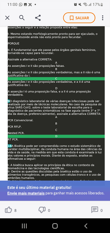 11:00 all 17% X SALVAR asserções a seguir e a relação proposta entre elas: Mesmo estando morfologicamente pronto para ser ejaculado, 0 espermatozoide ainda não está pronto para fecundar. PORQUE II- E fundamental que ele passe pelos órgãos genitais femininos, tornando-se capaz para fecundar. Assinale a alternativa CORRETA: A As asserções I e II são proposições falsas. B As asserções I e II são proposições verdadeiras, mas a II não é uma justificativa da As asserções I e II são proposições verdadeiras, e a II é uma justificativa da D A asserção I uma proposição falsa, e a II uma proposição verdadeira. 90 laboratorial de varias doenças infecciosas pode ser realizado por meio de técnicas moleculares. No caso da pesquisa do virus SARS CoV2, sobre 0 teste laboratorial de escolha para 0 de pacientes na fase aguda (entre e 7° dia da doença, preferencialmente), assinale a alternativa CORRETA: A PCR Convencional. B PCR RFLP. C Nested PCR. D RT PCR. 10A Bioética pode ser compreendida como 0 estudo de multidisciplinar, da conduta humana na area das ciencias da vida e da saúde, na medida em que esta conduta examinada à luz dos valores e morais. Diante do exposto, analise as afirmativas a seguir: A bioética busca aplicar os da ética no contexto da biomedicina e das tecnologias cientificas. II- Dentre as questões discutidas pela estão 0 uso de alimentos transgênicos, as pesquisas com células-tronco e uso de humanos. Este é seu último material gratuito! Envie mais materiais para ganhar mais acessos liberados. 8 0 0