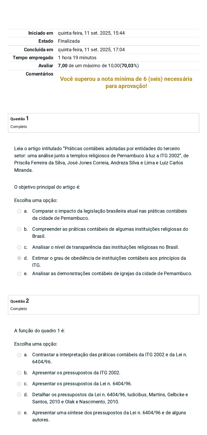 Iniciado em quinta-feira, 11 set. 2025, 15:44 Estado Finalizada Concluída em quinta-feira, 11 set. 2025, 17:04 Tempo empregado 1 hora 19 minutos Avaliar 7,00 de um máximo de 10,00(70,03%) Comentários Você superou a nota mínima de 6 (seis) necessária para aprovação! Questão 1 Completo Questão 2 Completo Leia o artigo intitulado “Práticas contábeis adotadas por entidades do terceiro setor: uma análise junto a templos religiosos de Pernambuco à luz a ITG 2002”, de Priscila Ferreira da Silva, José Jones Correia, Andreza Silva e Lima e Luiz Carlos Miranda. O objetivo principal do artigo é: Escolha uma opção: a. Comparar o impacto da legislação brasileira atual nas práticas contábeis da cidade de Pernambuco. b. Compreender as práticas contábeis de algumas instituições religiosas do Brasil. c. Analisar o nível de transparência das instituições religiosas no Brasil. d. Estimar o grau de obediência de instituições contábeis aos princípios da ITG. e. Analisar as demonstrações contábeis de igrejas da cidade de Pernambuco. A função do quadro 1 é: Escolha uma opção: a. Contrastar a interpretação das práticas contábeis da ITG 2002 e da Lei n. 6404/96. b. Apresentar os pressupostos da ITG 2002. c. Apresentar os pressupostos da Lei n. 6404/96. d. Detalhar os pressupostos da Lei n. 6404/96, Iudicibus, Martins, Gelbcke e Santos, 2010 e Olak e Nascimento, 2010. e. Apresentar uma síntese dos pressupostos da Lei n. 6404/96 e de alguns autores. Questão 3 Completo Questão 4 Completo O quadro 3 aponta que: Escolha uma opção: a. Os autores analisam que as instituições religiosas tem cumprido satisfatoriamente com suas obrigações principais e acessórias. b. Os resultados do quadro 3 não estão de acordo com os achados da pesquisa de Paixão e Lourenço (1994). c. Somente 3 das 15 instituições religiosas cumpriram todas as obrigações principais e acessórias. d. Mais da metade das instituições religiosas cumpriu com a contribuição DACOM. e. Uma minoria das instituições religiosas cumpriu com a contribuição para o PIS/PASEP. As conclusões da pesquisa revelam que: Escolha uma opção: a. Os autores sugerem que sejam realizados estudos em instituições de outros Estados do Brasil, a fim de verificar se Estados com menor número de fiéis apresentam práticas contábeis diferentes. b. Há necessidade de uma maior regulamentação por parte dos órgãos legislativos, os quais devem propor leis mais eficazes no controle das práticas contábeis de instituições religiosas. c. Os autores apontam que o estudo tem como limitação o difícil acesso dos pesquisadores a instituições religiosas. d. Pouco menos da metade das instituições religiosas elaboram demonstrações contábeis, o que revela médio grau de aderência das instituições à legislação. e. Os órgãos fiscalizadores devem ser melhor equipados para garantir o controle e a verificação das práticas contábeis em instituições religiosas. Questão 5 Completo Questão 6 Completo A análise das referências revela que: Escolha uma opção: a. A referência a Paixão e Lourenço (1994) é dispensável pois trata das práticas contábeis em Portugal. b. A Constituição Brasileira é referência dispensável para a argumentação do texto. c. O trabalho de Iudicibus, Martins, Gelbcke e Santos (2010) constitui uma das referências principais da pesquisa. d. O uso de Vergara (2006) é fundamental para a construção do referencial teórico específico do texto. e. Os textos em língua inglesa não são devidamente mencionados no artigo. Assinale Verdadeiro ou Falso: A metodologia não apresenta categorias ou variáveis de forma explícita. O item ‘Fundamentos’ poderia vir antes do item ‘Objetivo’ sem prejuízo da compreensão e organização textual. Os resultados objetivos estão apresentados de forma separada. O ‘abstract’ (resumo em língua inglesa) não é elemento obrigatório do texto acadêmico. O resumo apresenta extensão adequada para o artigo científico em análise. As conclusões sugerem estudos futuros. As conclusões apresentam uma retomada e uma síntese dos resultados. Na fundamentação teórica, fica claro que os autores baseiam sua argumentação na ITG 2002 e na pesquisa de Ihemeje, Okereafor e Ogungbangbe (2015). Os resultados avaliativos apresentam uma síntese dos resultados objetivos. O primeiro parágrafo da Introdução deixa clara a justificativa do tema do texto, a saber, práticas contábeis adotadas em templos religiosos. O resumo apresenta todas as etapas do artigo. As palavras-chave não estão plenamente adequadas ao artigo. Falso Verdadeiro Verdadeiro Falso Verdadeiro Verdadeiro Verdadeiro Verdadeiro Verdadeiro Verdadeiro Verdadeiro Falso Questão 7 Completo Leia a seção de Referencial teórico do artigo “Desenvolvimento sustentável, consumo e cidadania: um estudo sobre a (des)articulação da comunicação de organizações da sociedade civil, do Estado e das Empresas” (2011), de autoria de Daniela Viegas da Costa e Armindo dos Santos de Sousa Teodósio. Em seguida, escolha V ou F para as seguintes afirmações. As duas citações de Makower (1990) na p. 121 do artigo científico tem a função de se contrapor às citações do mesmo parágrafo. A utilização do verbo dicendi ‘destaca’ na expressão ‘Portilho (2005) destaca na página 121 do artigo científico (item 2.1) indica que o autor pretende enfatizar a ideia de consumo verde na argumentação do texto. A citação de Sachs (2004) no terceiro parágrafo do item 2.1 não apresenta página uma vez que se trata de discurso indireto. A citação de Baumann (2007) no segundo parágrafo do item 2.1 tem a função de contraponto e de complementação da argumentação do texto. O marcador de conformidade ‘Segundo’ na expressão ‘Segundo Lipovetsky (1989)’ no sétimo parágrafo do item 2. 1 pode ser substituído sem prejuízo de sentido por ‘Ainda’. A utiliza