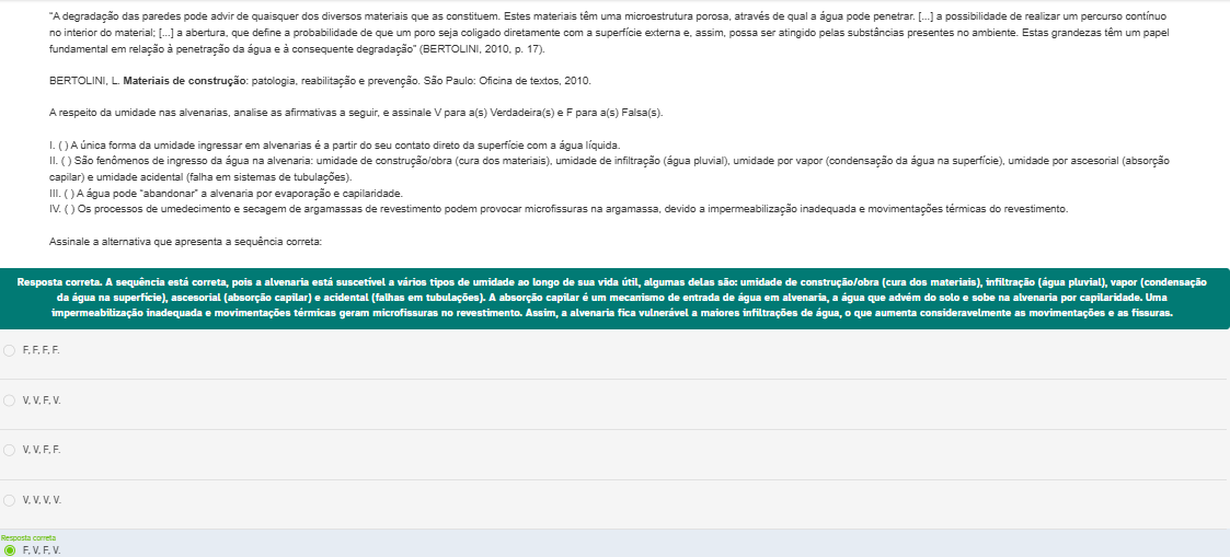 "A degradação das paredes pode advir de quaisquer dos diversos materiais que as constituem. Estes materiais têm uma microestrutura porosa, através de qual a água pode penetrar. [...] a possibilidade de realizar um percurso continuo no interior do material; a abertura, que define a probabilidade de que um poro seja coligado diretamente com a assim, possa ser atingido pelas substâncias presentes no Estas grandezas têm um papel fundamental em relação à penetração da água à consequente degradação" (BERTOLINI, p. 17). L Materiais de construção: patologia, reabilitação e prevenção. São Paulo: Oficina de textos, 2010. A respeito da umidade nas analise as afirmativas a seguir, e assinale V para a(s) Verdadeira(s) e F para a(s) Falsa(s). A forma da umidade ingressar em alvenarias é a partir do seu contato direto da superficie com a líquida. () fenômenos de ingresso da na umidade de construção/obra (cura dos materiais). umidade de infiltração (água umidade por vapor (condensação da na umidade por ascesorial (absorção capilar) e umidade acidental (falha em sistemas de III. () A pode "abandonar" a alvenaria por evaporação e capilaridade. IV. () Os processos de umedecimento e secagem de argamassas de revestimento podem provocar microfissuras na devido a impermeabilização inadequada e movimentações do revestimento Assinale a alternativa que apresenta a correta: Resposta correta. A sequência correta, pois a alvenaria suscetivel a tipos de umidade ao longo de sua vida util, algumas delas são: umidade de construção/obra (cura dos materiais), infiltração pluvial), vapor (condensação da na superficie), ascesorial (absorção capilar) e acidental (falhas em tubulações). A absorção capilar um mecanismo de entrada de em alvenaria, a agua que do solo e sobe na alvenaria por capilaridade. Uma impermeabitização inadequada e movimentações geram microfissuras no revestimento. Assim, a alvenaria fica vulnerável a maiores infiltrações de que aumenta consideravelmente as movimentações e as fissuras. V.V.F.V. V.V.F.F. V.V.V.V. Resposta