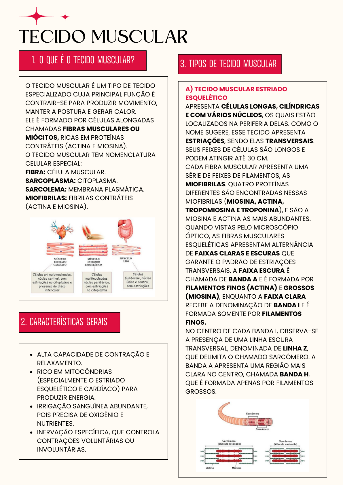1. O QUE É O TECIDO MUSCULAR? 2. CARACTERÍSTICAS GERAIS 3. TIPOS DE TECIDO MUSCULAR TECIDO MUSCULAR O TECIDO MUSCULAR É UM TIPO DE TECIDO ESPECIALIZADO CUJA PRINCIPAL FUNÇÃO É CONTRAIR-SE PARA PRODUZIR MOVIMENTO, MANTER A POSTURA E GERAR CALOR. ELE É FORMADO POR CÉLULAS ALONGADAS CHAMADAS FIBRAS MUSCULARES OU MIÓCITOS, RICAS EM PROTEÍNAS CONTRÁTEIS (ACTINA E MIOSINA). O TECIDO MUSCULAR TEM NOMENCLATURA CELULAR ESPECIAL: FIBRA: CÉLULA MUSCULAR. SARCOPLASMA: CITOPLASMA. SARCOLEMA: MEMBRANA PLASMÁTICA. MIOFIBRILAS: FIBRILAS CONTRÁTEIS (ACTINA E MIOSINA). ALTA CAPACIDADE DE CONTRAÇÃO E RELAXAMENTO. RICO EM MITOCÔNDRIAS (ESPECIALMENTE O ESTRIADO ESQUELÉTICO E CARDÍACO) PARA PRODUZIR ENERGIA. IRRIGAÇÃO SANGUÍNEA ABUNDANTE, POIS PRECISA DE OXIGÊNIO E NUTRIENTES. INERVAÇÃO ESPECÍFICA, QUE CONTROLA CONTRAÇÕES VOLUNTÁRIAS OU INVOLUNTÁRIAS. A) TECIDO MUSCULAR ESTRIADO ESQUELÉTICO APRESENTA CÉLULAS LONGAS, CILÍNDRICAS E COM VÁRIOS NÚCLEOS, OS QUAIS ESTÃO LOCALIZADOS NA PERIFERIA DELAS. COMO O NOME SUGERE, ESSE TECIDO APRESENTA ESTRIAÇÕES, SENDO ELAS TRANSVERSAIS. SEUS FEIXES DE CÉLULAS SÃO LONGOS E PODEM ATINGIR ATÉ 30 CM. CADA FIBRA MUSCULAR APRESENTA UMA SÉRIE DE FEIXES DE FILAMENTOS, AS MIOFIBRILAS. QUATRO PROTEÍNAS DIFERENTES SÃO ENCONTRADAS NESSAS MIOFIBRILAS (MIOSINA, ACTINA, TROPOMIOSINA E TROPONINA), E SÃO A MIOSINA E ACTINA AS MAIS ABUNDANTES. QUANDO VISTAS PELO MICROSCÓPIO ÓPTICO, AS FIBRAS MUSCULARES ESQUELÉTICAS APRESENTAM ALTERNÂNCIA DE FAIXAS CLARAS E ESCURAS QUE GARANTE O PADRÃO DE ESTRIAÇÕES TRANSVERSAIS. A FAIXA ESCURA É CHAMADA DE BANDA A E É FORMADA POR FILAMENTOS FINOS (ACTINA) E GROSSOS (MIOSINA), ENQUANTO A FAIXA CLARA RECEBE A DENOMINAÇÃO DE BANDA I E É FORMADA SOMENTE POR FILAMENTOS FINOS. NO CENTRO DE CADA BANDA I, OBSERVA-SE A PRESENÇA DE UMA LINHA ESCURA TRANSVERSAL, DENOMINADA DE LINHA Z, QUE DELIMITA O CHAMADO SARCÔMERO. A BANDA A APRESENTA UMA REGIÃO MAIS CLARA NO CENTRO, CHAMADA BANDA H, QUE É FORMADA APENAS POR FILAMENTOS GROSSOS. ☆ CONTROLE: VOLUNTÁRIO (CONTROLADO PELO SISTEMA NERVOSO SOMÁTICO). ☆ FUNÇÃO: MOVIMENTAR O CORPO, MANTER POSTURA, GERAR CALOR. ☆ LOCALIZAÇÃO: PRESO AOS OSSOS POR TENDÕES. CARACTERÍSTICAS AO MICROSCÓPIO: ▪ FIBRAS LONGAS, CILÍNDRICAS E MULTINUCLEADAS. ▪ NÚCLEOS NA PERIFERIA DA CÉLULA. ▪ ESTRIAÇÕES TRANSVERSAIS VISÍVEIS (LISTRAS CLARAS E ESCURAS) CAUSADAS PELO ARRANJO DE ACTINA E MIOSINA. EXEMPLO: BÍCEPS, QUADRÍCEPS, PEITORAIS. B) TECIDO MUSCULAR ESTRIADO CARDÍACO ☆ CONTROLE: INVOLUNTÁRIO (CONTROLADO PELO SISTEMA NERVOSO AUTÔNOMO E MARCAPASSO CARDÍACO). NESSE TIPO DE MÚSCULO, AS CÉLULAS APRESENTAM UMA SÉRIE DE MITOCÔNDRIAS, O QUE É FÁCIL DE SER COMPREENDIDO, UMA VEZ QUE ELAS POSSUEM GRANDE METABOLISMO E NECESSITAM CONSTANTEMENTE DE ATP. ☆ FUNÇÃO: BOMBEAR O SANGUE PELO CORPO. ☆ LOCALIZAÇÃO: SOMENTE NO CORAÇÃO. CARACTERÍSTICAS AO MICROSCÓPIO: ▪ FIBRAS ESTRIADAS COMO O ESQUELÉTICO, MAS CURTAS, RAMIFICADAS E UNINUCLEADAS (1 OU 2 NÚCLEOS CENTRAIS). ▪ PRESENÇA DE DISCOS INTERCALARES: JUNÇÕES ESPECIALIZADAS QUE PERMITEM PASSAGEM RÁPIDA DO ESTÍMULO ELÉTRICO E SINCRONIZAÇÃO DAS CONTRAÇÕES. ▪ CONTRAÇÃO RÍTMICA E AUTOMÁTICA. C) TECIDO MUSCULAR LISO ☆ CONTROLE: INVOLUNTÁRIO (CONTROLADO PELO SISTEMA NERVOSO AUTÔNOMO E HORMÔNIOS). ☆ FUNÇÃO: MOVIMENTOS LENTOS E CONTÍNUOS (PERISTALTISMO, CONTRAÇÃO DE VASOS, ETC.) EMPURRANDO O ALIMENTO AO LONGO DO TUBO DIGESTÓRIO; REGULANDO O FLUXO DE AR DOS PULMÕES, ATRAVÉS DO CONTROLE DO DIÂMETRO DOS BRÔNQUIOS E BRONQUÍOLOS; REGULANDO O FLUXO DE SANGUE PARA REGIÕES DO CORPO ATRAVÉS DO CONTROLE DO DIÂMETRO DOS VASOS SANGUÍNEOS; CONTROLANDO A INTENSIDADE DA LUZ QUE CHEGA AOS OLHOS, POR MEIO DA REGULAÇÃO DO DIÂMETRO DA PUPILA; AJUDANDO DURANTE O PARTO COM A CONTRAÇÃO DO ÚTERO, ETC.. ☆ LOCALIZAÇÃO: PAREDES DE ÓRGÃOS OCOS E VASOS SANGUÍNEOS (ESTÔMAGO, INTESTINOS, ÚTERO, ARTÉRIAS). CARACTERÍSTICAS AO MICROSCÓPIO: ▪ CÉLULAS FUSIFORMES (EM FORMA DE FUSO), COM 1 NÚCLEO CENTRAL. ▪ SEM ESTRIAÇÕES VISÍVEIS. ▪ CONTRAÇÃO LENTA, PORÉM SUSTENTADA POR MAIS TEMPO. 4. ESTRUTURA MICROSCÓPICA DA FIBRA MUSCULAR 5. MECANISMO DE CONTRAÇÃO – TEORIA DO FILAMENTO DESLIZANTE ESPECIALMENTE NO ESTRIADO ESQUELÉTICO: ◇ SARCOLEMA: MEMBRANA DA FIBRA MUSCULAR. ◇ SARCOPLASMA: CITOPLASMA RICO EM MITOCÔNDRIAS E GLICOGÊNIO. ◇ MIOFIBRILAS: FEIXES DENTRO DA CÉLULA, COMPOSTOS POR SARCÔMEROS. ◇ SARCÔMERO: UNIDADE FUNCIONAL DA CONTRAÇÃO; FORMADO POR ACTINA (FILAMENTO FINO) E MIOSINA (FILAMENTO GROSSO). ◇ RETÍCULO SARCOPLASMÁTICO: ARMAZENA CÁLCIO PARA INICIAR A CONTRAÇÃO. ◇ MITOCÔNDRIAS: FORNECEM ATP. 1. UM IMPULSO NERVOSO CHEGA À FIBRA MUSCULAR. 2. A ACETILCOLINA É LIBERADA NA JUNÇÃO NEUROMUSCULAR, ATIVANDO A MEMBRANA MUSCULAR. 3. O CÁLCIO É LIBERADO PELO RETÍCULO SARCOPLASMÁTICO. 4. A MIOSINA SE LIGA À ACTINA E “PUXA” SEUS FILAMENTOS, ENCURTANDO O SARCÔMERO → CONTRAÇÃO. 5. QUANDO O ESTÍMULO CESSA, O CÁLCIO É RECOLHIDO E O MÚSCULO RELAXA.