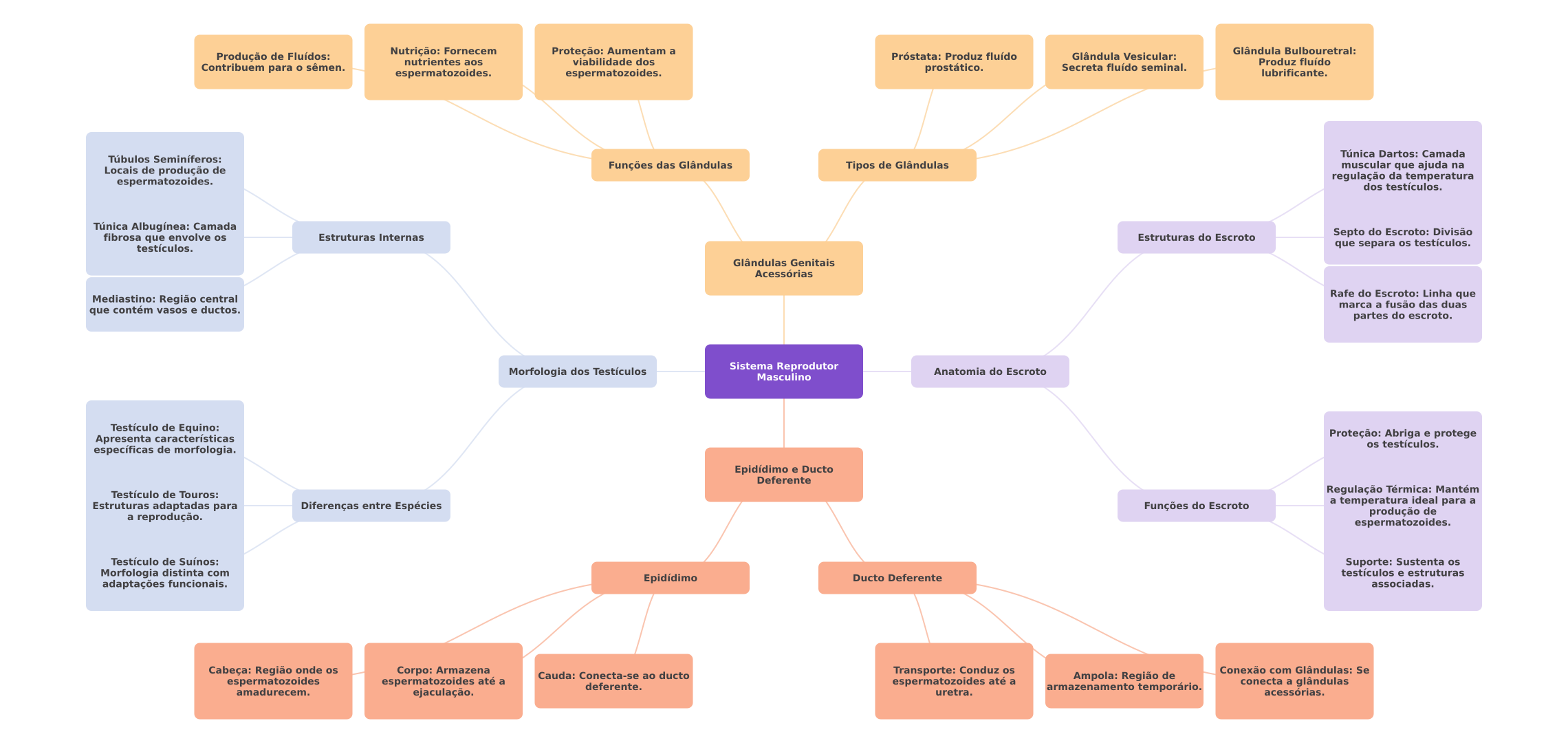 Produção de Fluídos: Nutrição: Fornecem Proteção: Aumentam a Glândula Bulbouretral: Próstata: Produz fluído Glândula Vesicular: nutrientes aos viabilidade dos Produz fluído Contribuem para sêmen. espermatozoides. espermatozoides. prostático. Secreta fluído seminal. lubrificante. Túnica Dartos: Camada Túbulos Seminíferos: Locais de produção de Funções das Glândulas Tipos de Glândulas muscular que ajuda na espermatozoides. regulação da temperatura dos testículos. Túnica Albugínea: Camada Estruturas Internas Estruturas do Escroto Septo do Escroto: Divisão fibrosa que envolve os testículos. que separa os testículos. Glândulas Genitais Acessórias Mediastino: Região central Rafe do Escroto: Linha que marca a fusão das duas que contém vasos e ductos. partes do escroto. Morfologia dos Testículos Sistema Reprodutor Anatomia do Escroto Masculino Testículo de Equino: Apresenta características Proteção: Abriga e protege os testículos. específicas de morfologia. Epidídimo e Ducto Deferente Testículo de Touros: Regulação Térmica: Mantém Estruturas adaptadas para Diferenças entre Espécies Funções do Escroto a temperatura ideal para a produção de a reprodução. espermatozoides. Testículo de Suínos: Suporte: Sustenta os Morfologia distinta com testículos e estruturas Epidídimo Ducto Deferente adaptações funcionais. associadas. Cabeça: Região onde os Corpo: Armazena Cauda: Conecta-se ao ducto Transporte: Conduz os Conexão com Glândulas: Se espermatozoides espermatozoides até a espermatozoides até a Ampola: Região de deferente. conecta a glândulas amadurecem. ejaculação. uretra. armazenamento temporário. acessórias.