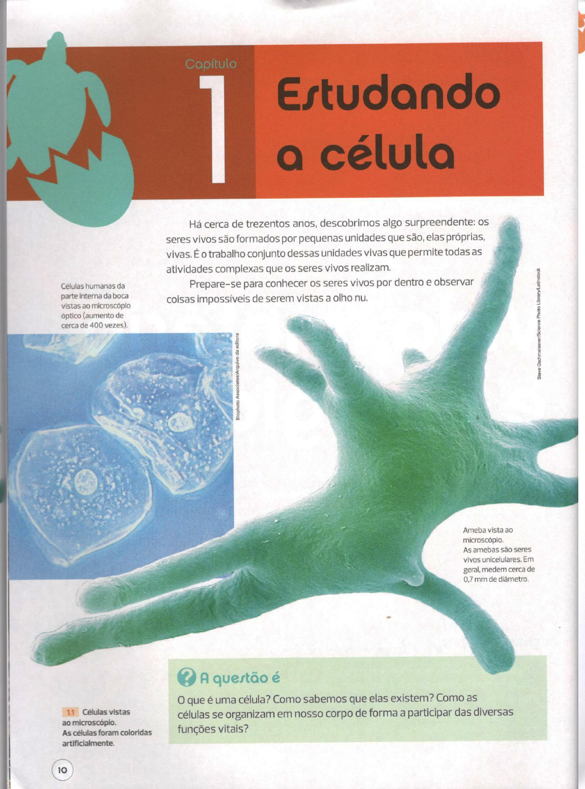 Capítulo 1 Estudando a célula Há cerca de trezentos anos, descobrimos algo surpreendente: os seres vivos são formados por pequenas unidades que são, elas próprias, vivas. É trabalho conjunto dessas unidades vivas que permite todas as atividades complexas que os seres vivos realizam. Células humanas da Prepare-se para conhecer os seres vivos por dentro e observar parte interna da boca coisas impossíveis de serem vistas a olho nu. vistas ao microscópio óptico (aumento de cerca de 400 vezes). Biophoto Associates/Arquivo da editora Steve Gschmeissner/Science Photo Library/Latinstock Ameba vista ao microscópio. As amebas são seres vivos unicelulares. Em geral, medem cerca de 0,7 mm de diâmetro. A questão é que é uma célula? Como sabemos que elas existem? Como as 1.1 Células vistas células se organizam em nosso corpo de forma a participar das diversas ao microscópio. As células foram coloridas funções vitais? artificialmente. 101 Conhecendo célula A Z Pluricelular vem do latim Animais e plantas são formados por muitas células e por isso são chamados pluri, que significa seres pluricelulares. Nosso corpo, por exemplo, é formado por um número muito gran- 'muitos', + celular. de delas: cerca de 65 trilhões. Mas existem também seres formados por uma única Unicelular vem do latim célula: são os chamados seres unicelulares, como a ameba da figura 1.1. e significa 'um', celular. A maioria das células mede menos que a décima parte de um milímetro. Algumas, Célula-ovo é a célula que como a célula-ovo humana, chegam a medir um décimo de milímetro. Não é comum dá origem a todas as células do nosso corpo. encontrar células muito maiores do que isso, mas a ameba representada na figura mede cerca de 0,7 mm. Citologia vem do grego kytos, que significa Como é possível estudar estruturas tão pequenas como as células? Por causa 'célula'; e logos, 'estudo'. do seu tamanho, as células devem ser estudadas por meio de técnicas e instrumentos, como microscópio de luz ou óptico. Esse tipo de microscópio possui várias lentes de Mikros, em grego, significa aumento e assim possibilita a ampliação da imagem da célula. 'pequeno'; e skopeo, Foi com a ajuda do microscópio que os cientistas descobriram a existência da 'examinar'. Óptico vem do célula. Observe na figura 1.2 células de uma planta aquática, a elódea (Egeria densa). grego optikós, 'que tem relação com a Para medir elementos tão pequenos quanto a célula, os cientistas criaram uni- Conheça mais sobre dades de medida menores que milímetro. Uma das mais usadas é micrômetro, microscópio no boxe das que corresponde à milésima parte do milímetro. A maioria das células mede de 10 a páginas 16 e 17. 100 micrômetros (ou de 0,01 a 0,1 símbolo do À medida que progrediam os estudos sobre a célula, descobriu-se que ela se é (mi) alimenta, cresce e realiza as diversas funções que mantêm a vida. A célula passou é uma letra grega que então a ser considerada a menor parte viva de um organismo: a unidade da vida. indica a milionésima parte da unidade a que é A parte da Biologia que estuda a célula é denominada citologia. anexado, e 'm' é símbolo do metro. 1.2 Células vegetais vistas ao Claude Nuridsany & Marie microscópio. As células foram coloridas artificialmente. Photo Células da elódea (Egeria densa) vistas ao microscópio óptico (aumento de cerca de Por dentro da célula 250 vezes). Para uma cidade funcionar corretamente, é necessário que a distribuição de ali- mentos, sistema de transportes, fornecimento de energia, a remoção do lixo, sistema educacional e muitos outros serviços estejam em harmonia. Algo semelhante ocorre com a célula: ela é formada por diversas partes, que funcionam em conjunto e a mantêm viva. Vamos examinar as três principais partes da célula: a membrana plasmática, o citoplasma e núcleo. A função da membrana plasmá- tica (do grego plasma, que significa 'molde') é controlar que entra na célula e que sai dela. Unidade Vida, matéria e energia 11Essa membrana facilita a entrada de substâncias importantes para a célula, como a glicose, um açúcar. É uma estrutura tão fina que não pode ser vista com microscópio óptico. Para vê-la, é preciso usar um aparelho que aumenta ainda mais a imagem: microscópio eletrônico. Nas plantas, a membrana plasmática é envolvida por uma outra estrutura, a parede celular, que é rígida e participa da sustentação da célula. citoplasma é um material gelatinoso formado por água, sais minerais e outras A substâncias. Nele encontram-se as organelas, que realizam diversas funções dentro Z da célula. Nas células das plantas há também o vacúolo, uma cavidade cheia de líquido, Organela vem do grego e os cloroplastos, organelas de cor verde que realizam a fotossíntese. Veja a figura 1.3. e significa 'pequeno (Você vai estudar a fotossíntese no próximo capítulo.) ou 'pequeno No núcleo existem minúsculos fios chamados cromossomos. Mais adiante você verá que há células sem núcleo, com cromossomos no citoplasma. Cada cromosso- mo é formado por uma sequência de genes, que controlam as atividades das células e influenciam nas várias características dos seres vivos, como a altura e a cor dos olhos. Os genes são formados por uma substância química de nome complicado, ácido desoxirribonucleico ou, abreviadamente, DNA. Na língua portuguesa, nome ácido desoxirribonucleico pode ser abreviado por ADN. No Brasil é comum adotar a sigla DNA, que Pode-se dizer que os genes contêm informações, ou instruções, que comandam vem do inglês. as atividades celulares. Assim, podemos dizer que núcleo da célula funciona como um centro de comando. Veja na figura 1.3 esquemas simplificados de uma célula animal e de uma célula vegetal, com algumas organelas em seu interior. Lembre-se de que as células são microscópicas. Não se preocupe com nome das organelas neste momento: você 