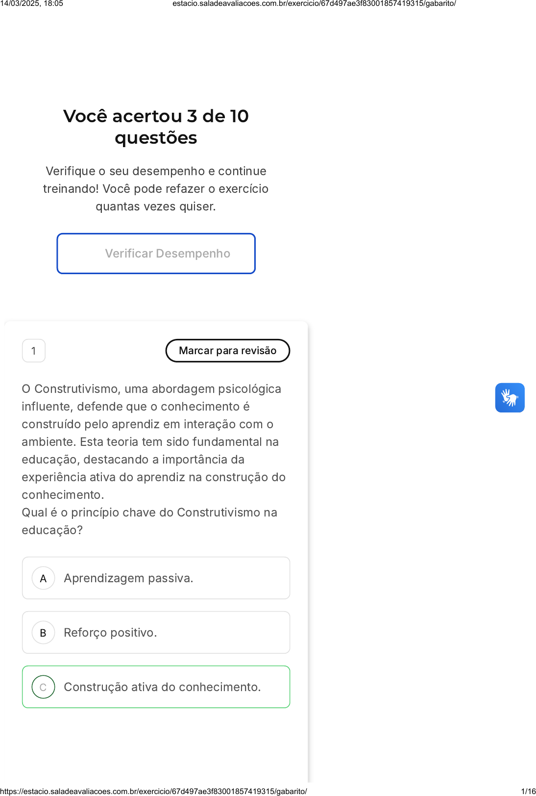 Você acertou 3 de 10 questões Verifique o seu desempenho e continue treinando! Você pode refazer o exercício quantas vezes quiser. Verificar Desempenho A B C 1 Marcar para revisão O Construtivismo, uma abordagem psicológica influente, defende que o conhecimento é construído pelo aprendiz em interação com o ambiente. Esta teoria tem sido fundamental na educação, destacando a importância da experiência ativa do aprendiz na construção do conhecimento. Qual é o princípio chave do Construtivismo na educação? Aprendizagem passiva. Reforço positivo. Construção ativa do conhecimento. 14/03/2025, 18:05 estacio.saladeavaliacoes.com.br/exercicio/67d497ae3f83001857419315/gabarito/ https://estacio.saladeavaliacoes.com.br/exercicio/67d497ae3f83001857419315/gabarito/ 1/16 D E Comportamento observável. Inconsciente. Resposta correta Parabéns, você selecionou a alternativa correta. Confira o gabarito comentado! Gabarito Comentado O Construtivismo se baseia na ideia de que o conhecimento é construído ativamente pelo aprendiz em interação com seu ambiente. Este conceito se diferencia da aprendizagem passiva, reforço positivo, estudo do comportamento observável, ou análise do inconsciente, que são características de outras teorias educacionais ou psicológicas. 2 Marcar para revisão A inteligência emocional é considerada uma competência essencial para o desenvolvimento pessoal e profissional, promovendo habilidades que ajudam o indivíduo a lidar com as próprias emoções e a entender as dos outros. Qual dos itens a seguir é um dos pilares da inteligência emocional, conforme o modelo proposto por Daniel Goleman? 14/03/2025, 18:05 estacio.saladeavaliacoes.com.br/exercicio/67d497ae3f83001857419315/gabarito/ https://estacio.saladeavaliacoes.com.br/exercicio/67d497ae3f83001857419315/gabarito/ 2/16 A B C D E Criatividade espontânea. Empatia. Reflexão contínua. Determinação inabalável. Foco direcionado. Resposta incorreta Opa! A alternativa correta é a letra B. Confira o gabarito comentado! Gabarito Comentado A empatia é um dos pilares da inteligência emocional, permitindo ao indivíduo se colocar no lugar do outro e compreender suas emoções, fundamental para estabelecer relacionamentos saudáveis e promover a colaboração. 3 Marcar para revisão Amanda trabalha em uma startup de tecnologia e recentemente foi promovida a líder de equipe. Durante a última reunião, recebeu feedback dos colegas sobre sua dificuldade em delegar tarefas, concentrando-se em realizar a maior parte do trabalho sozinha. Amanda sente-se sobrecarregada e percebe que a equipe está desmotivada. Diante desse contexto, qual 14/03/2025, 18:05 estacio.saladeavaliacoes.com.br/exercicio/67d497ae3f83001857419315/gabarito/ https://estacio.saladeavaliacoes.com.br/exercicio/67d497ae3f83001857419315/gabarito/ 3/16 A B C D E estratégia ela poderia adotar para equilibrar melhor a carga de trabalho e melhorar a colaboração? Focar em suas habilidades e realizar as tarefas sozinha, mostrando aos colegas como realizar o trabalho corretamente. Delegar tarefas com base nas habilidades individuais dos colegas e oferecer feedbacks regulares sobre seu desempenho. Adotar uma postura autoritária para manter o controle e garantir que as tarefas sejam realizadas conforme suas expectativas. Ignorar o feedback dos colegas e continuar com o método que considera mais eficiente. Solicitar ajuda externa para gerenciar o trabalho e se afastar temporariamente da liderança para reduzir o estresse. Resposta correta Parabéns, você selecionou a alternativa correta. Confira o gabarito comentado! Gabarito Comentado Delegar tarefas de acordo com as habilidades de cada colega e oferecer feedbacks regulares promove um ambiente 14/03/2025, 18:05 estacio.saladeavaliacoes.com.br/exercicio/67d497ae3f83001857419315/gabarito/ https://estacio.saladeavaliacoes.com.br/exercicio/67d497ae3f83001857419315/gabarito/ 4/16 A B C D E colaborativo, incentivando a autonomia e o desenvolvimento da equipe. Essa estratégia também alivia a sobrecarga de Amanda, beneficiando o trabalho em grupo e o desenvolvimento individual. 4 Marcar para revisão A teoria da Gestalt, desenvolvida por psicólogos como Max Wertheimer, enfatiza a percepção do todo como mais significativa do que a soma de suas partes. Esta abordagem revolucionou o entendimento da percepção e da cognição humana, destacando a importância das relações e configurações na psicologia. Qual é o princípio fundamental da Gestalt? Reforço negativo. Percepção do todo. Inconsciente. Condição pré-consciente. Comportamento observável. Resposta correta Parabéns, você selecionou a alternativa correta. Confira o gabarito comentado! 14/03/2025, 18:05 estacio.saladeavaliacoes.com.br/exercicio/67d497ae3f83001857419315/gabarito/ https://estacio.saladeavaliacoes.com.br/exercicio/67d497ae3f83001857419315/gabarito/ 5/16 Gabarito Comentado A Gestalt, como uma escola de pensamento na psicologia, baseia-se no princípio de que a percepção do todo é mais significativa do que simplesmente a soma de suas partes. Este conceito se diferencia do foco em aspectos como reforço negativo, o inconsciente, condições pré-conscientes ou comportamento observável, todos pertencentes a diferentes teorias ou abordagens psicológicas. 5 Marcar para revisão (IBADE/2020 - adaptada) A psicologia do desenvolvimento é responsável pelo estudo do ser humano ao longo de todas as suas fases de vida. Ela estuda como a cognição se desenvolve e como o comportamento muda durante a fase de crescimento. Nesta questão falaremos de seis teorias sobre o desenvolvimento humano: a Gestalt, a Psicanálise, o Behaviorismo, a Psicologia Cognitiva, Piaget e Vygotsky, pois seus pensamentos são fundamentais para explicarmos os avanços que ocorreram na psicologia do desenvolvimento. Assinale a alternativa que apresenta corretamente autor e pensamento. 14/03/2025, 18:05 estacio.saladeavaliacoes.com.br/exercicio