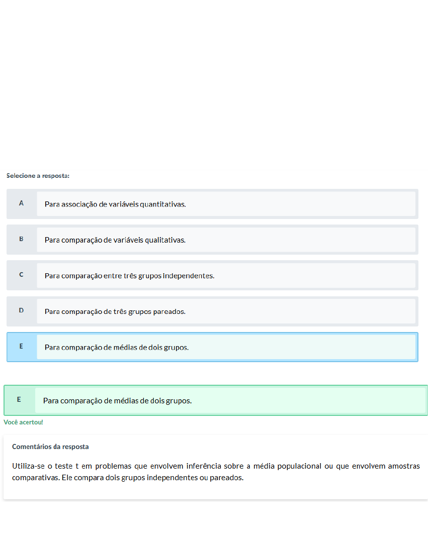 UNIDADE 2 – ATIVIDADE 2 Teste t 1 - Na estatística inferencial, temos diversos testes de hipóteses, tanto paramétricos quanto não paramétricos, de modo que, na prática, é muito importante reconhecer qual é o teste mais adequado. Para que é utilizado o teste t de Student na bioestatística? 2 - Na inferência estatística, existem mais de um tipo de teste t. Qual é o teste t mais adequado para comparar variáveis quantitativas de um grupo em dois momentos — antes e depois, com distribuição normal? 3 - Para escolher adequadamente o teste de hipótese a ser utilizado, é preciso estar atento às exigências requeridas por cada tipo de teste. Quais são as exigências a serem cumpridas para que o teste t possa ser executado sem comprometimento de sua análise? 4 - Um médico quer comparar duas dietas alimentares para diabéticos. Para isso, ele organiza o pareamento por sexo, idade e tempo de diagnóstico. Assim, se, em um grupo, há uma melhora significativa, isso demonstra que a dieta utilizada é menor, pois todos os demais fatores de confusão foram eliminados pelo pareamento. Com base nisso, indique o melhor teste para comparar o nível glicêmico no sangue das pessoas desses dois grupos. 5 - Ao comparar o impacto de uma nova substância sobre os níveis séricos de glicose comparados a uma substância-padrão, diabéticos foram randomizados para receber um dos tratamentos em dois grupos de 100 pacientes. A análise dos resultados revelou que a distribuição nos dois grupos era de normalidade. Para verificar se há diferenças entre as glicemias ao final do estudo, qual teste estatístico seria mais adequado? image7.png image8.png image9.png image10.png image1.png image2.png image3.png image4.png image5.png image6.png